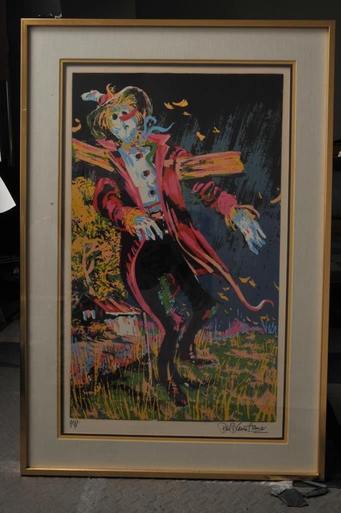 Limited Edition lithograph in modern style signed “Paul Blaine Henry” and “A.P.” (Artist Proof). Titled “Scarecrow” and measures approximately 34” x 20” image only. Excellent and framed. Well known deceased Laguna Beach Lot Title artist. Est.: $150-$300