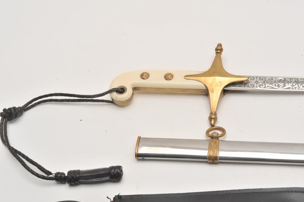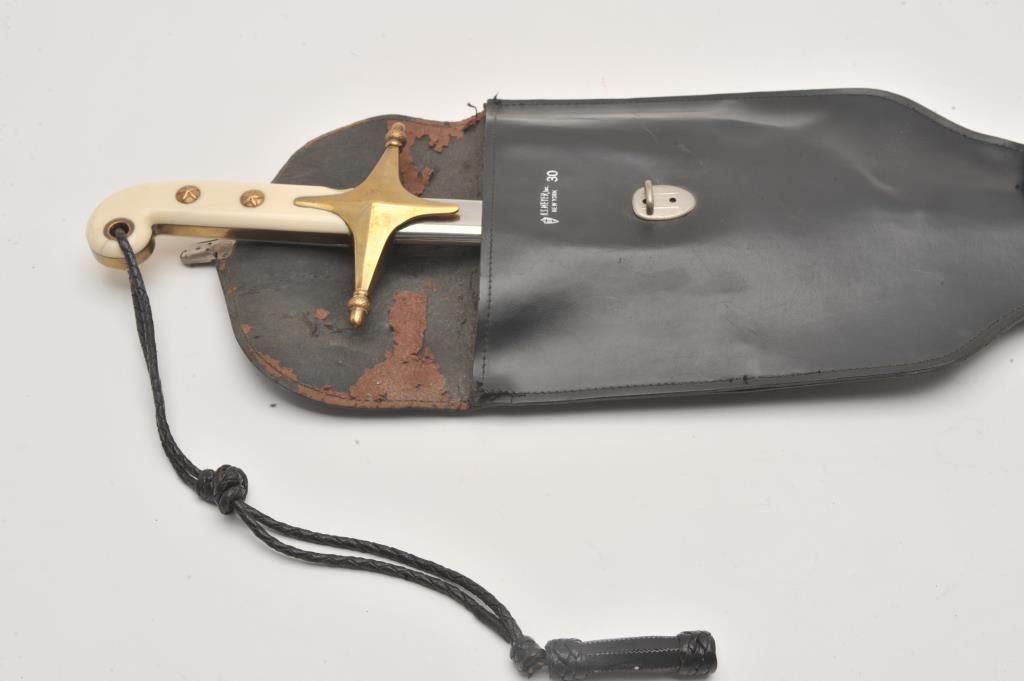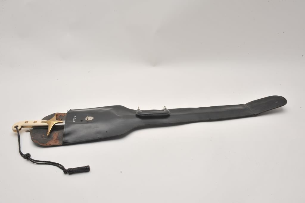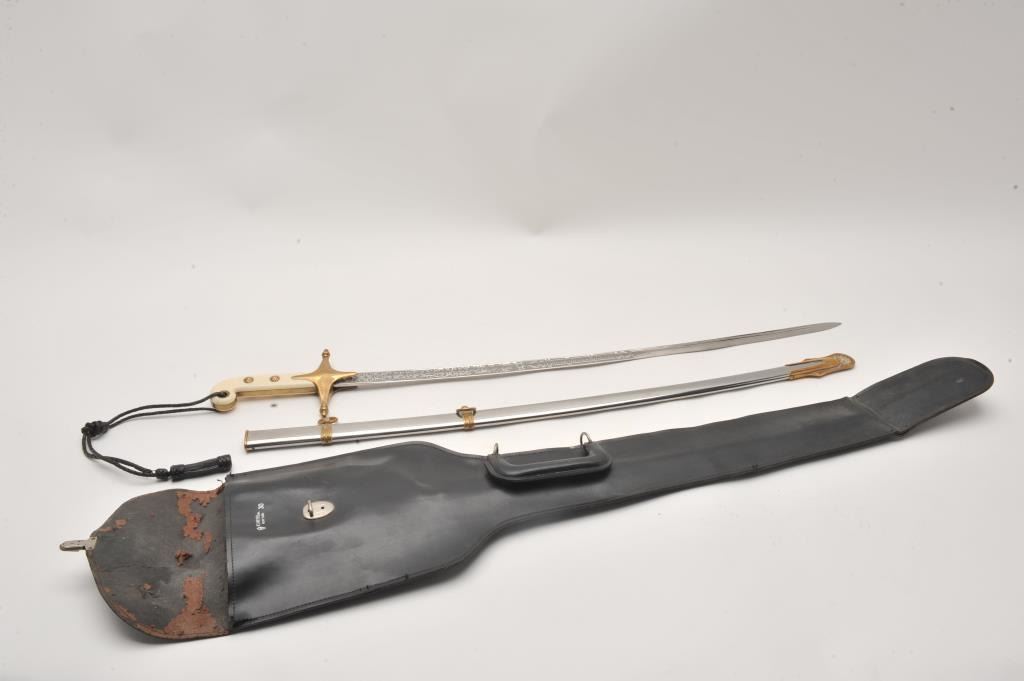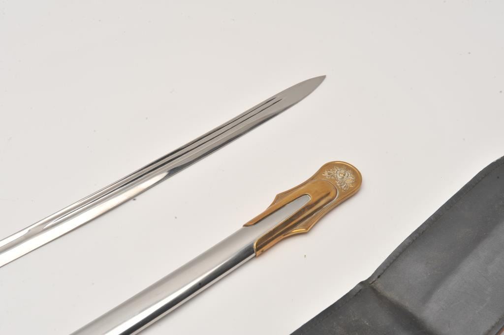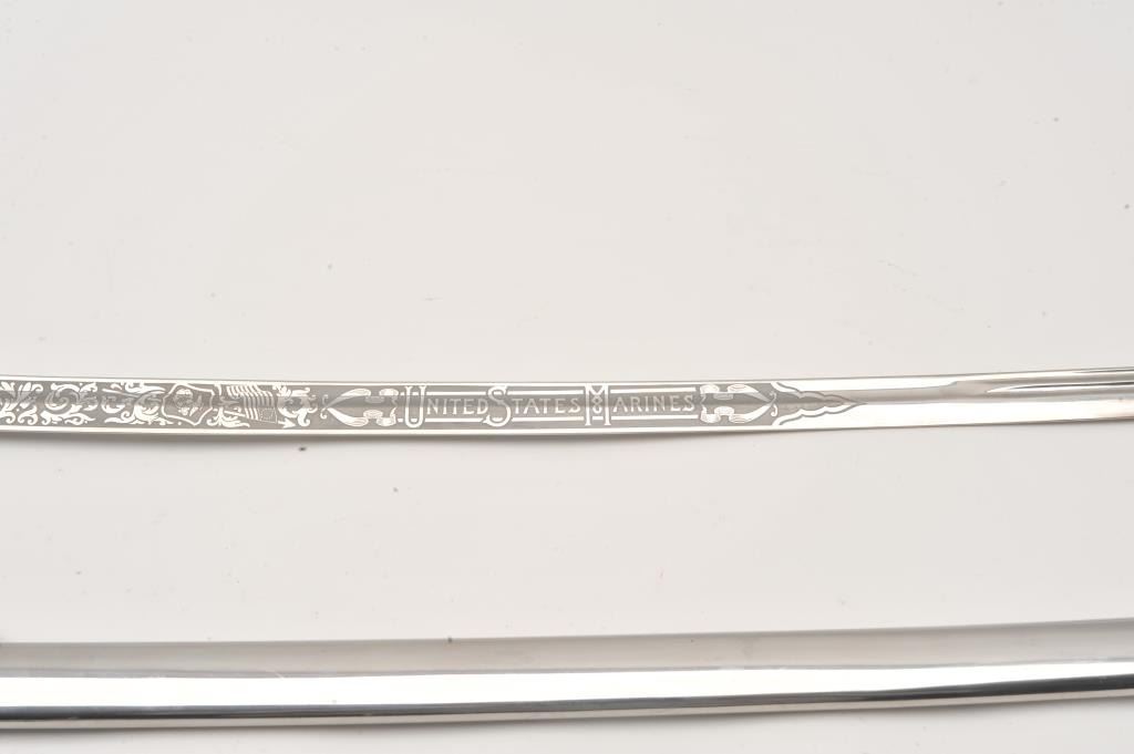 Marine Corps “Marmaluke” style dress sword by N.S. Meyer N.Y. in near fine condition with leather case showing “Charles A Summer II” in etching with leather knot. 1950’s-70s. The case shows matching C.A.S. Est.: $200-$400