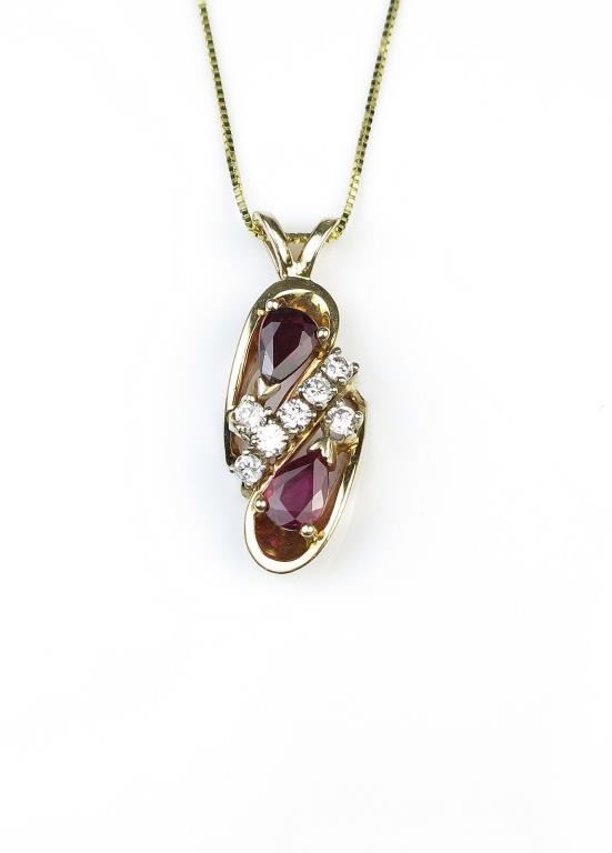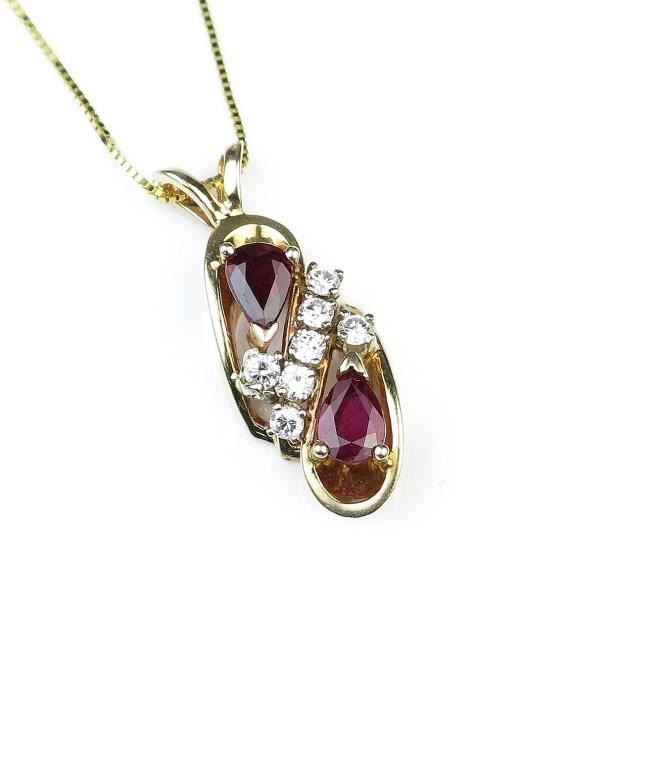 Contemporary Ruby and Diamond pendant with 2 fine pear shaped Rubies weighing approx. 1.20 carats total accented with 7 Diamonds weighing approx. 0.52 carats with F-G colors and VS clarity set in 14 karat yellow gold. Lot Title Retail $2,000-$3,000 Estimate $1,000-$1,500
