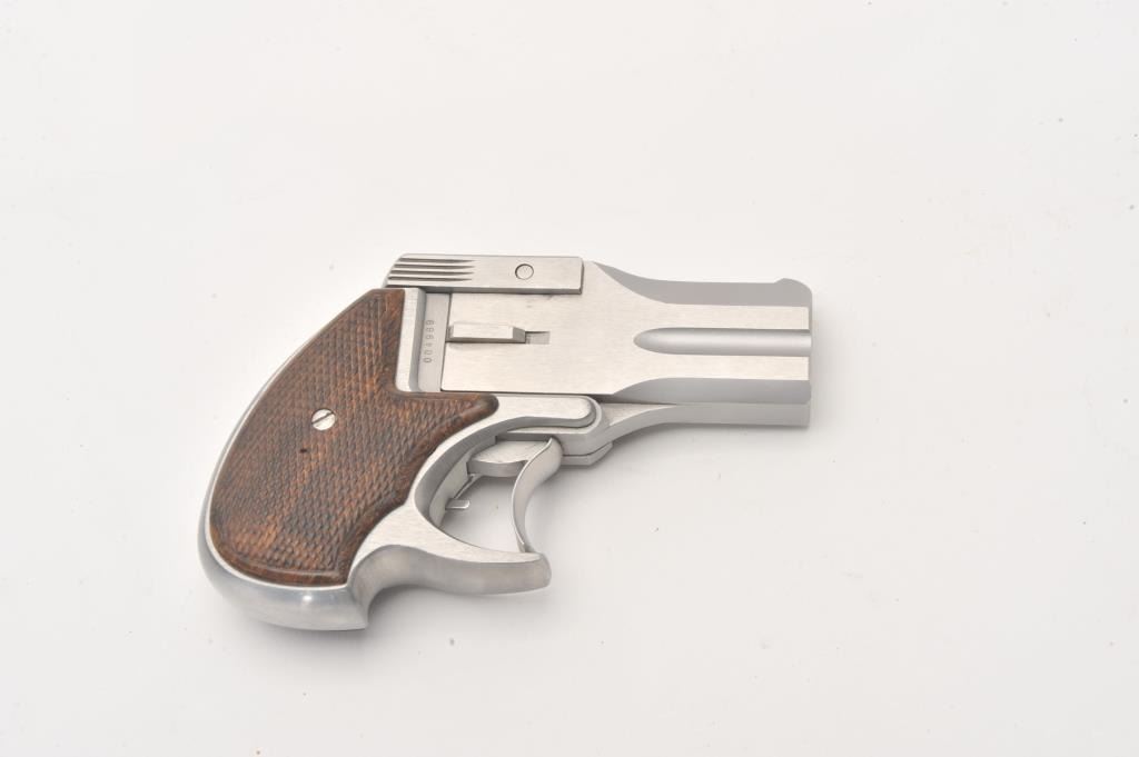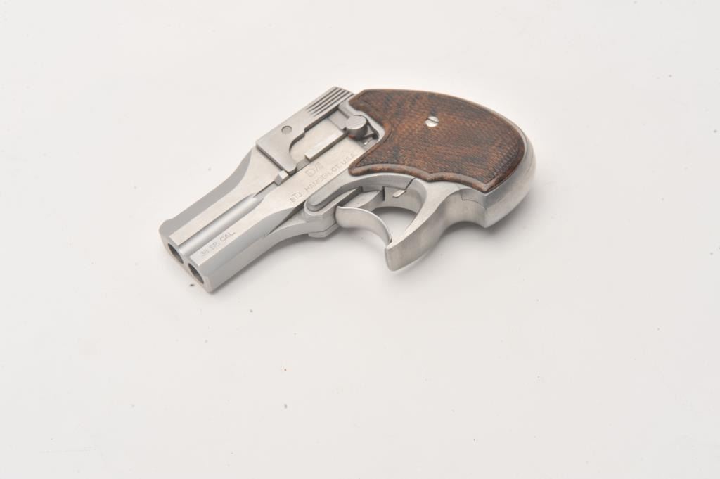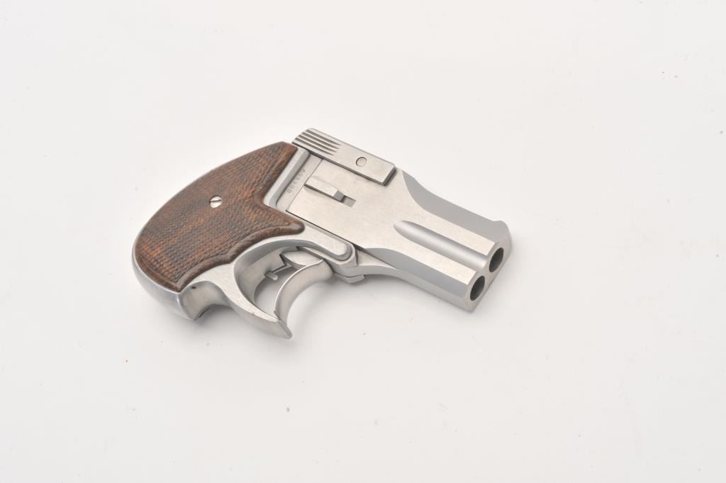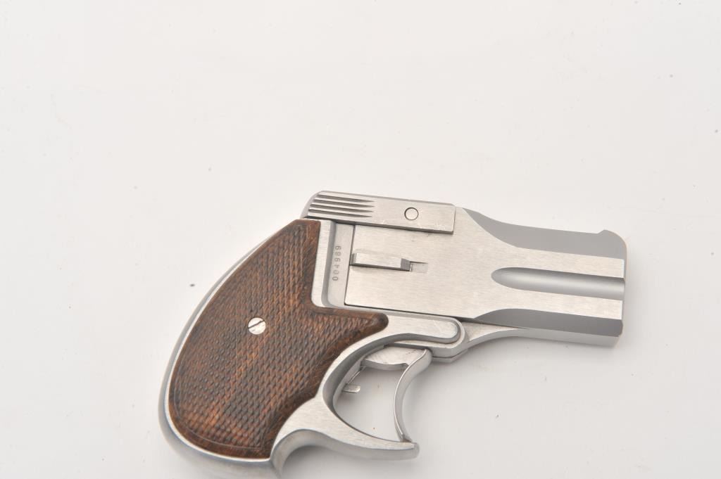 Bellmore Johnson Tool DA O/U Derringer, stainless, #004969, .38 Spl cal., 3" barrels, checkered wood grips. This high quality DA derringer is in fine condition overall. (Modern / PPT) Est. $250-500