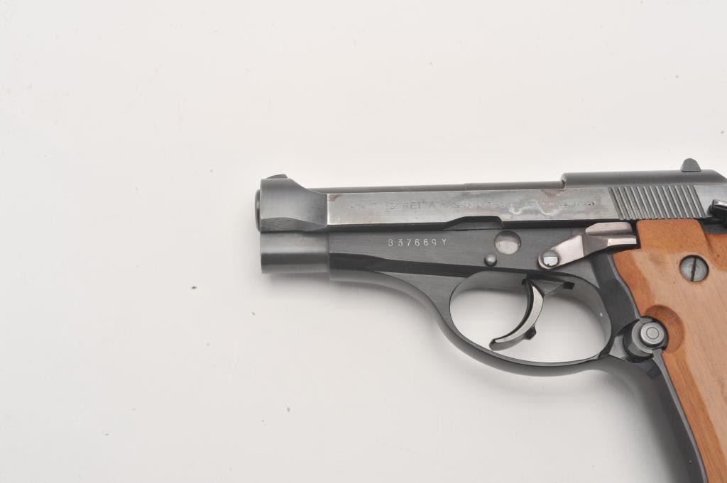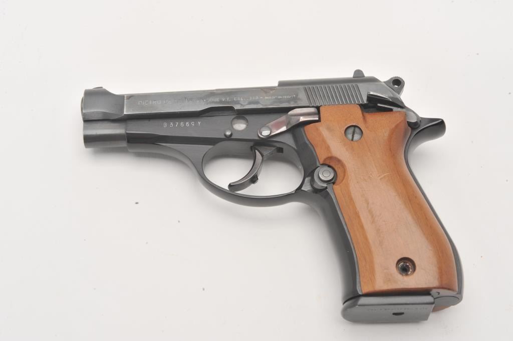 Beretta 84 #B37669Y, .380 ACP cal., 3 3/4" barrel, blued finish, smooth walnut grips. Pistol is in fine condition overall, showing signs of carry with some thinning on the high points. Missing one grips screw. One high Lot Title cap mag not transferable to CA or other prohibited states. (Modern / PPT) Est. $350-700
