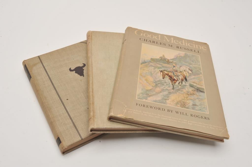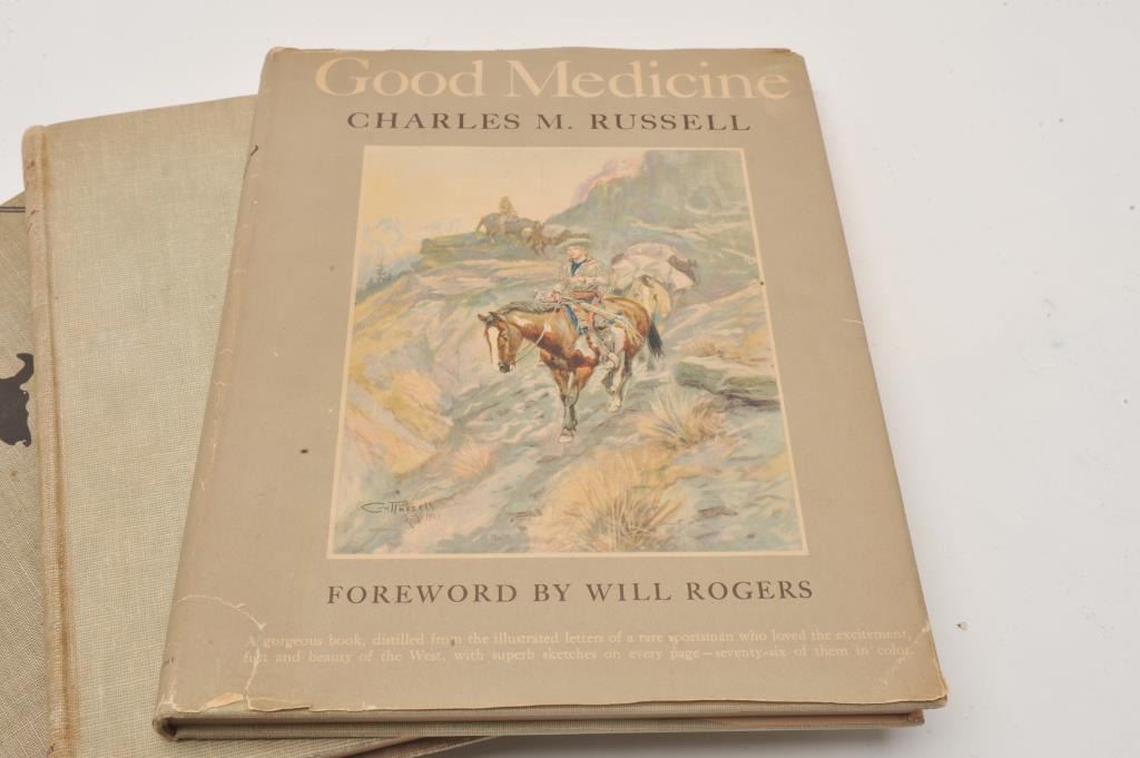 Lot of 3 Charlie Russell books as described: 1. Good Medicine copy right 1930. Good condition. No cover. 2. Good Medicine copyright 1929 with cover. Good plus. Lot Title 3. Good medicine copyright 1930. No cover. Good. Est.: $300-$600