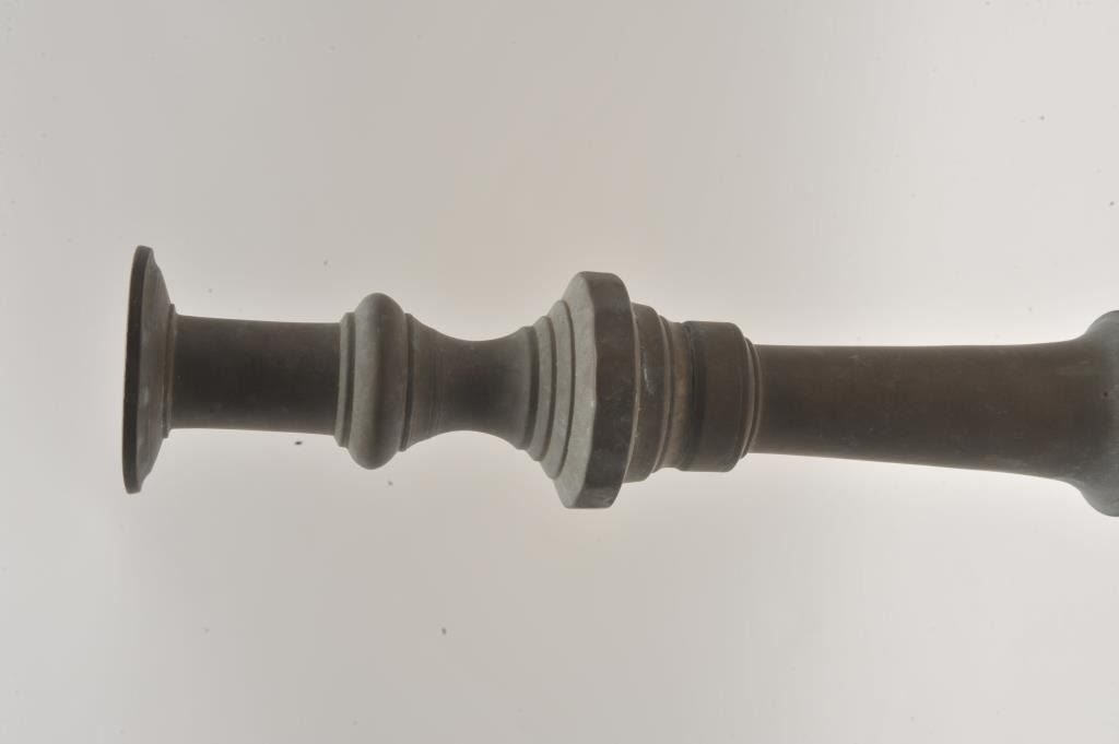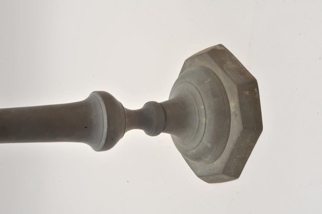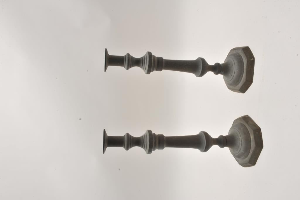 Pair of brass candle holders from 18th to 19th century. Measures 20” tall with deep patina. Est.: $100-$200