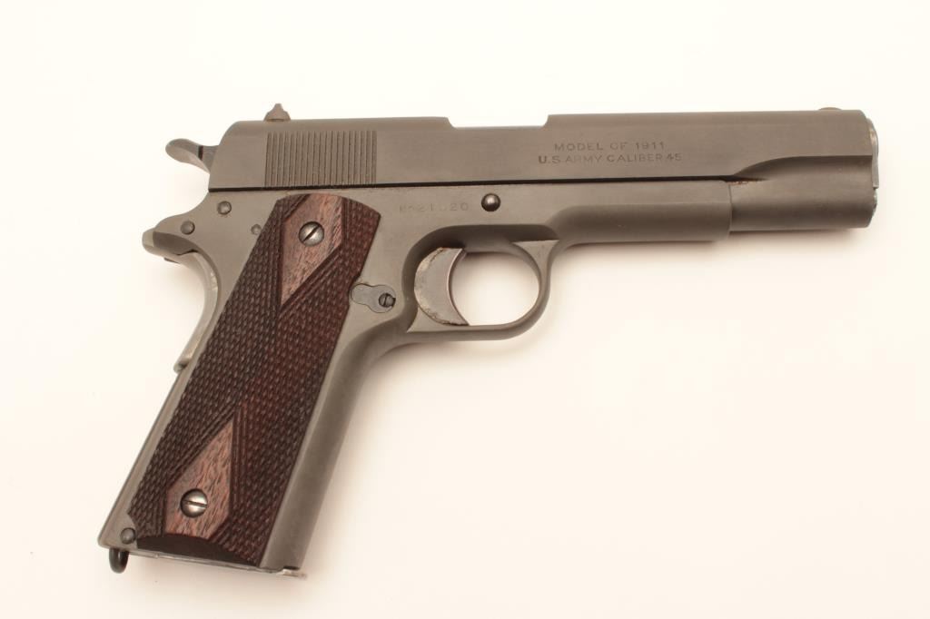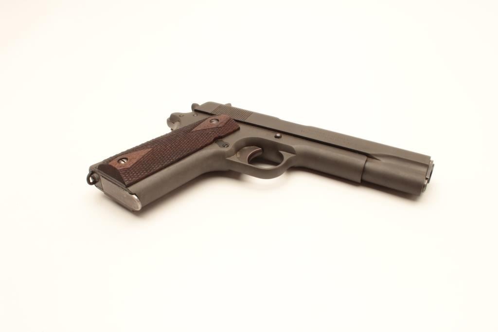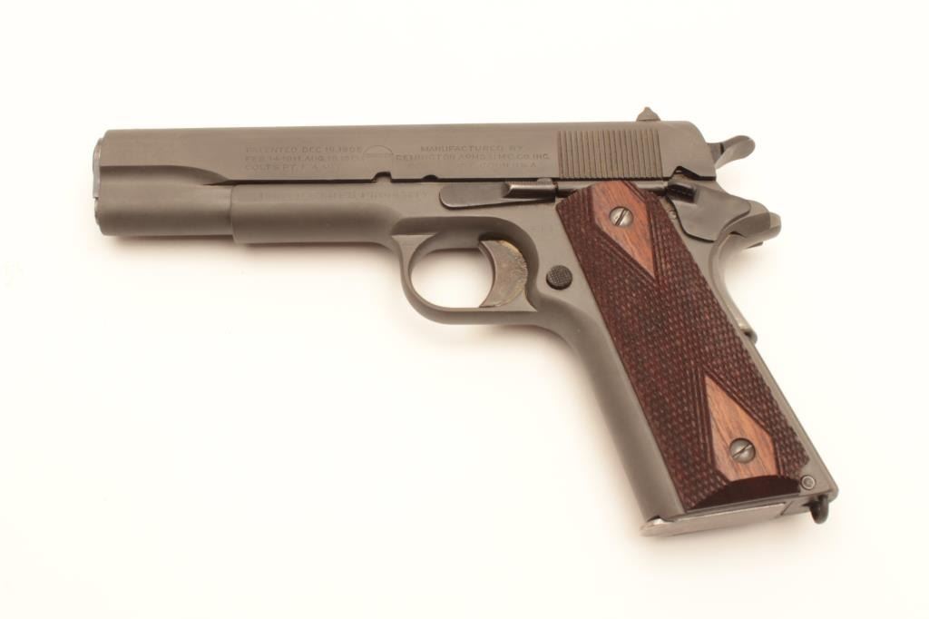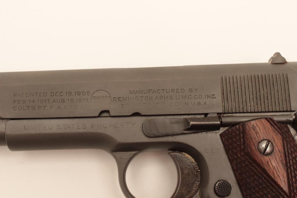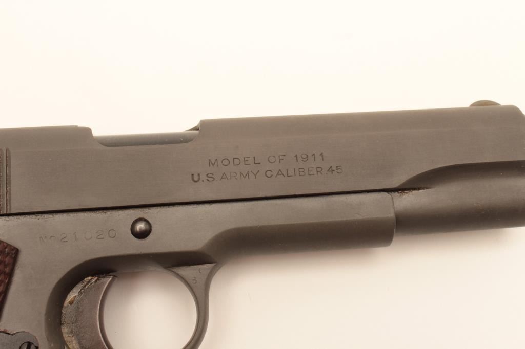 Model 1911 .45 caliber semi-auto pistol by Remington UMC rebuilt and refinished, S/N 21020. This pistol shows good markings and “EEC” inspection on the frame. Blued WWII era barrel and small parts. Remainder 1911 Lot Title including grips. Two tone blued 1911 19/16” UMC mag is included. Excellent as rebuilt with light gray parkerization. Modern Kraft style box included. Excellent bore and shows little use since rebuild. (C&R/PPT) Est.: Lot Title $2000-$4000