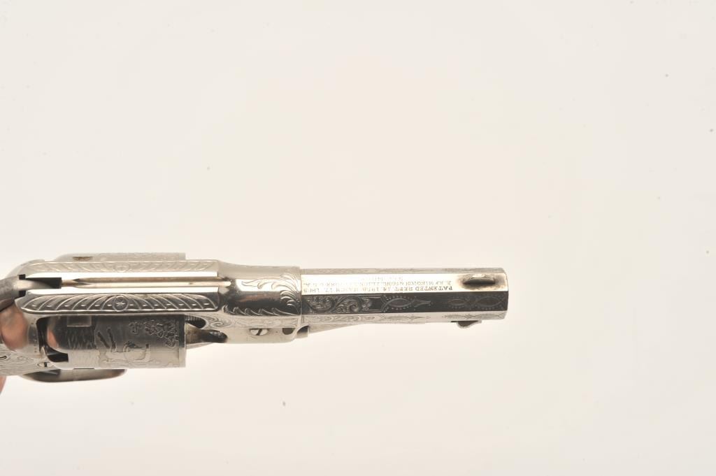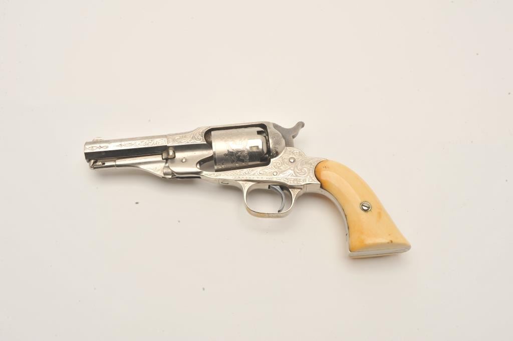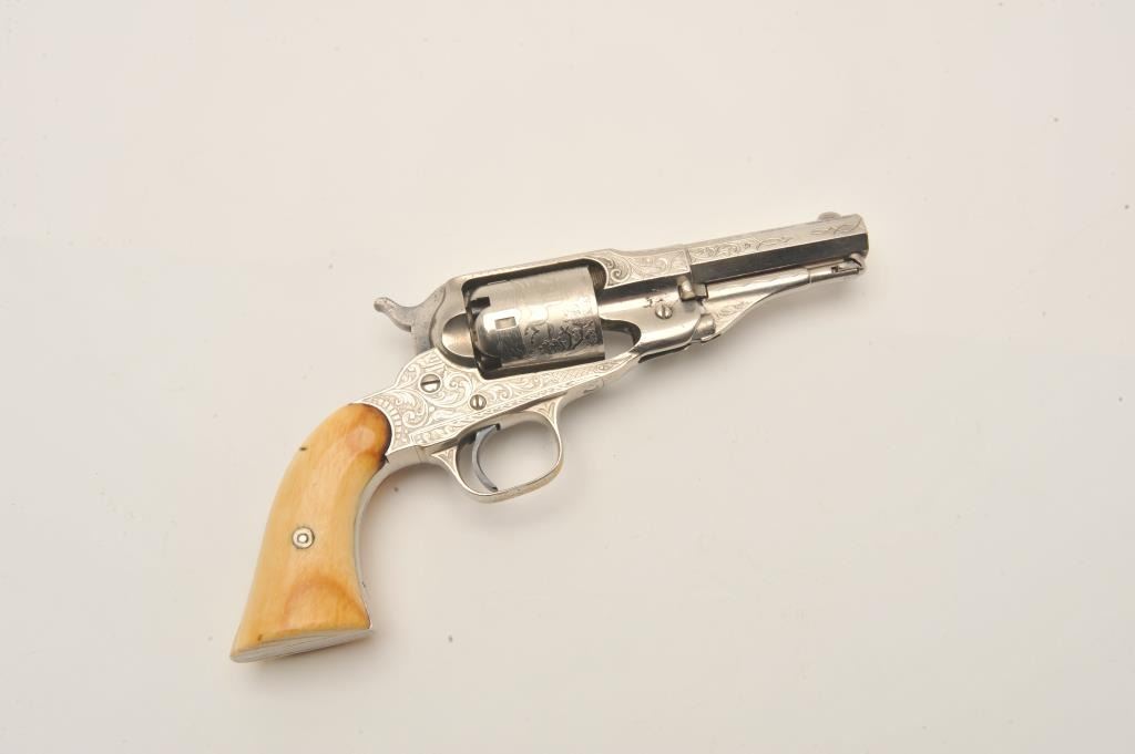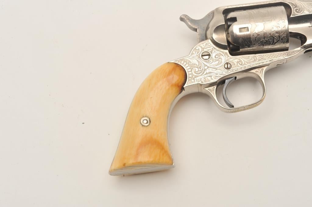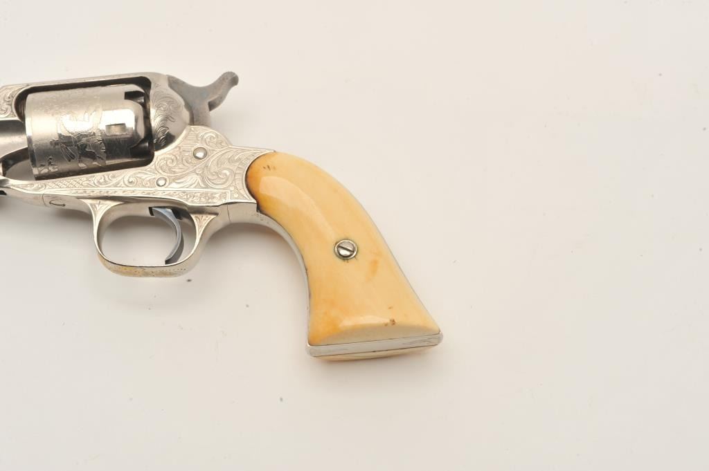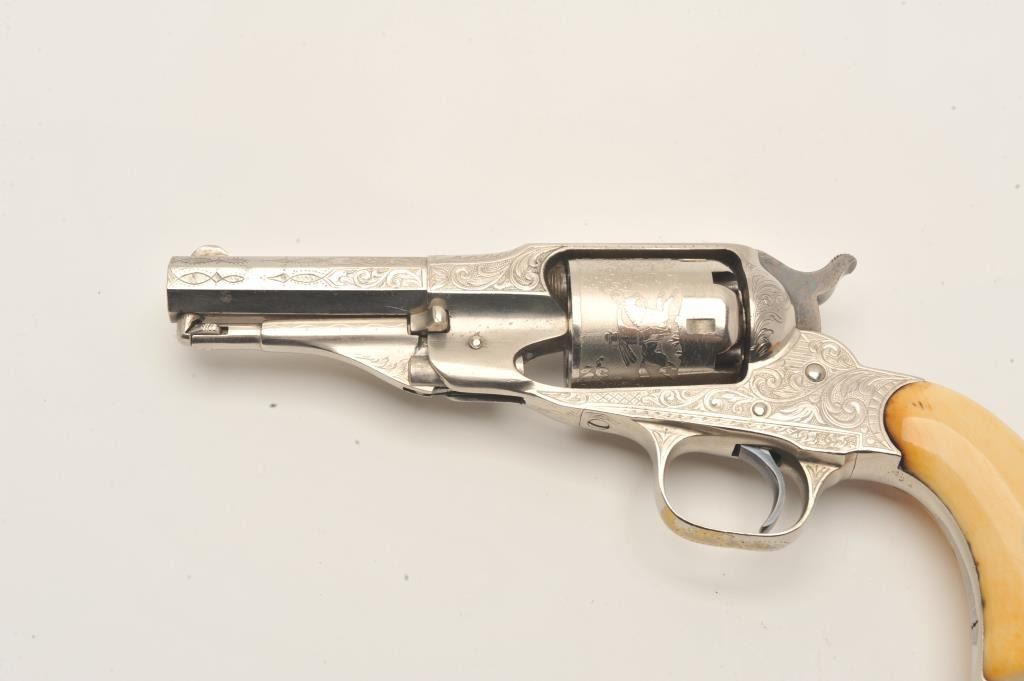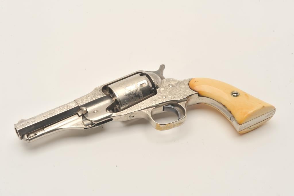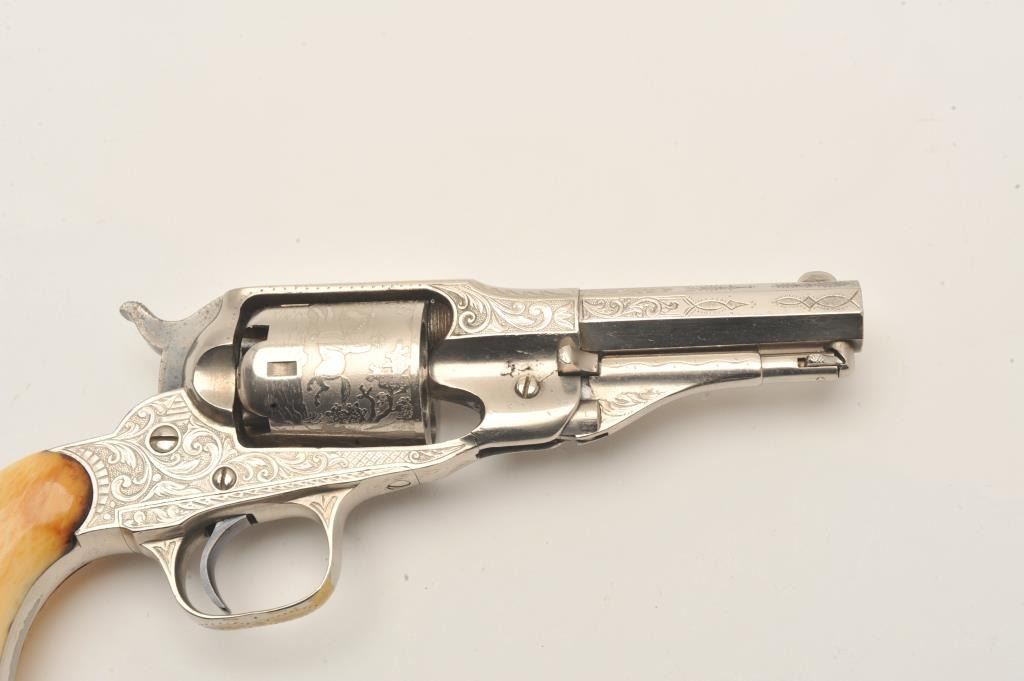 Remington New Model Police revolver in .36 caliber percussion with a 3 ½” octagon barrel, S/N 6224. Factory engraved with desirable highway man etched cylinder scenes. The pistol remains in fine condition with Lot Title 95%-98% original dulling and slightly aged nickel finish. 70% plus case hardening on the hammer and bright blue on the trigger. Very good original ivory grips with yellowish patina with small losses, minor cracks and Lot Title just normal aging. Crisp address and sharp edges. Few known with deluxe factory etched cylinders. The Doug Drummond collection. (Antique) Est.: $2500-$5000