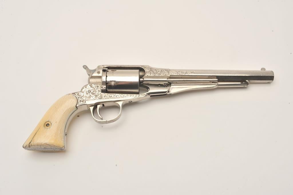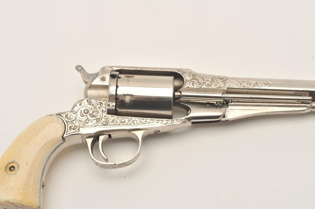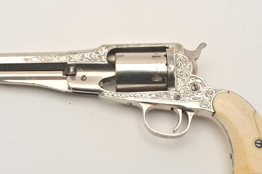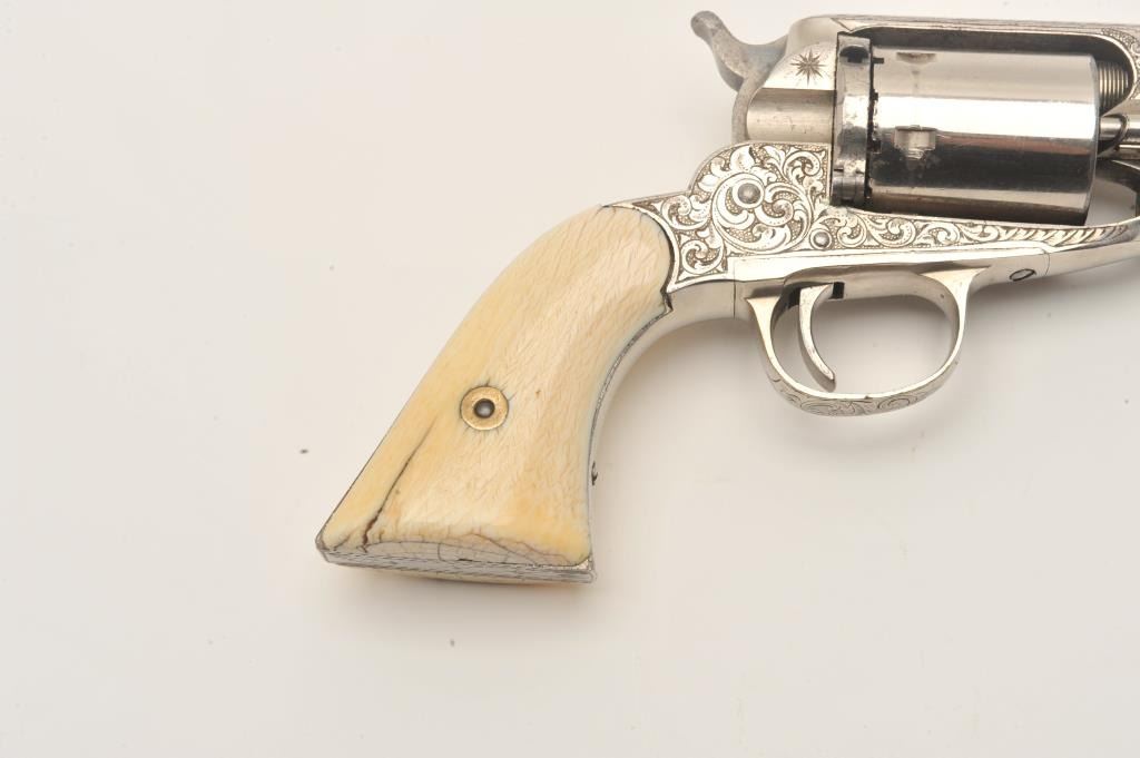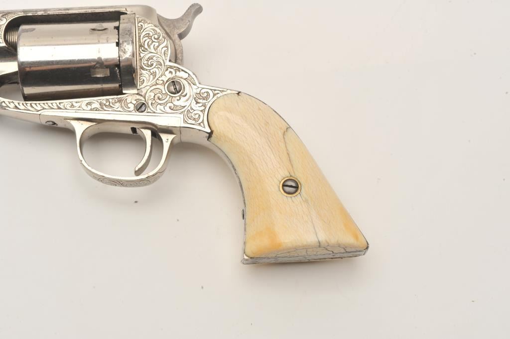 Remington New Model Navy revolver converted to .38 Long rim fire with New York style scroll engraving, ivory grips and nickel plated, S/N 1341. 85%-95% original period nickel with minor losses and scratches. The Lot Title grips are good with cracks, aging and toning along with small losses at the toe. The action is tight and the interior shows little use with a bright bore. The cylinder was never engraved and this indicates a Lot Title percussion gun returned for factory conversion. The interior shows special order dept. marks. Formerly “Slim” Kohler collection and illustrated pages 99 and 108 “The guns of Remington” by Madaus. The Doug Lot Title Drummond collection. (Antique) Est.: $3000-$6000