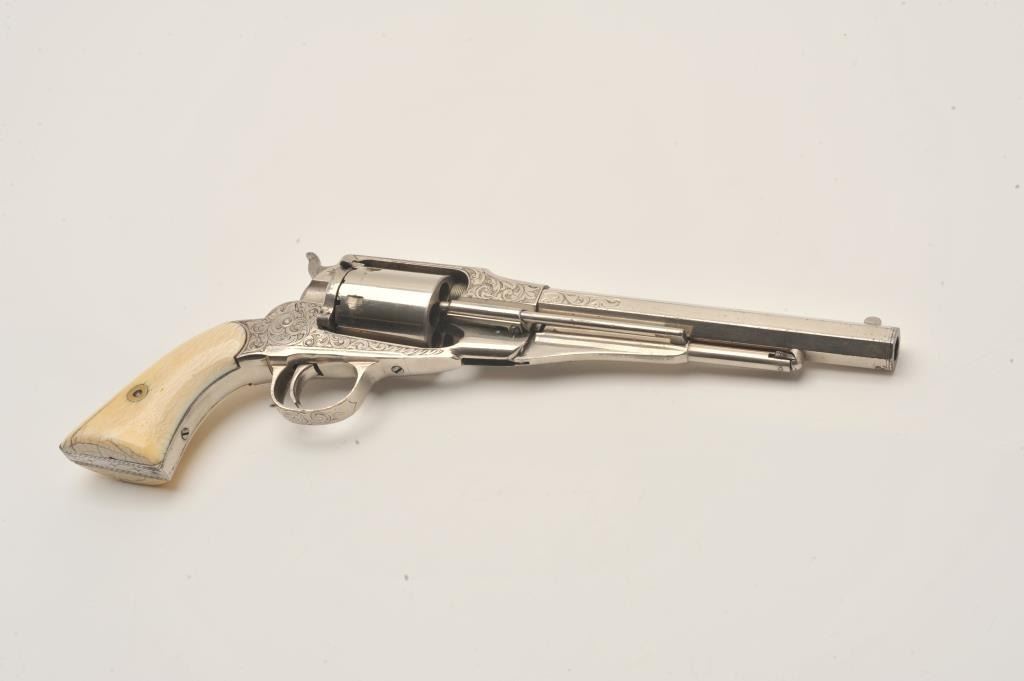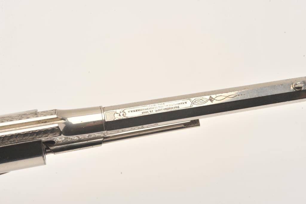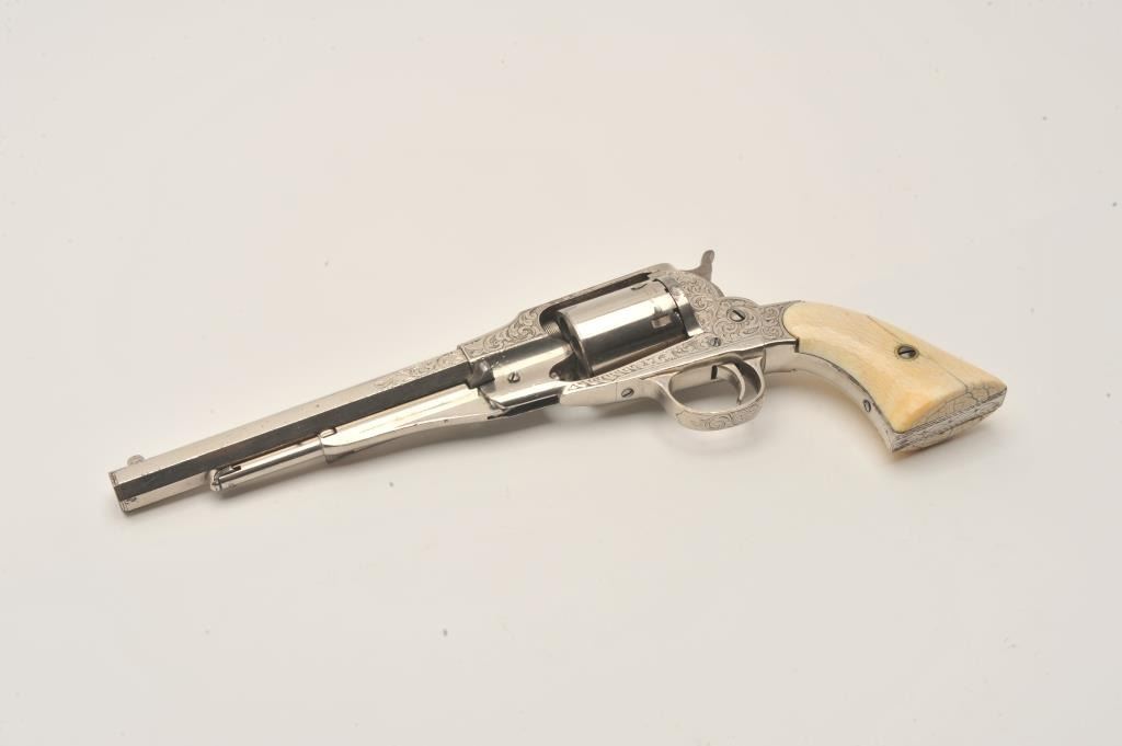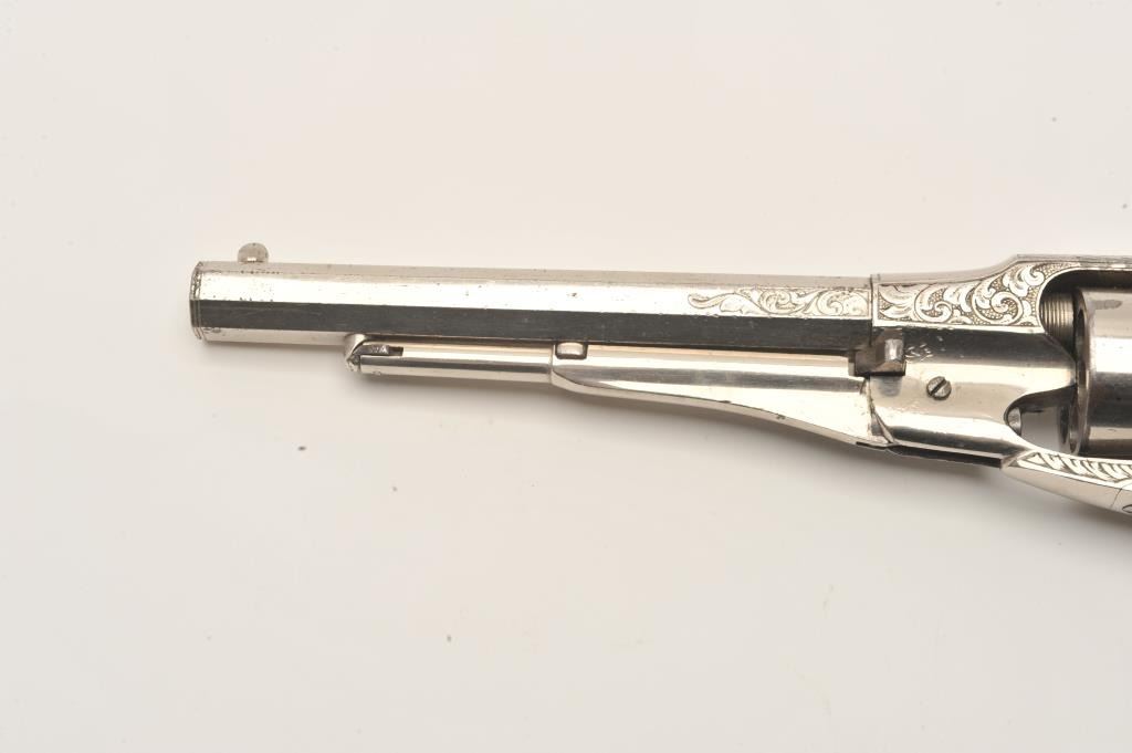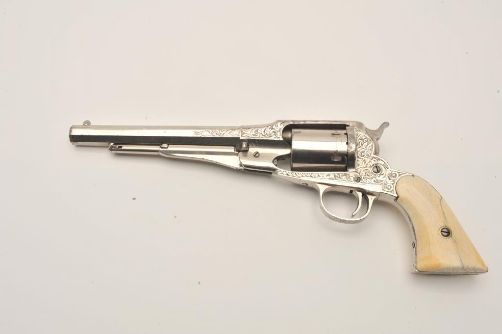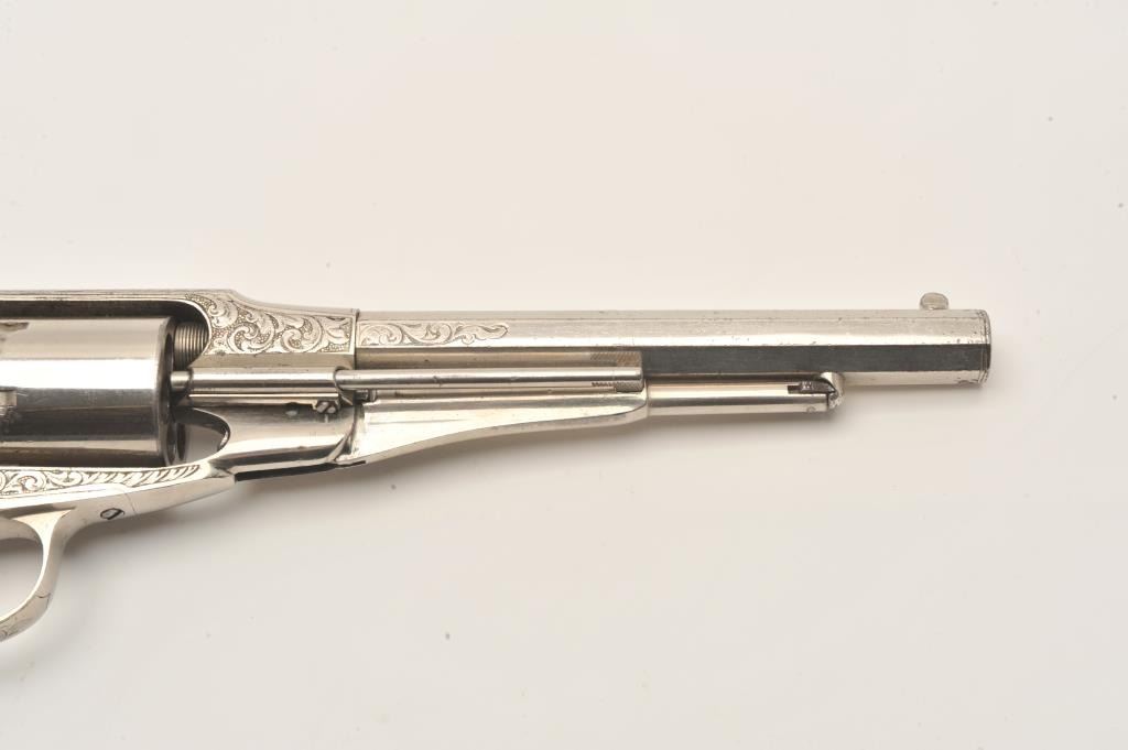 Remington New Model Navy revolver converted to .38 Long rim fire with New York style scroll engraving, ivory grips and nickel plated, S/N 1341. 85%-95% original period nickel with minor losses and scratches. The Lot Title grips are good with cracks, aging and toning along with small losses at the toe. The action is tight and the interior shows little use with a bright bore. The cylinder was never engraved and this indicates a Lot Title percussion gun returned for factory conversion. The interior shows special order dept. marks. Formerly “Slim” Kohler collection and illustrated pages 99 and 108 “The guns of Remington” by Madaus. The Doug Lot Title Drummond collection. (Antique) Est.: $3000-$6000