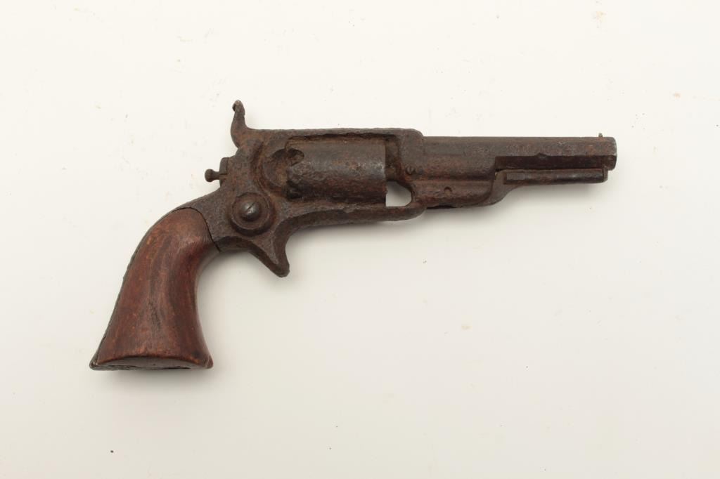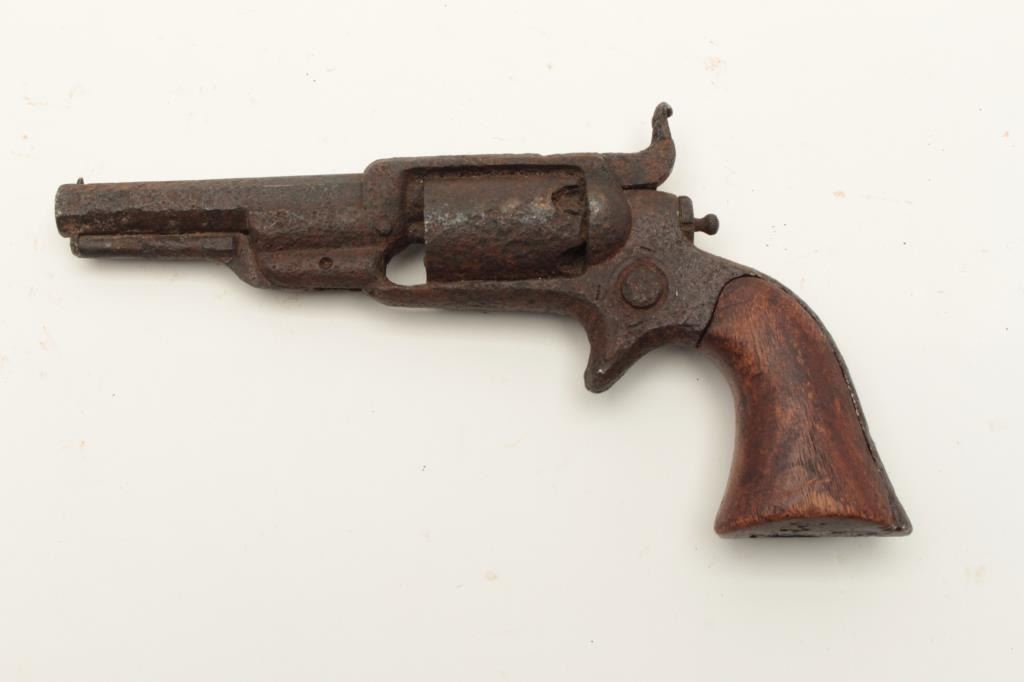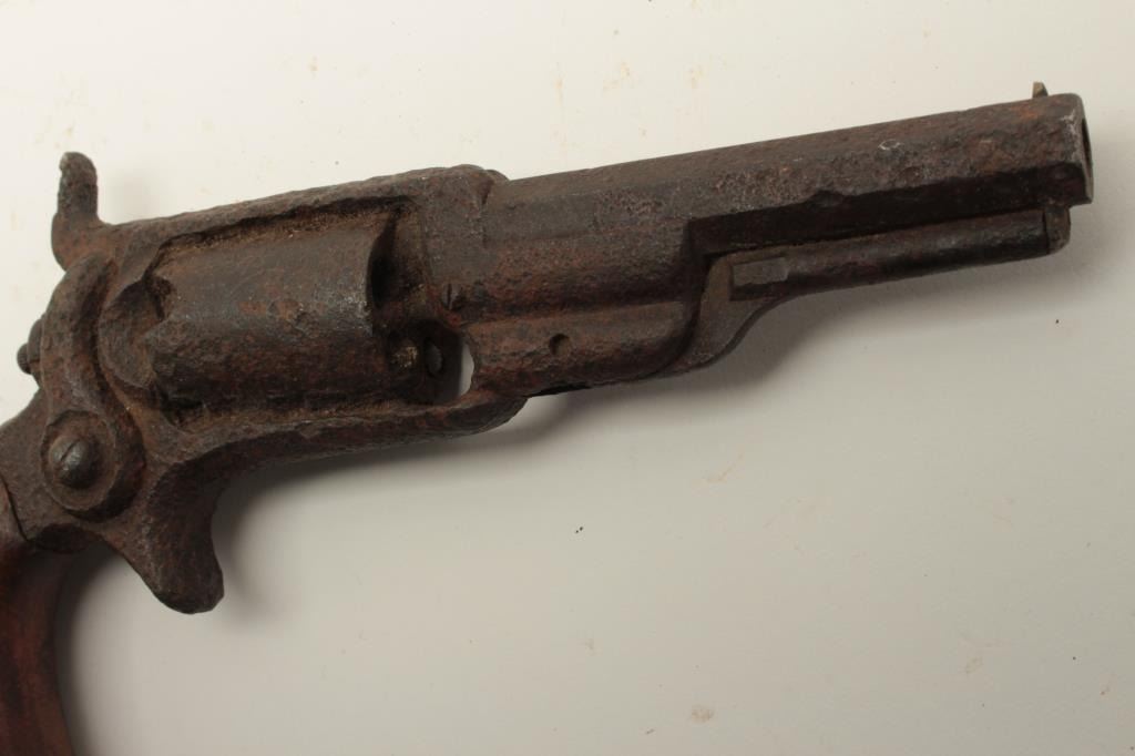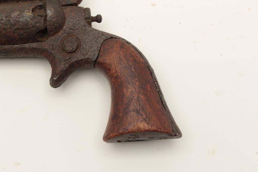 Rusty relic Colt Root Model spur trigger revolver, wood grips, heavily rusted; 3 visible chambers of cylinder loaded! From the collection of John O. Beckwith. Est.: $250-$500.