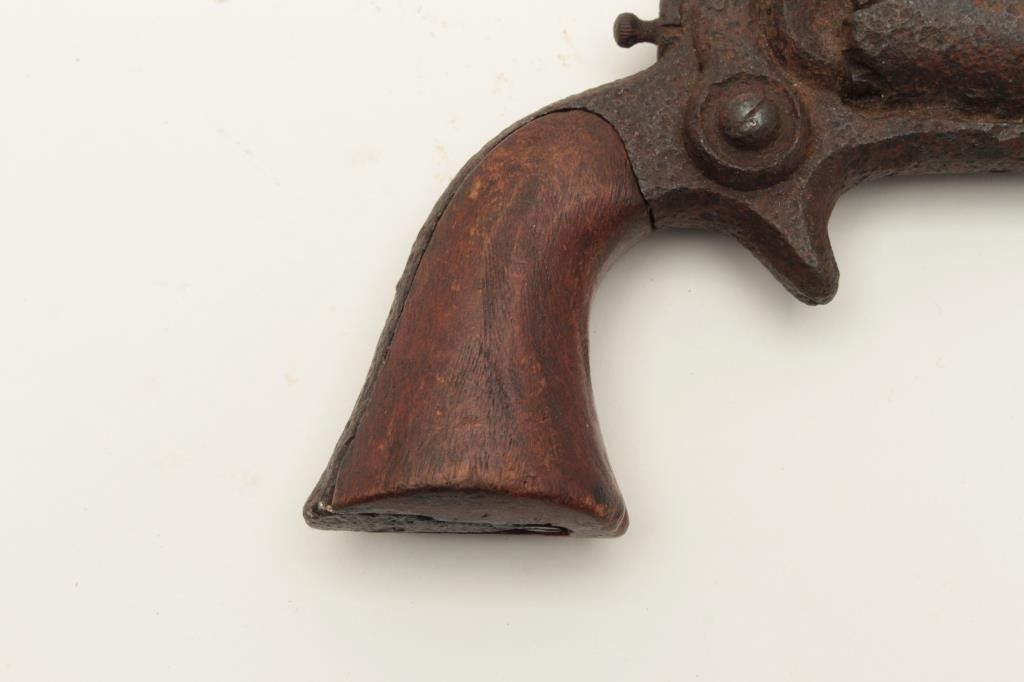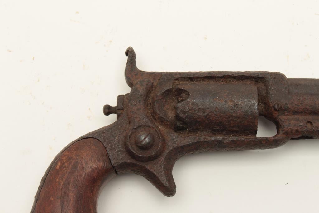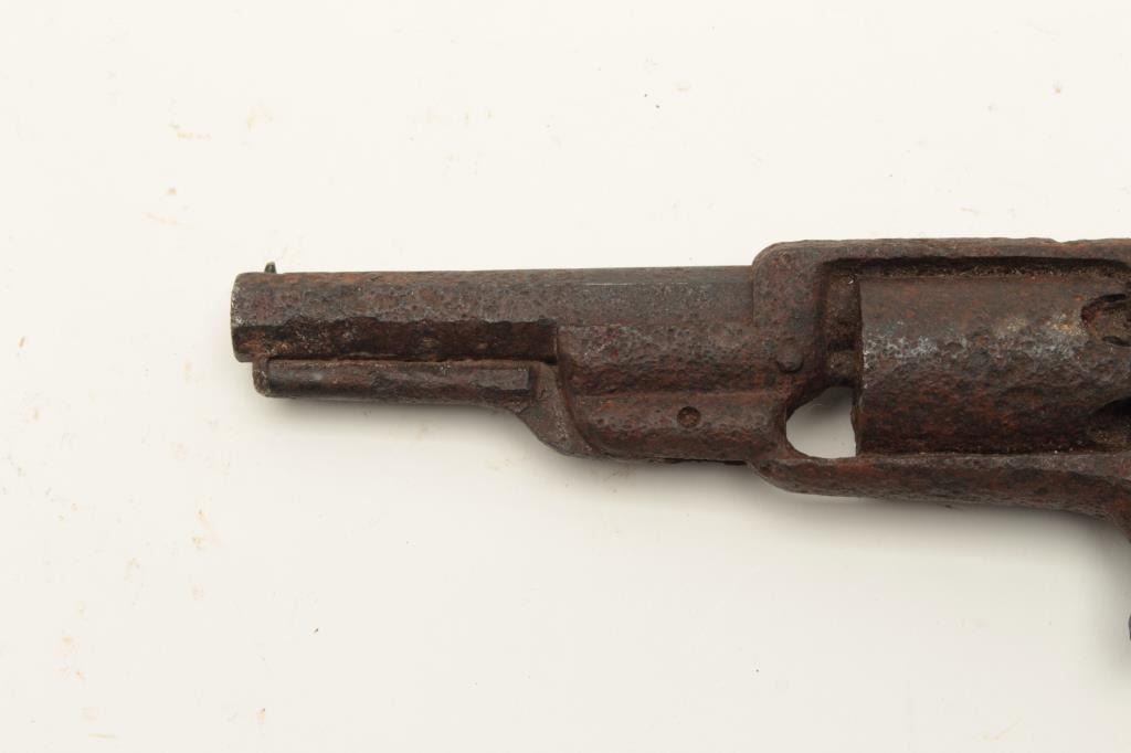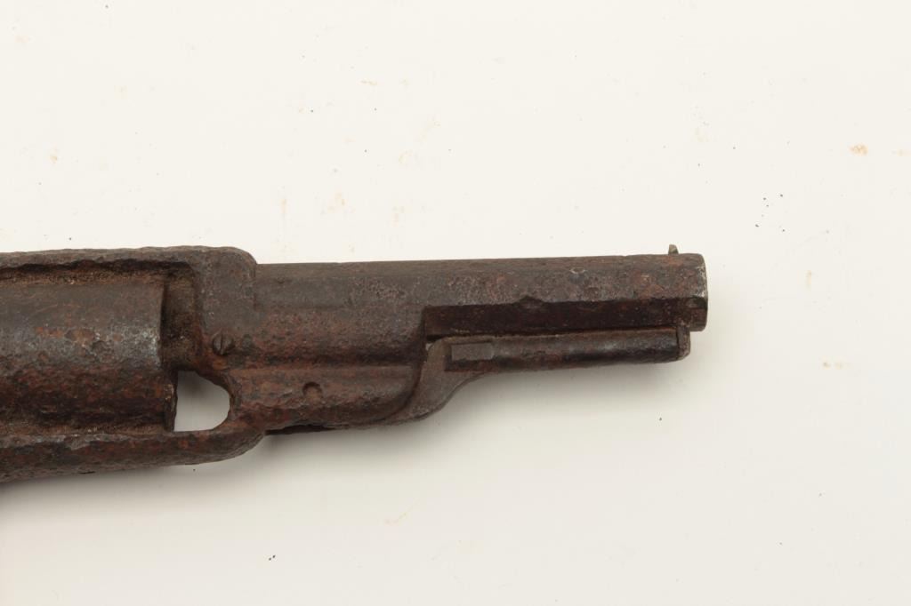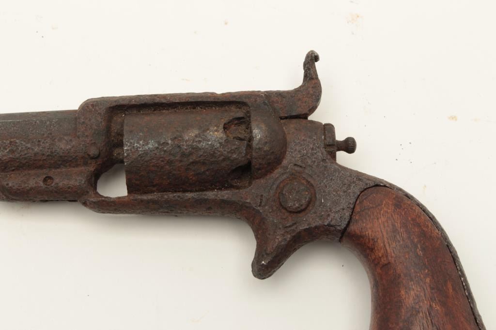 Rusty relic Colt Root Model spur trigger revolver, wood grips, heavily rusted; 3 visible chambers of cylinder loaded! From the collection of John O. Beckwith. Est.: $250-$500.