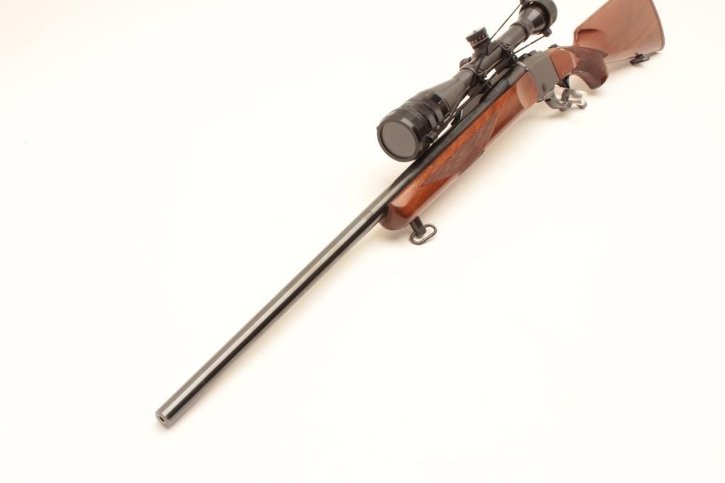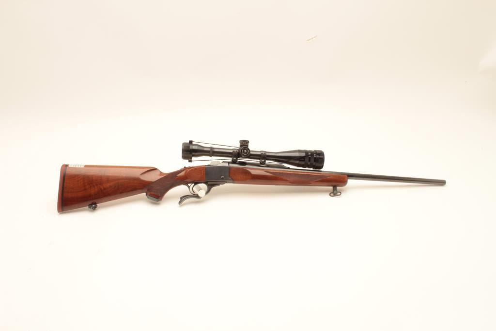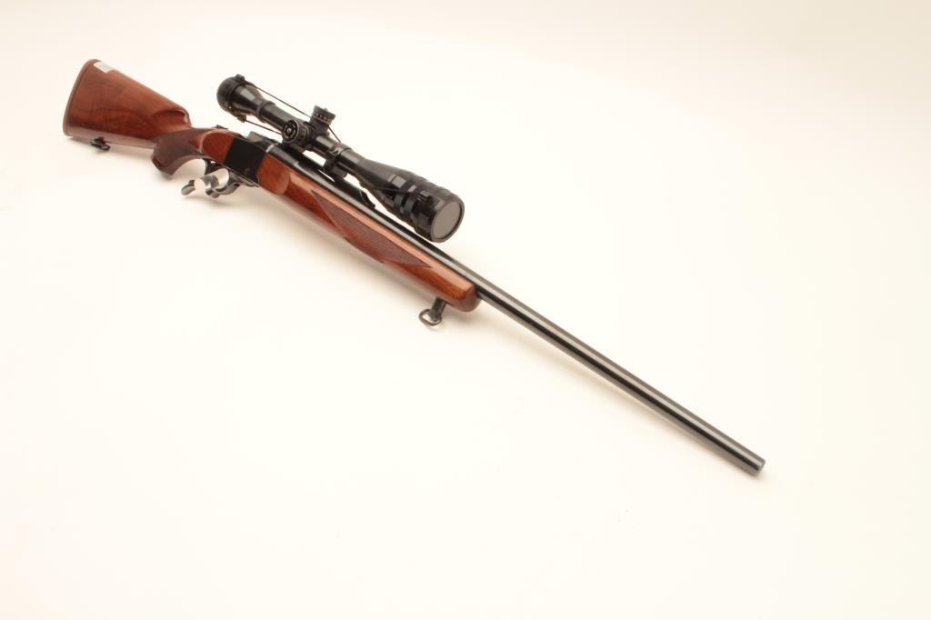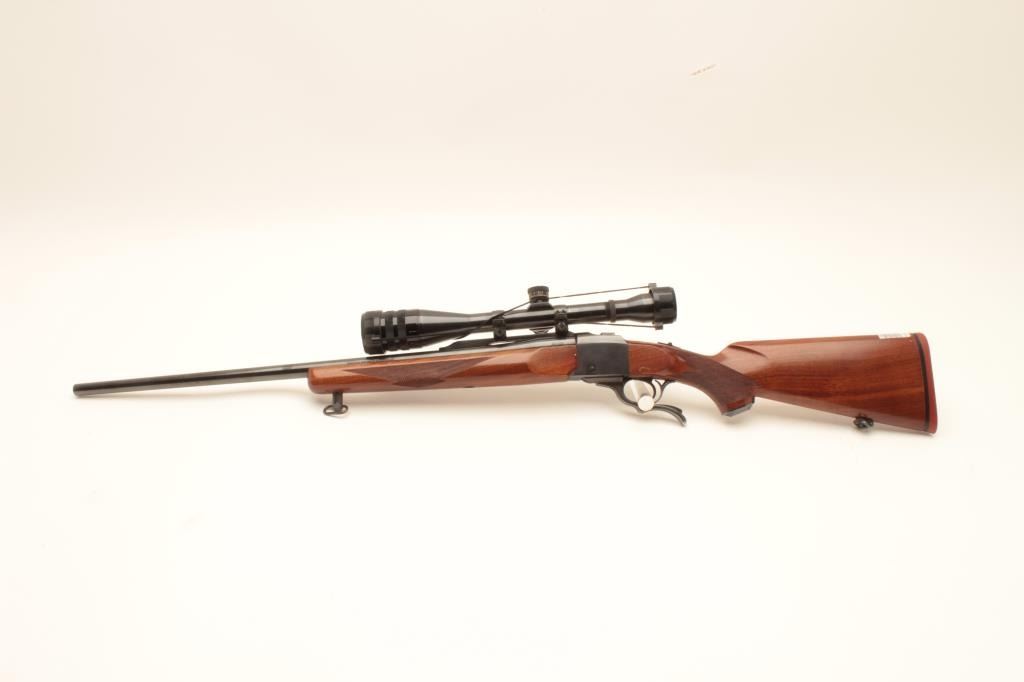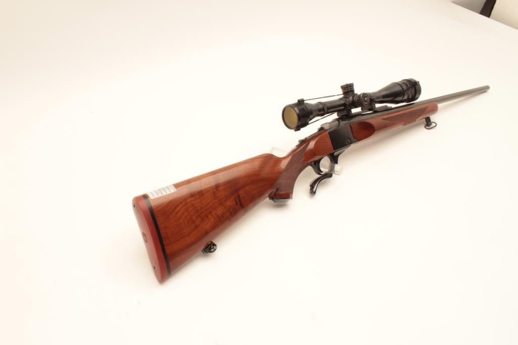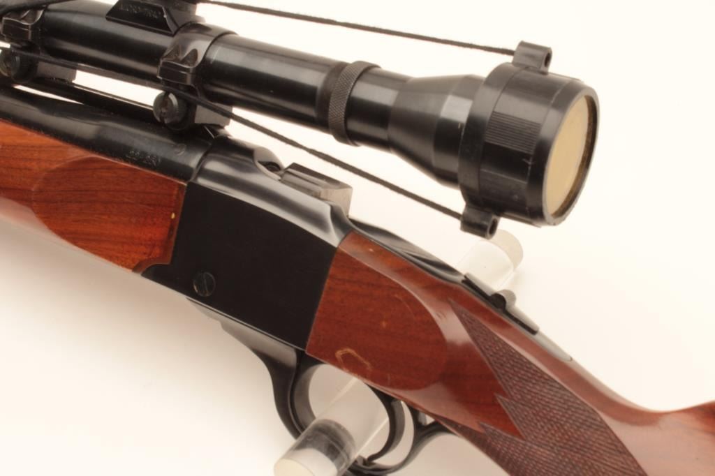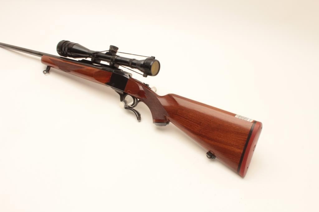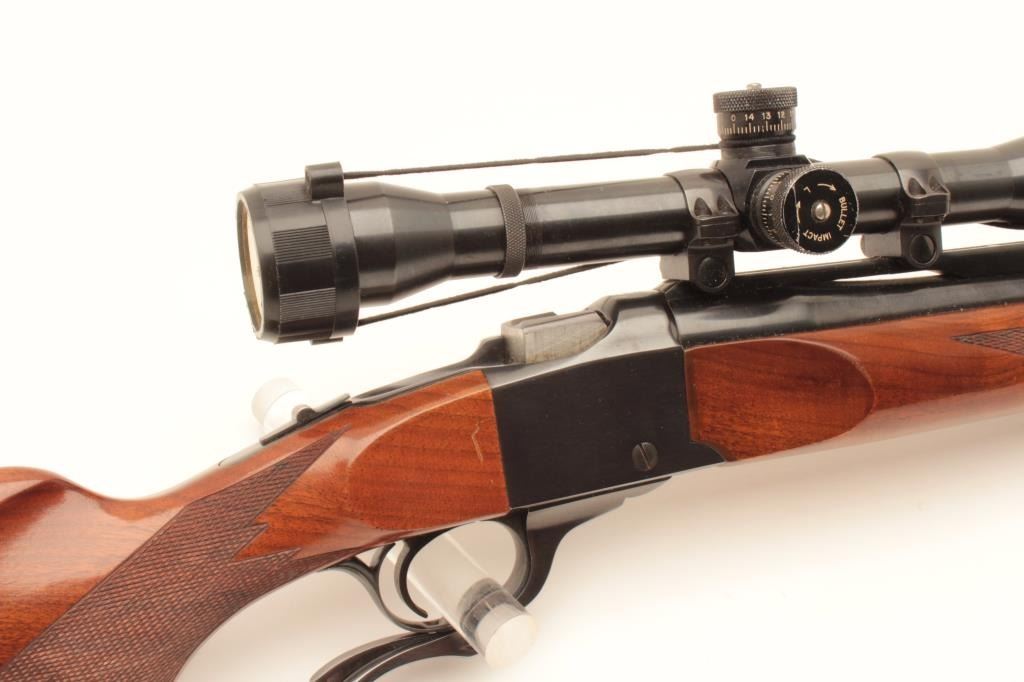 Ruger No. 1 single shot rifle, .22-250 caliber, (manufactured 1976), 26” barrel, blued finish, checkered wood stocks, S/N 130-26556, mounted with a Weaver T-10 scope displaying good optics; the gun is in overall Lot Title very good + condition with a very good bore, crisp action, sharp markings and very good wood; majority original blued finish remaining. (Modern). Est.: $800-$1,600.