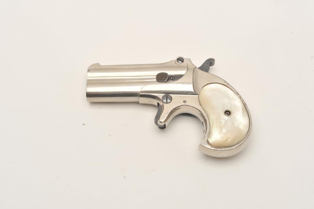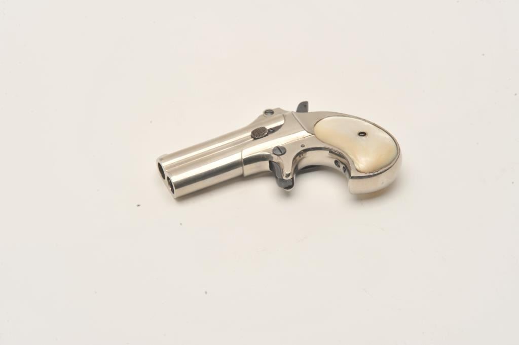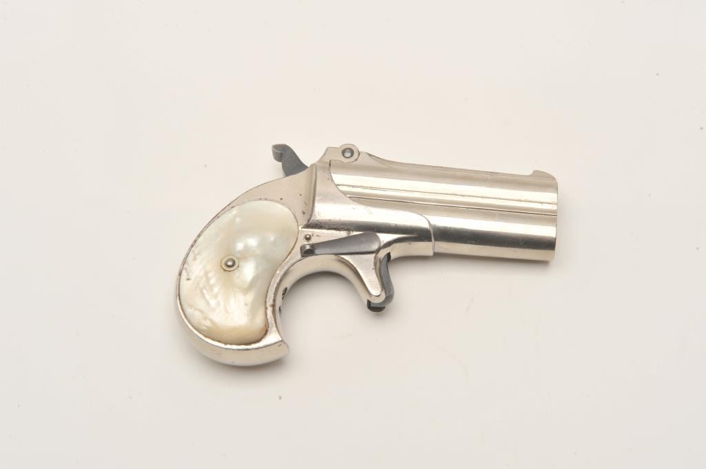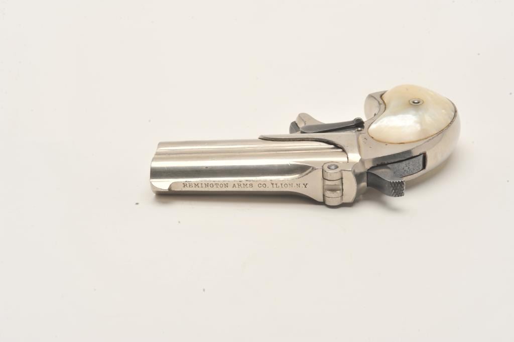 Remington Double Derringer in .41 rim fire caliber with long 1 line “cramped” address “Remington Arms Co., Ilion, N.Y.”. Began production on this variation 1889, S/N 351. Nickel plated and pearl grips in near fine Lot Title condition. 95%-99% original nickel with minor aging. Bright blue on small parts. Excellent period pearl grips. No defects. The collection of Doug Drummond. Est.: $1000-$2000