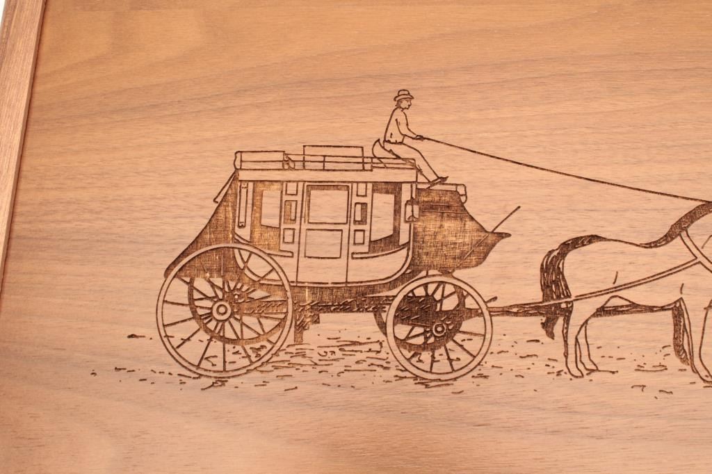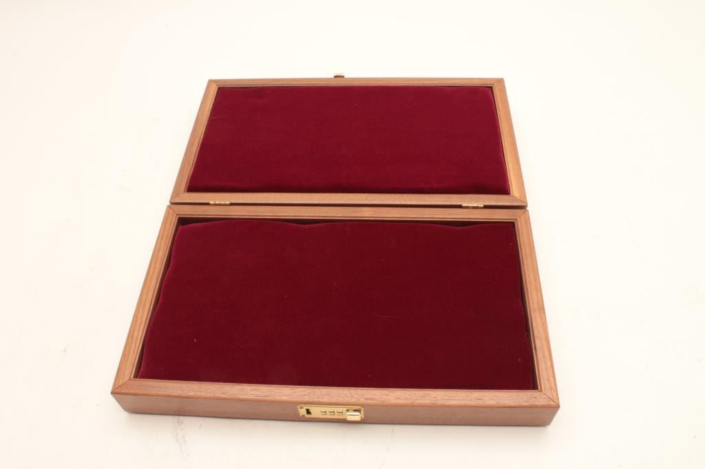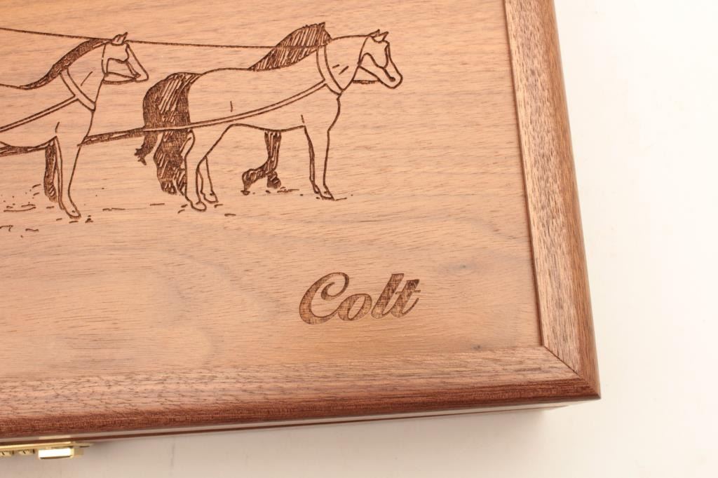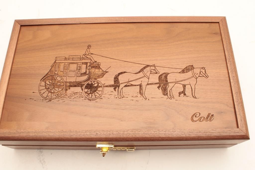 Wood display box for handgun, marked Colt on lid with engraved stagecoach; approximately 17” long x 10” wide x 4” deep. Est.: $100-$200.