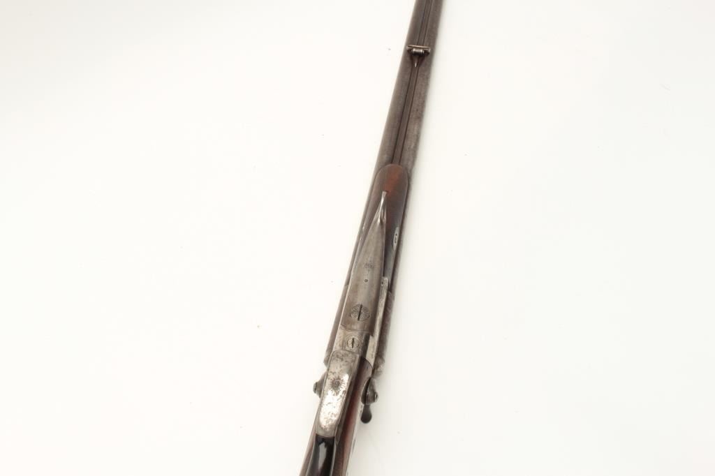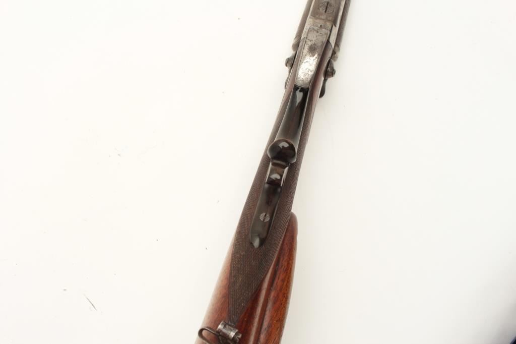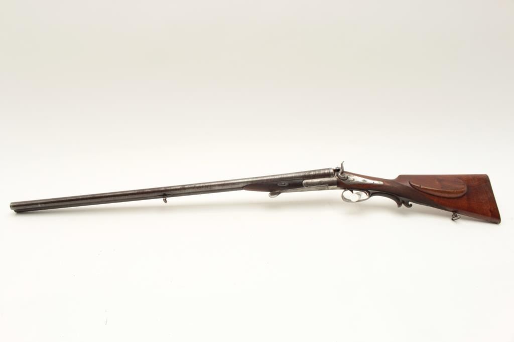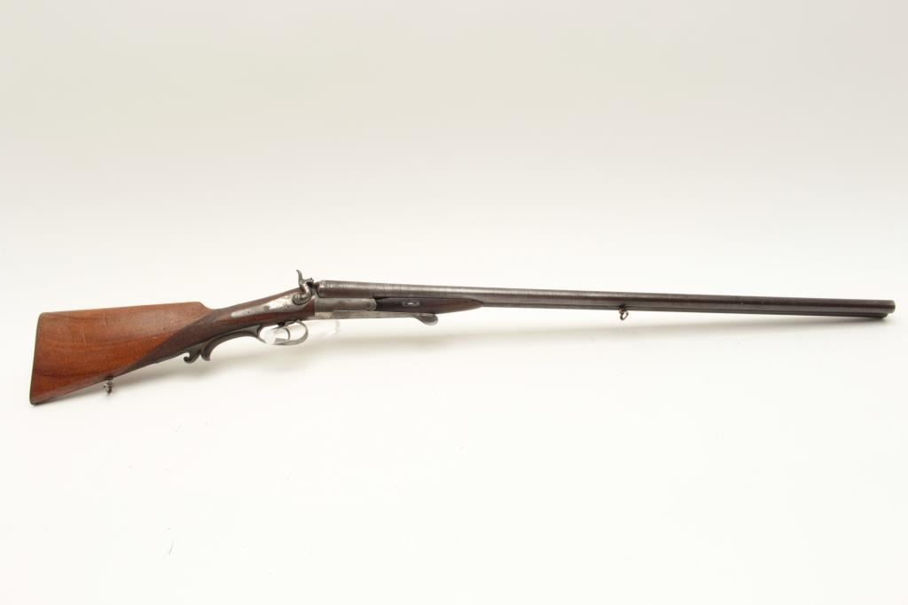 European SxS shotgun marked on top of barrel “Iman-Meffort/Suhl”, 16 gauge, 31” damascus barrels, case hardened receiver and back action lock plates, checkered wood stocks, double triggers, in overall good condition Lot Title with brown patina to barrels, traces of original case colors in protected areas of receiver, good actions, overall good wood with small old chip to right rear top side of forend. (Antique). Est.: Lot Title $300-$600.