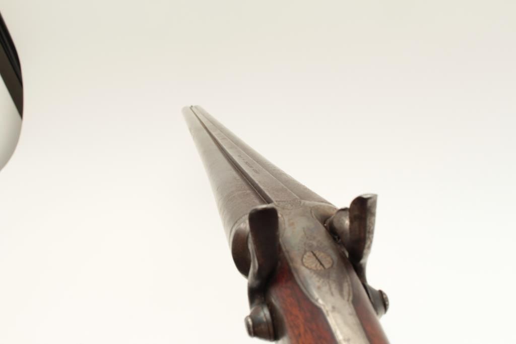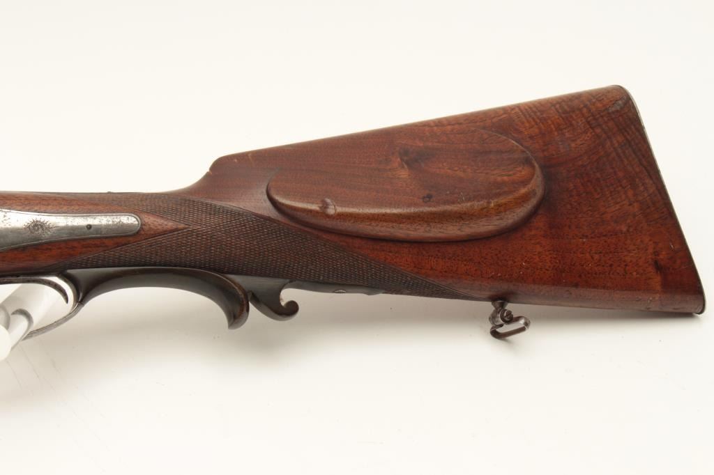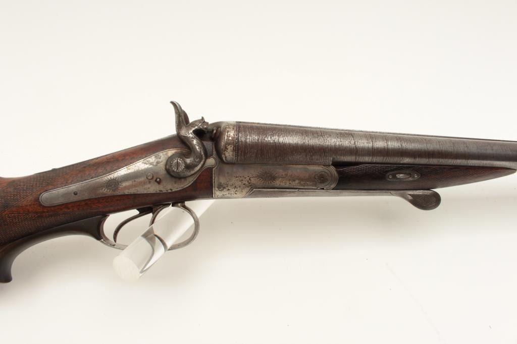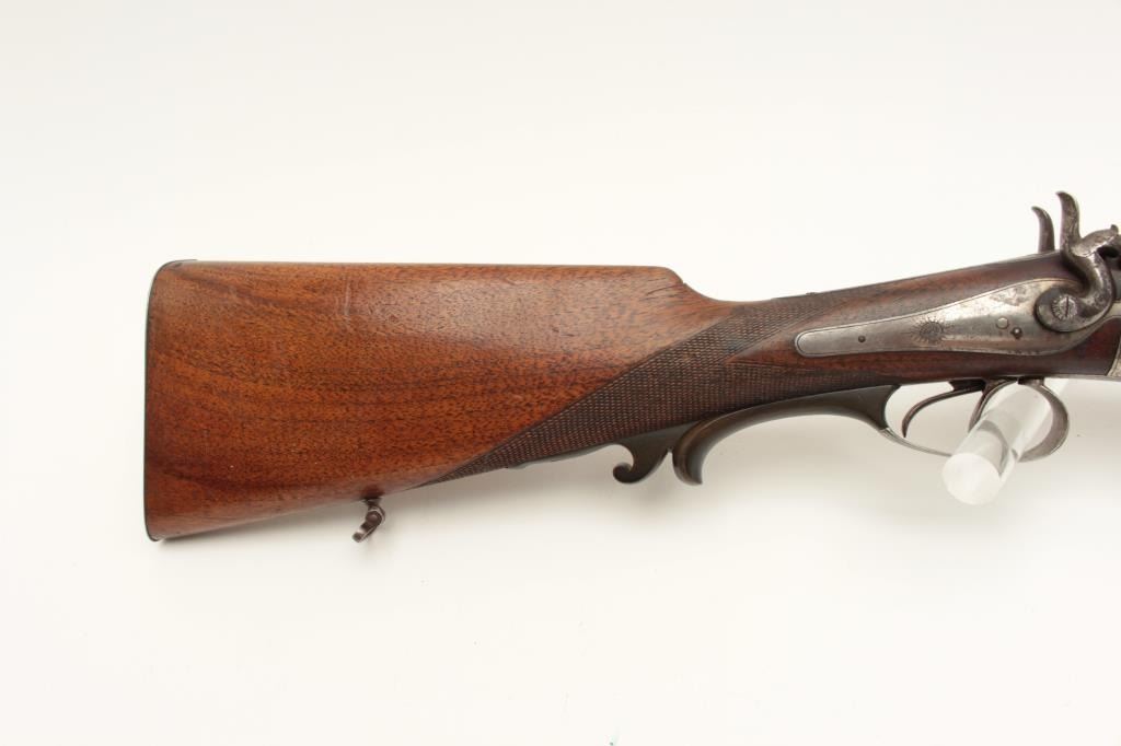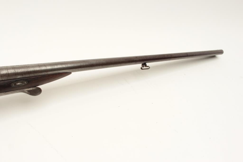 European SxS shotgun marked on top of barrel “Iman-Meffort/Suhl”, 16 gauge, 31” damascus barrels, case hardened receiver and back action lock plates, checkered wood stocks, double triggers, in overall good condition Lot Title with brown patina to barrels, traces of original case colors in protected areas of receiver, good actions, overall good wood with small old chip to right rear top side of forend. (Antique). Est.: Lot Title $300-$600.