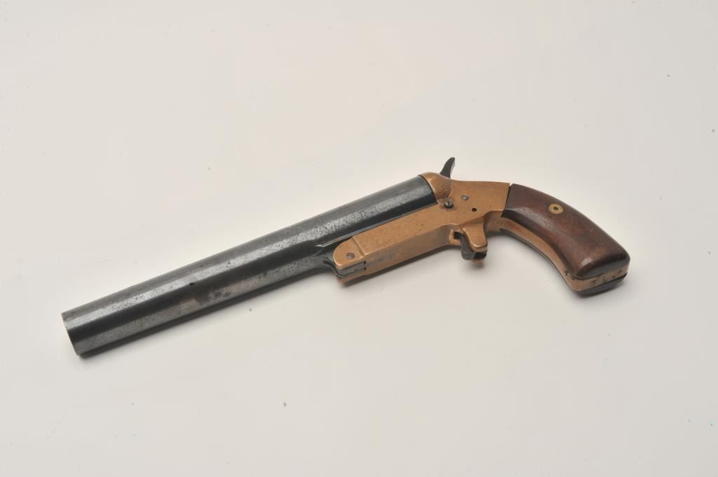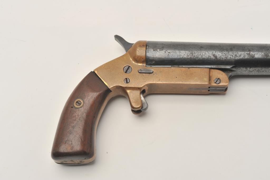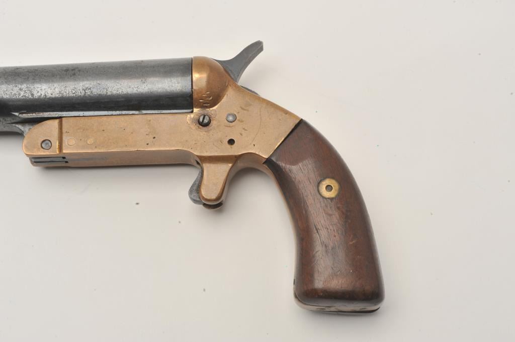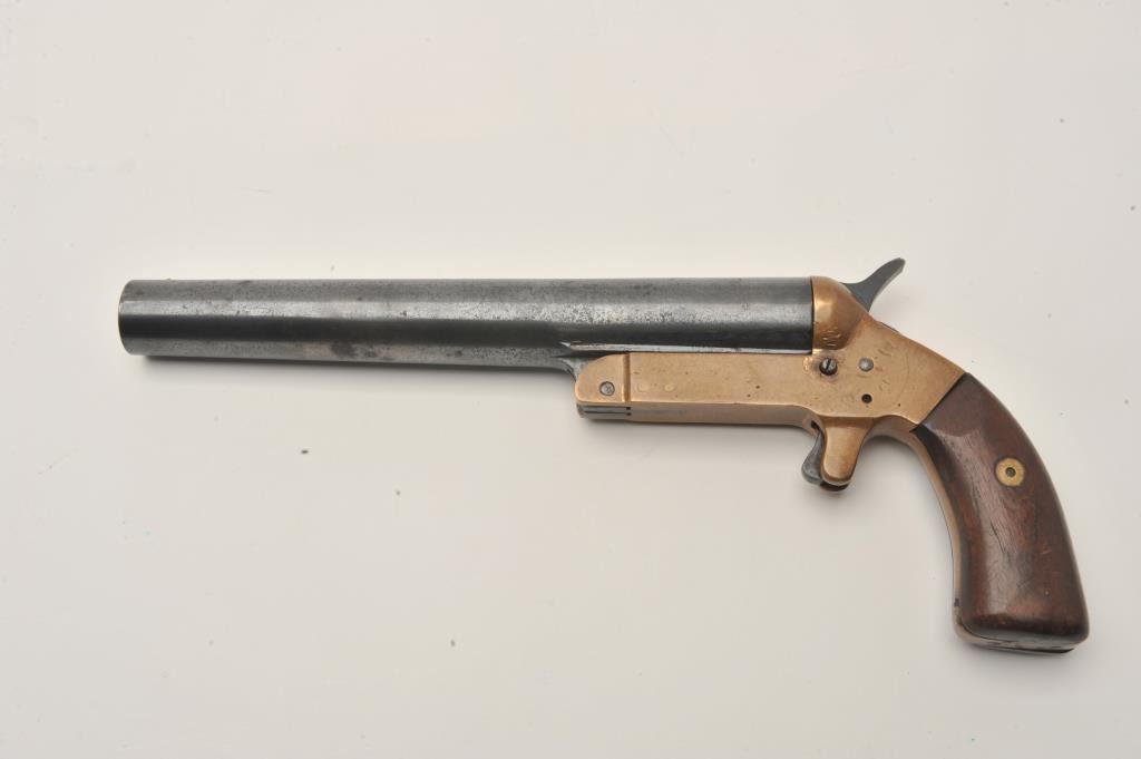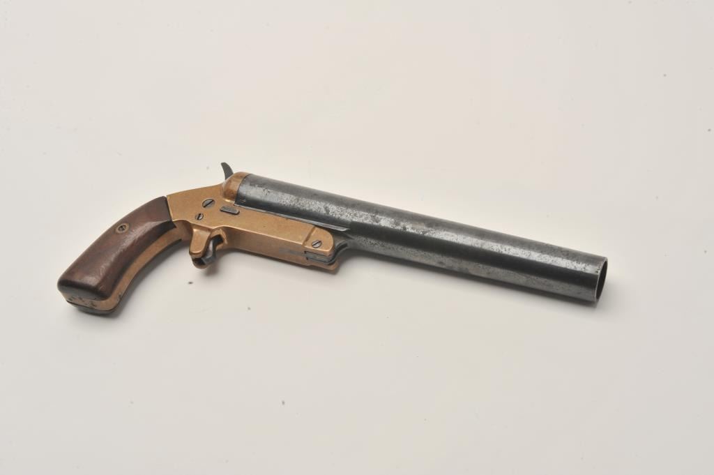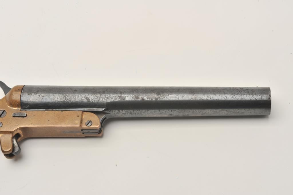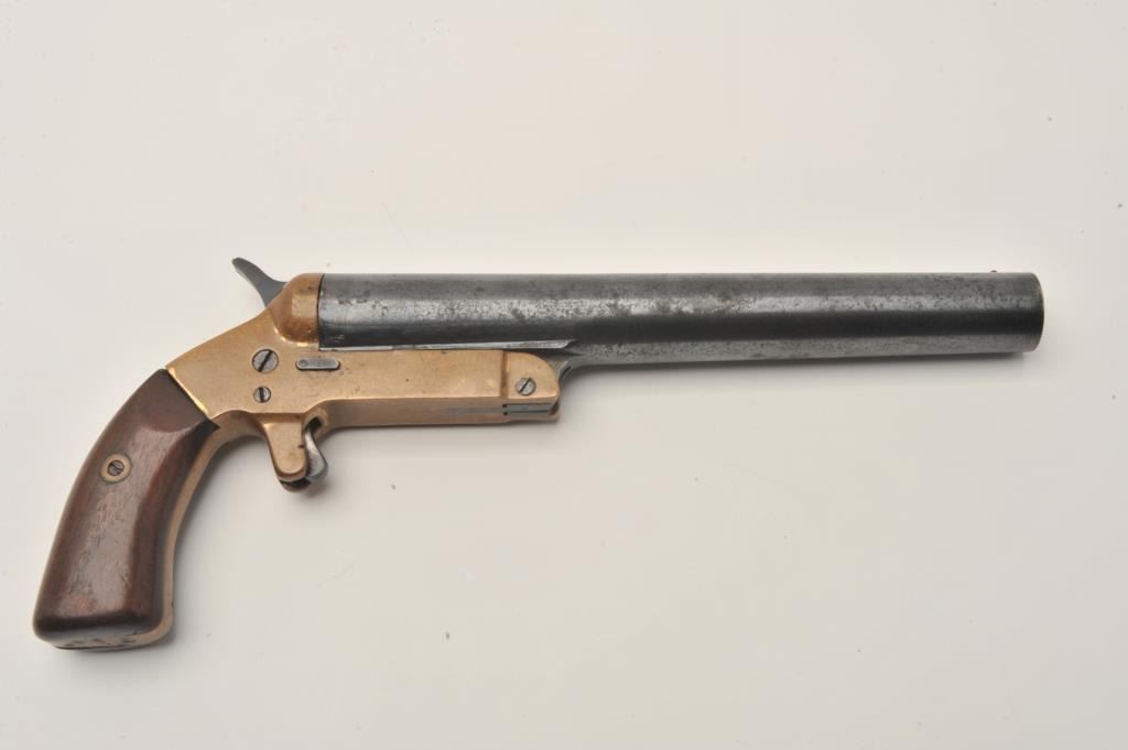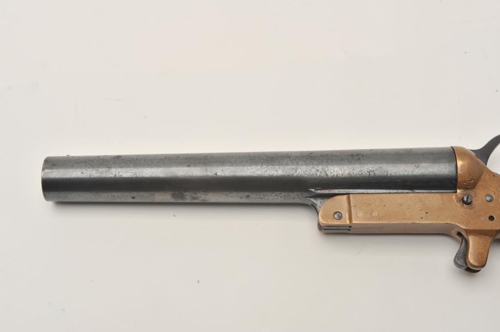 Remington Arms Mark III flare gun with brass frame and smooth wood grips. The flare gun is in good overall condition with a 9” barrel retaining the majority of its blue finish. The brass frame has is a mellow taffy color Lot Title and the smooth wood grips are in good condition showing wear consistent with use and carry. The bore is good, the action functions and the markings are sharp. Est.: $100-$200.