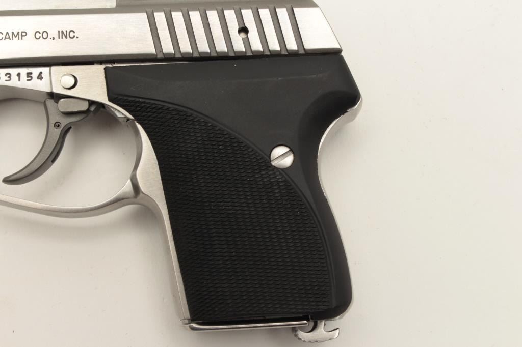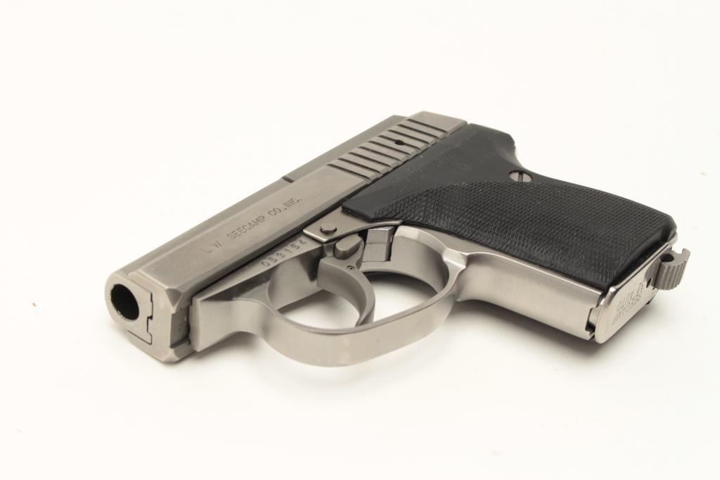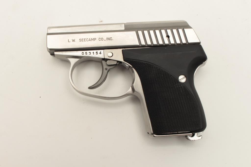 L.W.S. Seecamp California Edition .32 ACP cal., stainless semi auto pistol, #053154, hard plastic grips. Pistol is in excellent condition, excellent bore and action. Includes original box, all paperwork, manual Lot Title and warranty card. (Modern /PPT) Est $275-550