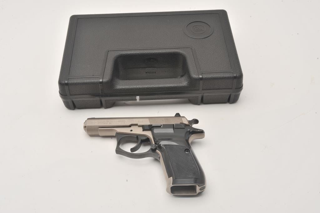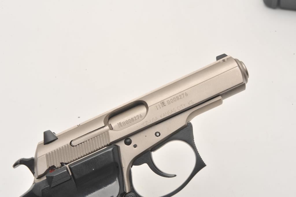 CZ 83 stainless semi automatic pistol, .380 ACP, #B008276, 3 3/4" barrel, drift adjustable 3 dot sights, plastic checkered grips with ambidextrous safety. Pistol is in excellent condition overall, with excellent Lot Title bore, crisp action, and excellent grips. Includes the original hard case and 5 high capacity magazines (not transferable to CA or other prohibited states). (Modern / PPT) Est$300-600