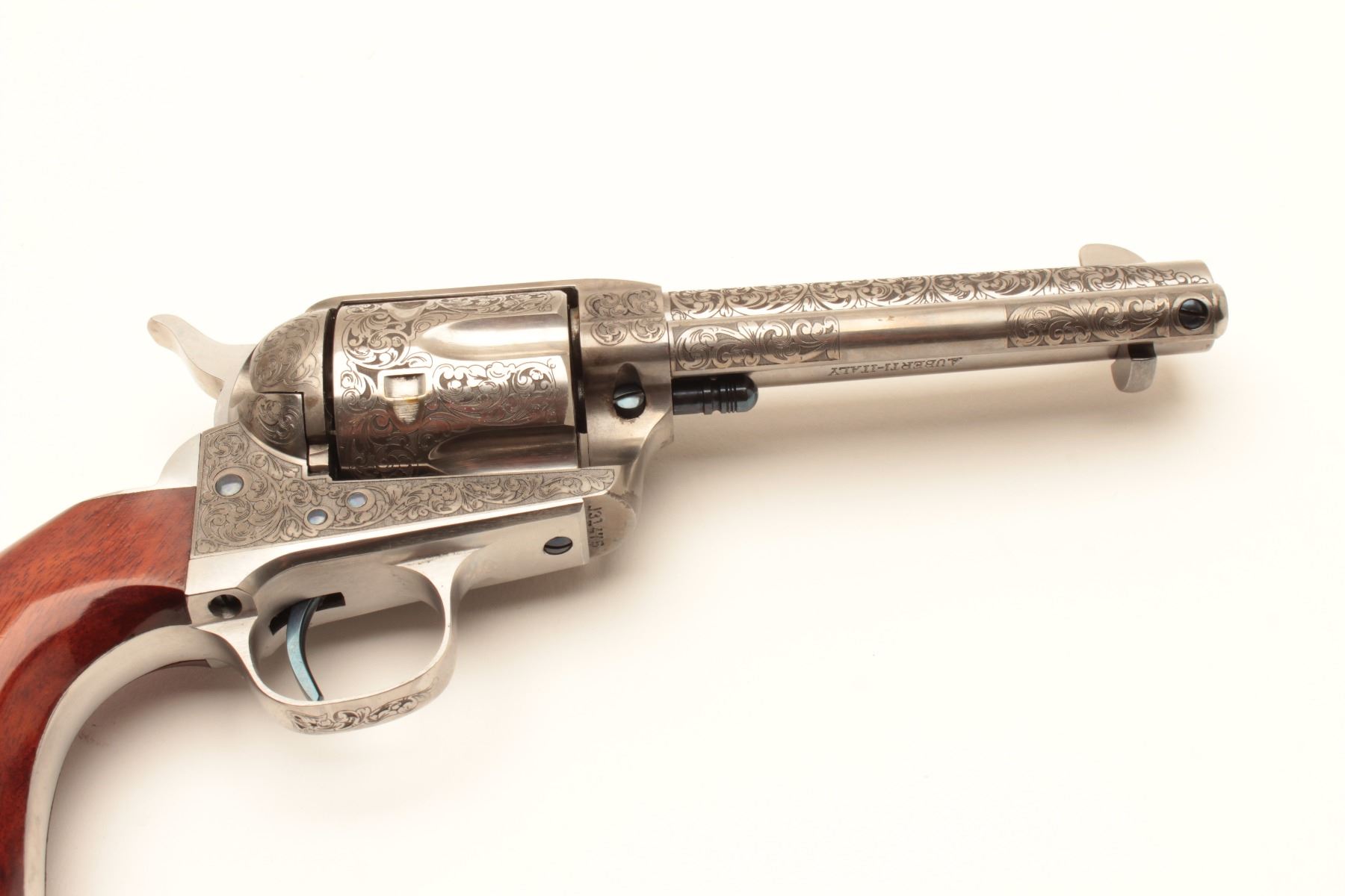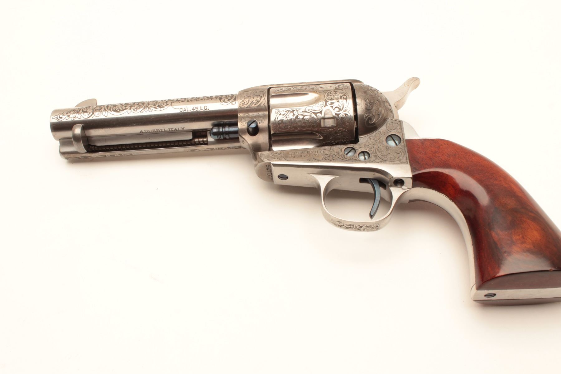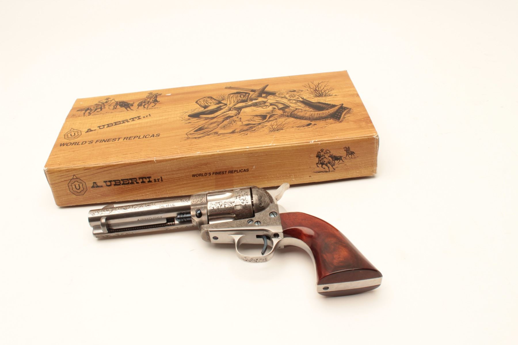 Taylor and Co. Single Action Revolver manufactured by Uberti in .45 L.C. caliber with 4 ¾” barrel, stainless steel, deluxe hand engraved, and one piece select wood grips. Fire blue screws and accenting parts. Lot Title Near fine showing only slight use in box. (Modern/PPT) Est.: $600-$1200