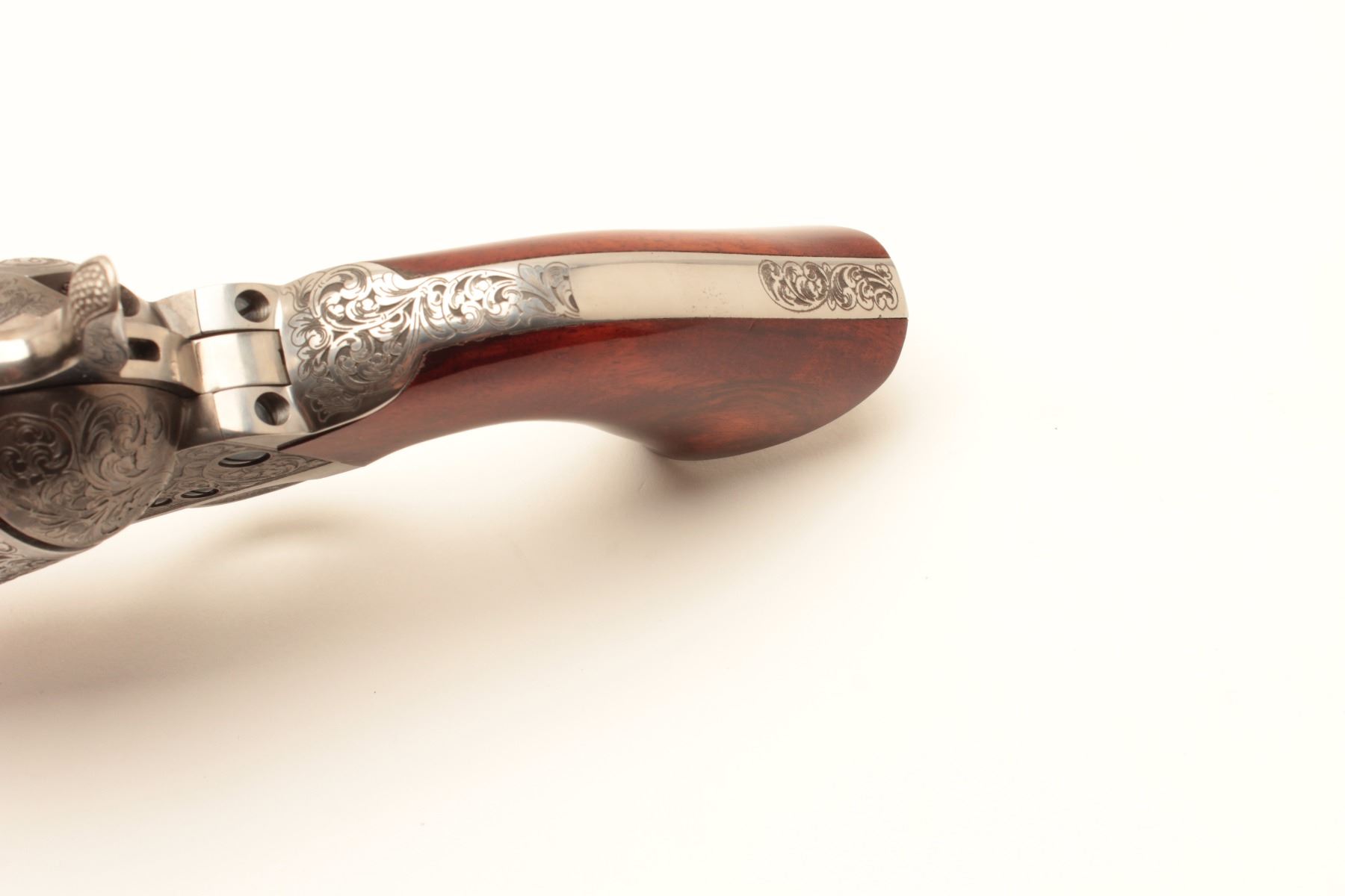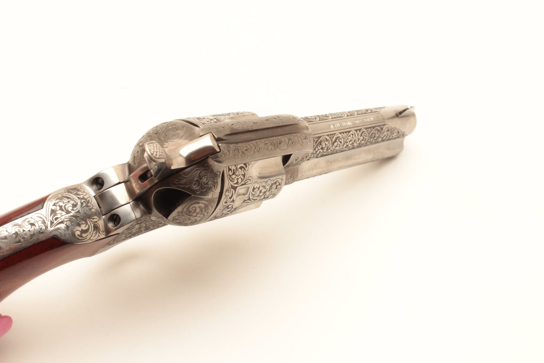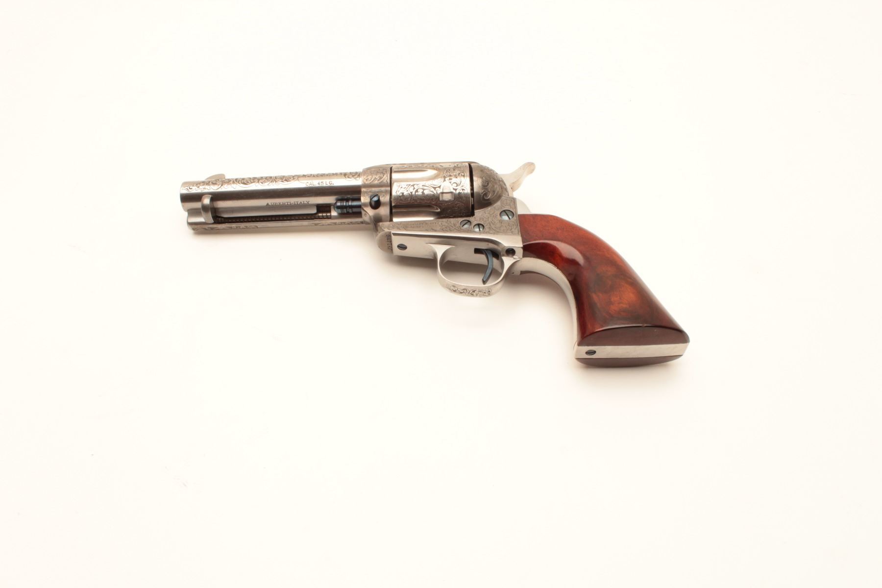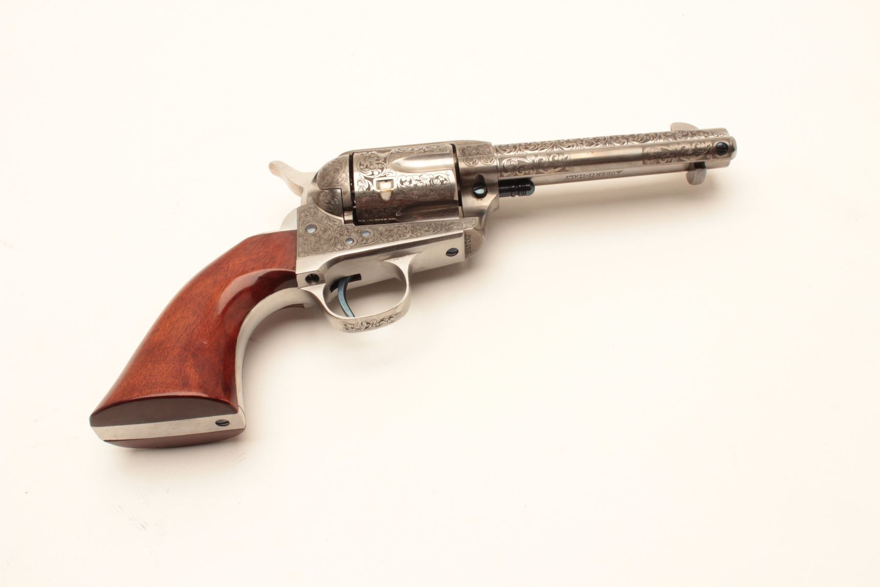 Taylor and Co. Single Action Revolver manufactured by Uberti in .45 L.C. caliber with 4 ¾” barrel, stainless steel, deluxe hand engraved, and one piece select wood grips. Fire blue screws and accenting parts. Lot Title Near fine showing only slight use in box. (Modern/PPT) Est.: $600-$1200