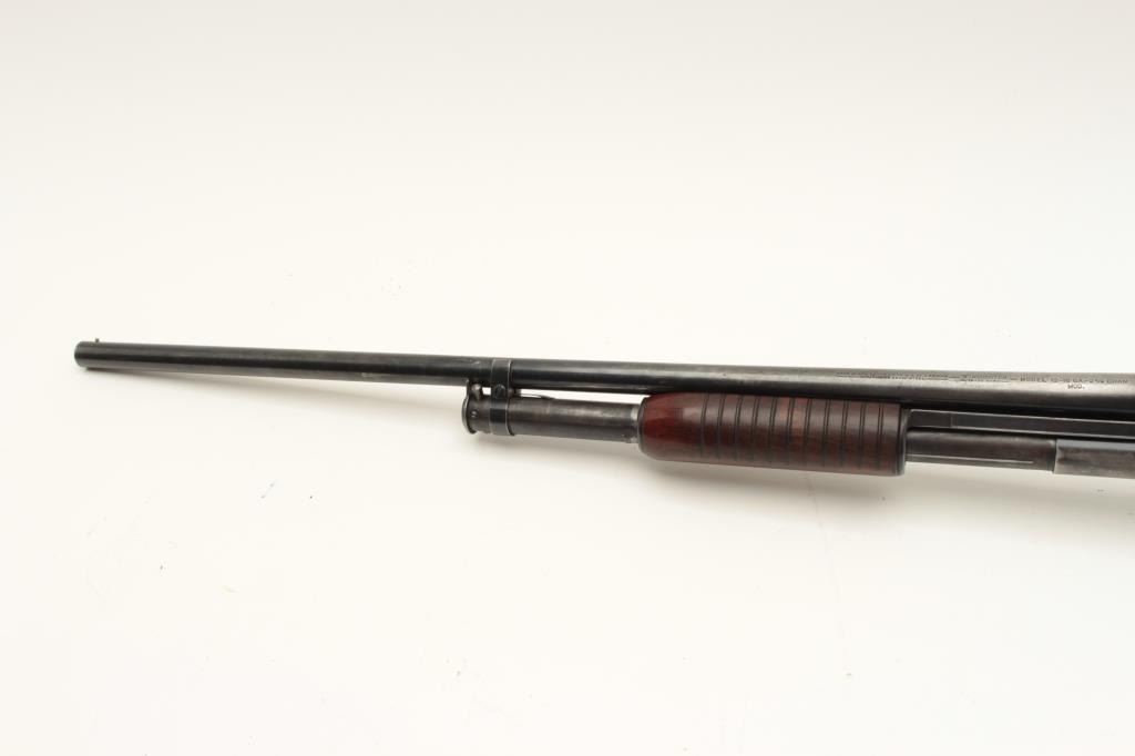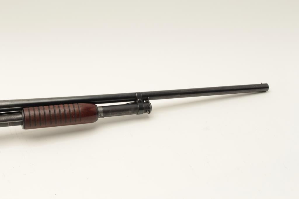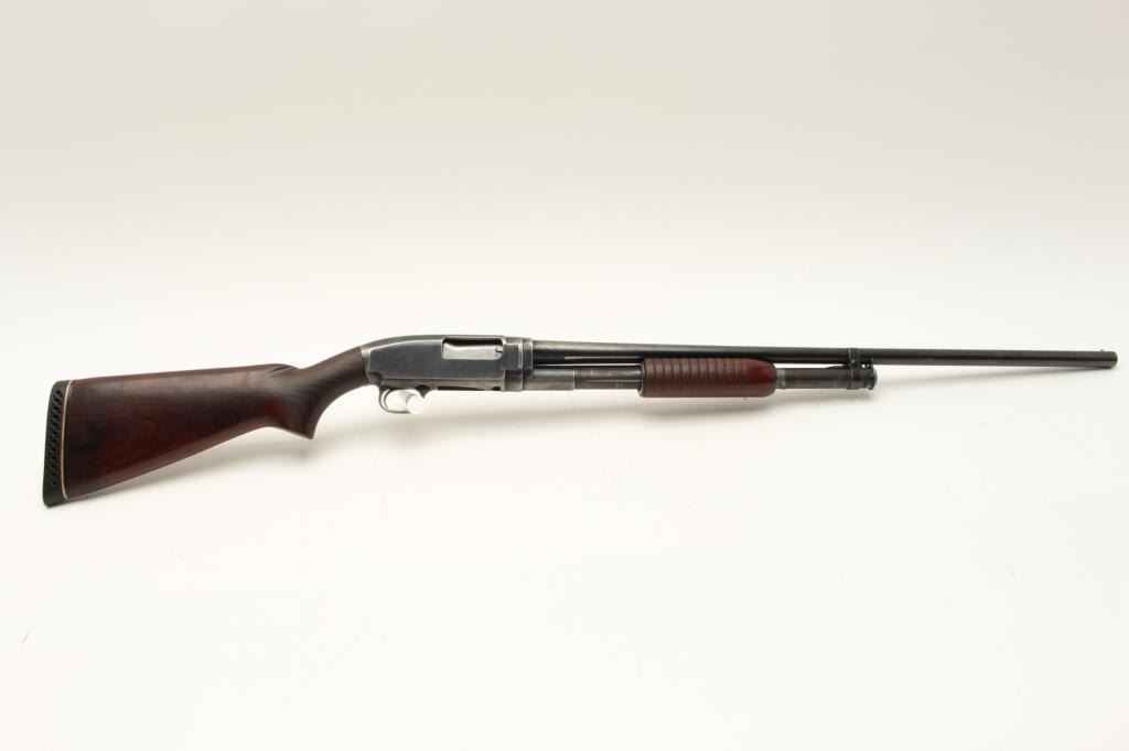 Winchester Model 12 pump action takedown shotgun, 12 gauge, modified choke, 28” barrel, blued finish, wood stocks, S/N 1248296, in overall good to very good condition with a very good bore, crisp Lot Title action, good markings and wood with added White Line hard rubber butt pad. (Modern). Est.: $250-$500.