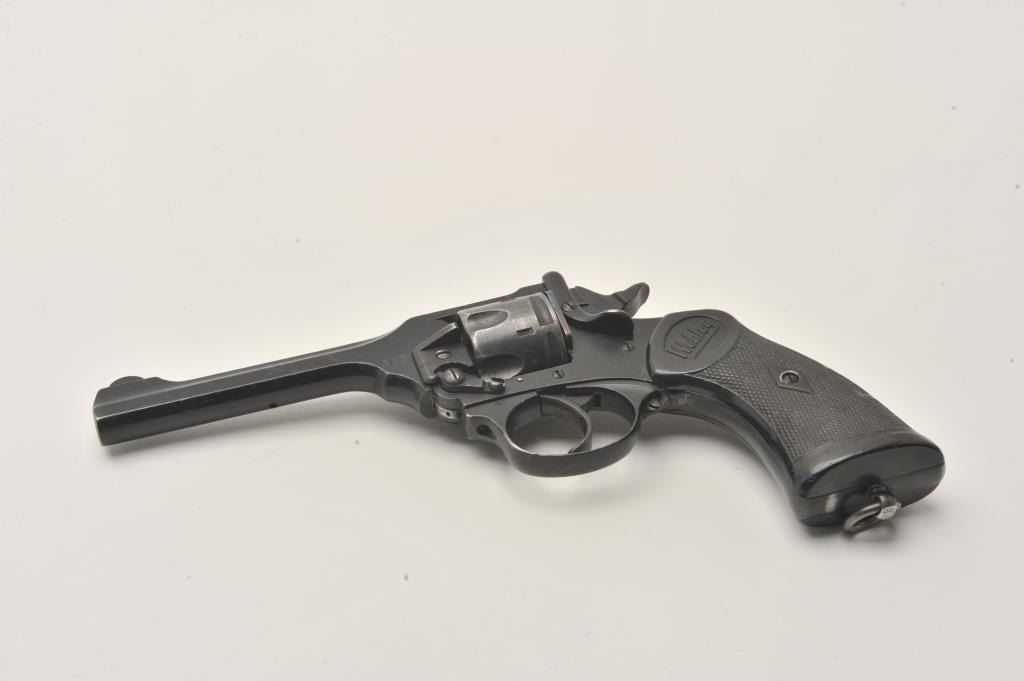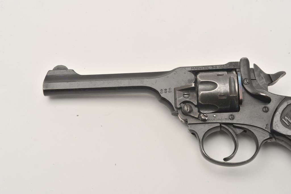Webley MK. IV revolver, .38 caliber, Serial #477379. The pistol is in good overall condition as arsenal rebuilt in the 1960’s. The pistol retains the majority of its black finish with scratches and abrasions Lot Title consistent with service use. The pistol has British proofs and is marked, “WAR FINISH “and “MADE IN ENGLAND” on the frame. The checkered hard rubber Webley marked grips are in good condition showing handling and wear. Lot Title The bore is good, the action is crisp and markings are legible on this WWII era Webley. A consignor letter to the Webley Company and book are included in the lot. Est.: $800-$1,600. (C+R).