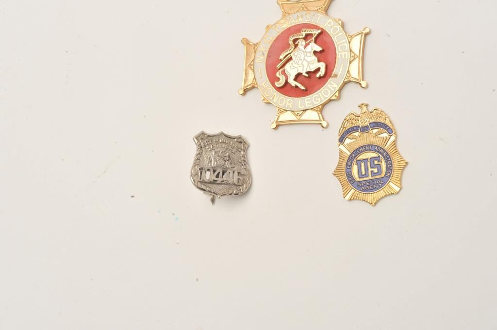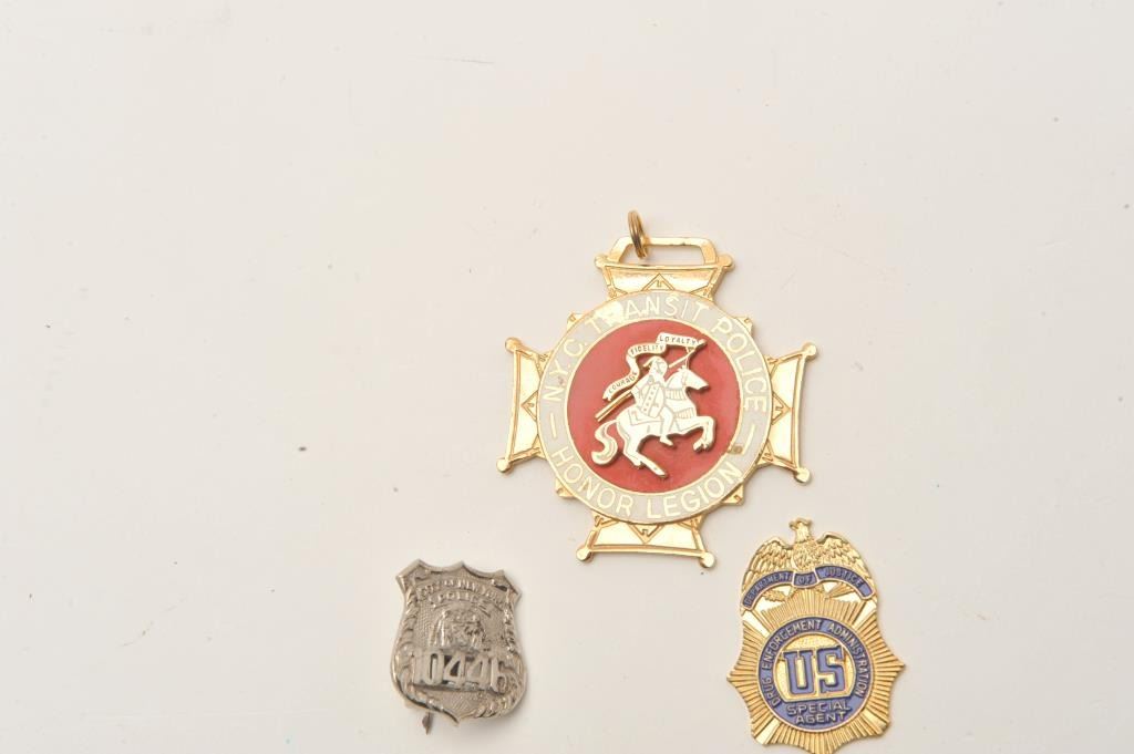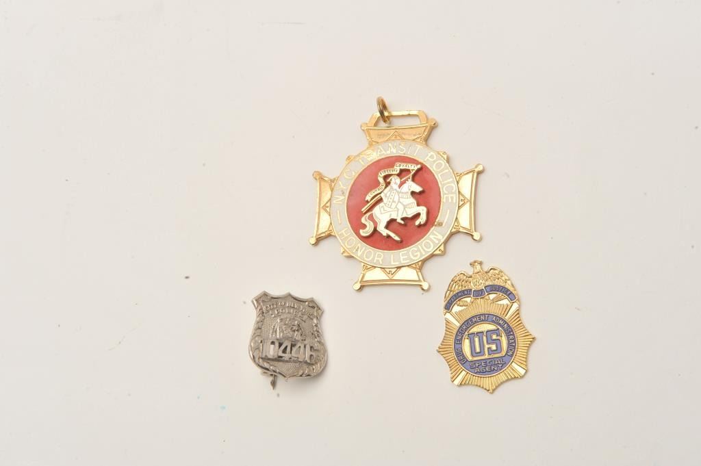 N.Y.C. Transit Police Honor Legion enameled fob plus two small pins; one a NYC Police (10446), the other a U.S. DEA Special Agent pin. Est.: $150-$300.