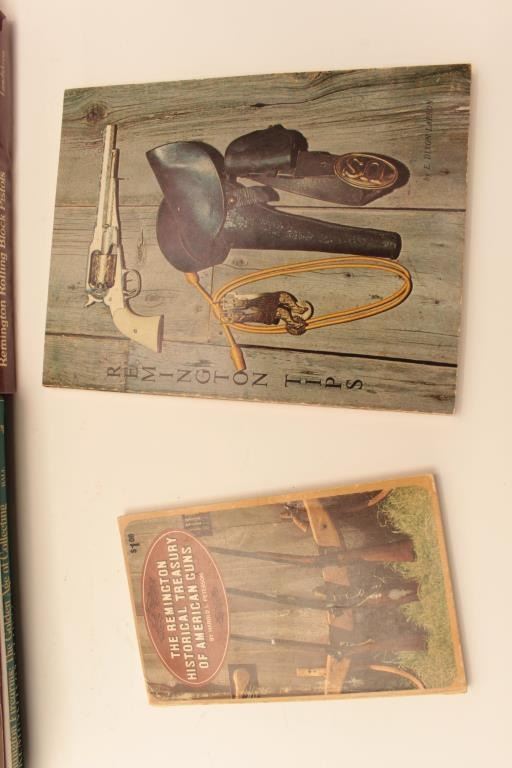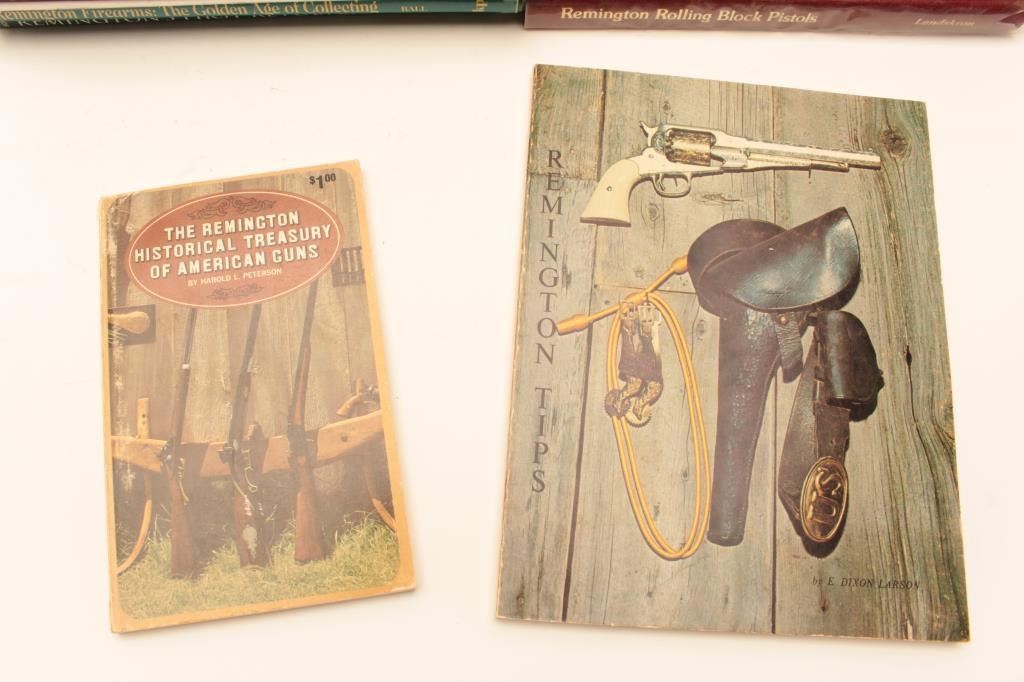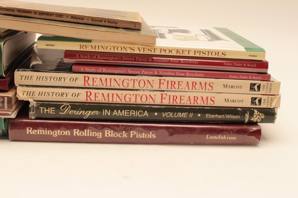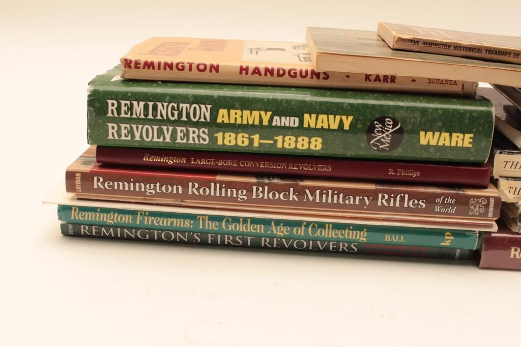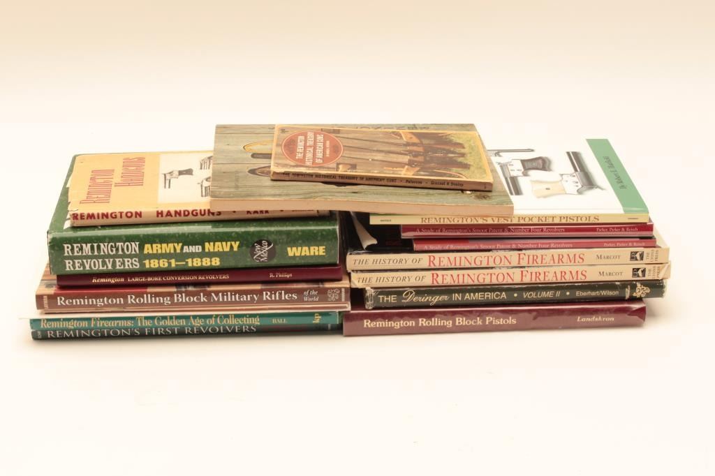 Box lot in various conditions from good to fine as described: 1. Remington handguns by Karr 2. Remington Army and Navy revolvers by Ware 3. Remington guns by Dixon Larson Lot Title 4. Remington History Treasury by Harold Peterson 5. Remington Large Bore Conversion Revolvers by R. Phillips 6. The History of Remington by Marcot Lot Title 7. The History of Remington by Marcot 8. The derringer book by Eberhart 9. Remington Rolling Block Psitols by Lanskrom 10. Remington Rolling Block Military Rifles Lot Title by Layman 11. Remington Smoot Patent & No. 4 Revovlers by Parker 12. Remington Smoot Patent & No. 4 hard cover by Parker Lot Title 13. Remington Vest Pocket Pistols by Robert Hatfield 14. Remingtons First Revovler, The BEals by Charles Schif 15. Remington Firearms, the Golden Age by