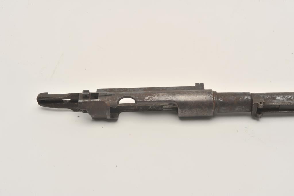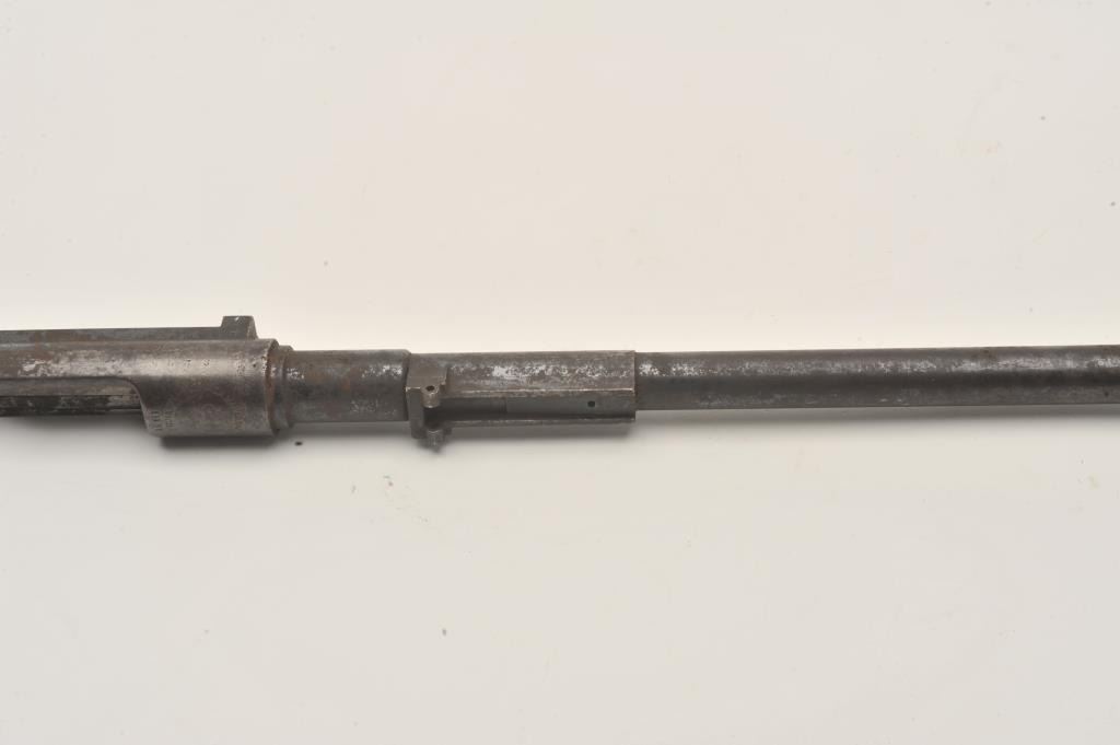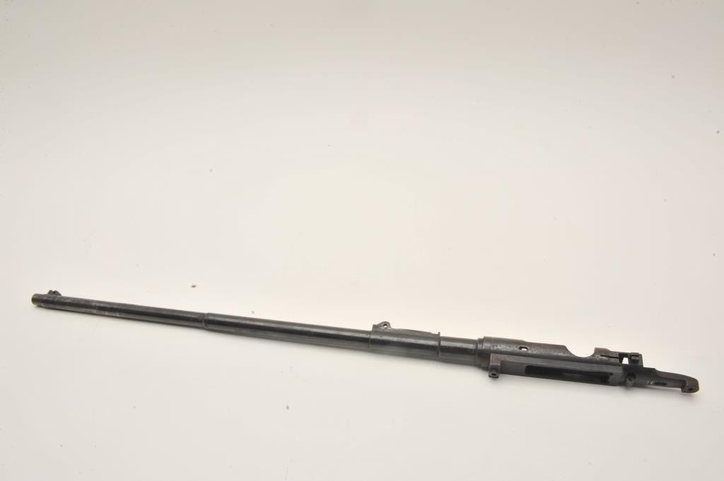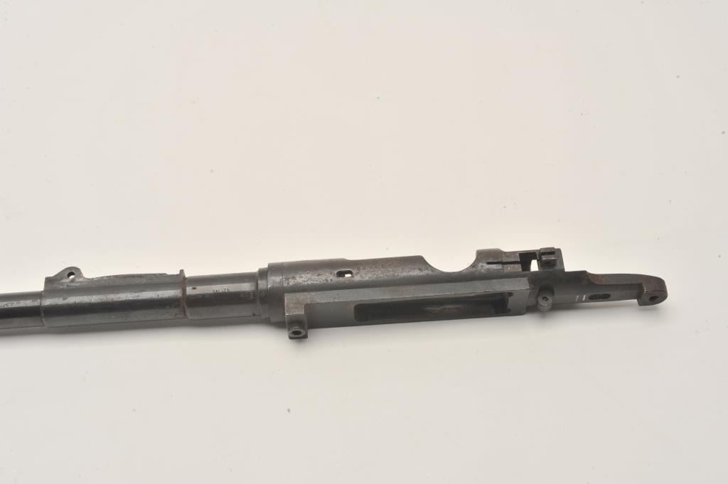 Mexican Model 1910 Mauser barreled receiver, 7mm caliber, Serial #2275. The lot includes a 29” barreled action with a 1931 dated Mexican Mauser action, front and rear sights removed. The front ring features the Mexican Lot Title crest and is dated 1931. The barrel and receiver both show significant light surface rust. The receiver is missing the internal parts and shows light to moderate pitting beneath the wood line. The bore is just Lot Title fair. Mexican Model 1936 Mauser barreled action, 7mm caliber, Serial #5365. The lot includes a 24” barreled action with a 1948 dated Mexican Mauser action, front and rear sights removed. The front ring features the Lot Title Mexican crest and is dated 1948. The barrel and receiver are both in the white with sharp markings. Mexican Model 1936 Mauser barreled receiver, 7mm caliber, Serial #68641P. The lot includes a 24” barreled Lot Title action with a 1944 dated Mexican Mauser action, front and rear sights removed. The front ring features the Mexican crest and is dated 1936. The barrel and receiver both show the majority of their blue finish with