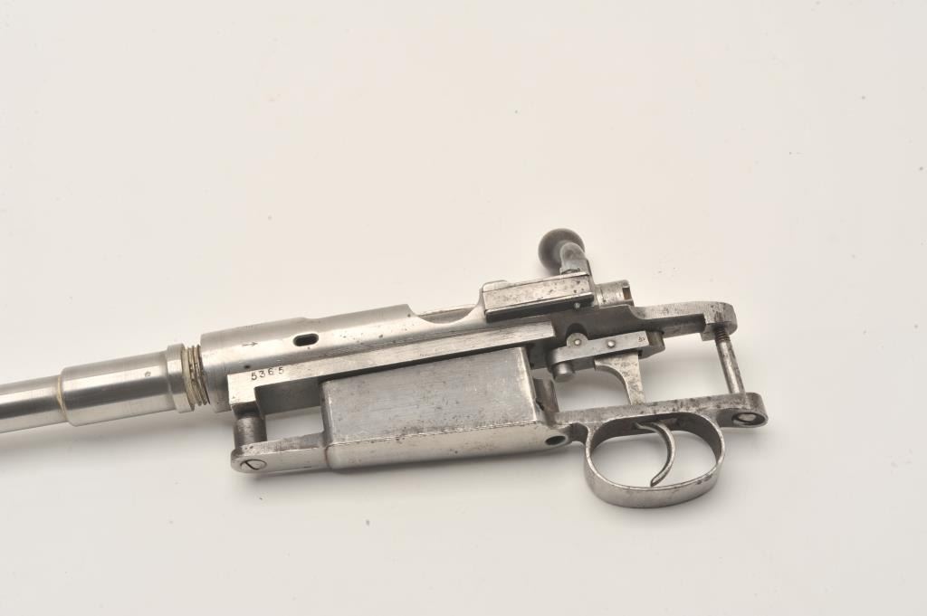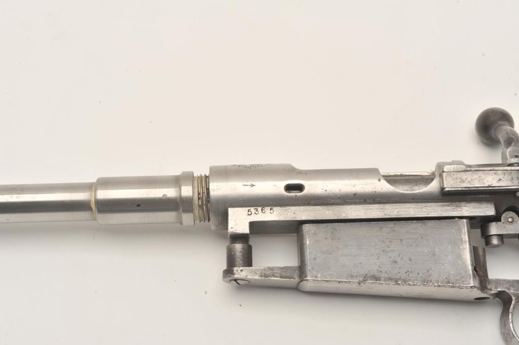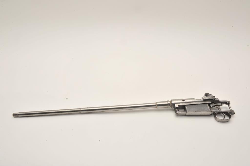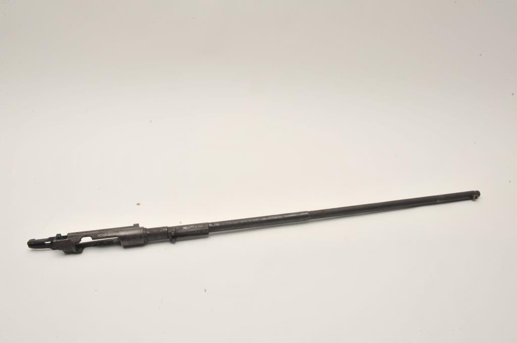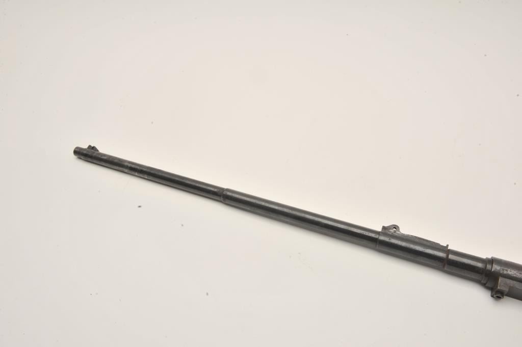 Mexican Model 1910 Mauser barreled receiver, 7mm caliber, Serial #2275. The lot includes a 29” barreled action with a 1931 dated Mexican Mauser action, front and rear sights removed. The front ring features the Mexican Lot Title crest and is dated 1931. The barrel and receiver both show significant light surface rust. The receiver is missing the internal parts and shows light to moderate pitting beneath the wood line. The bore is just Lot Title fair. Mexican Model 1936 Mauser barreled action, 7mm caliber, Serial #5365. The lot includes a 24” barreled action with a 1948 dated Mexican Mauser action, front and rear sights removed. The front ring features the Lot Title Mexican crest and is dated 1948. The barrel and receiver are both in the white with sharp markings. Mexican Model 1936 Mauser barreled receiver, 7mm caliber, Serial #68641P. The lot includes a 24” barreled Lot Title action with a 1944 dated Mexican Mauser action, front and rear sights removed. The front ring features the Mexican crest and is dated 1936. The barrel and receiver both show the majority of their blue finish with