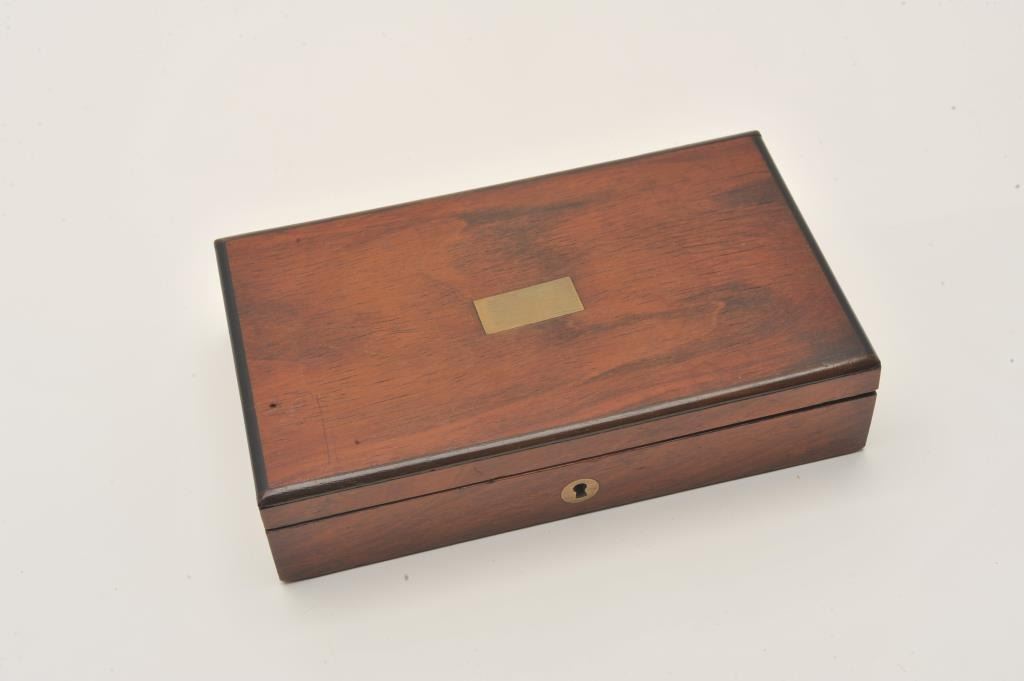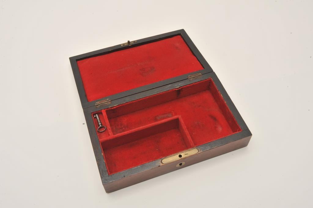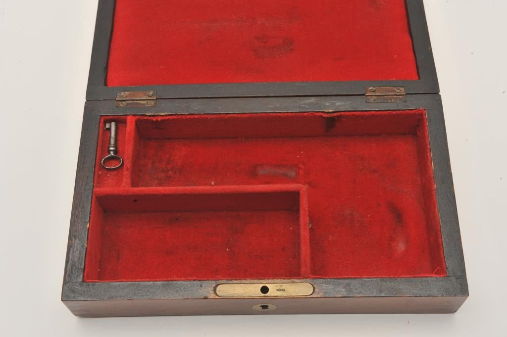 Unidentified original to the 19th century gun case lined with red baize or felt or felt from cartridge era estimated 1870-90s. Apparently a revolver with 3 7/8” barrels or less with 4” from hammer to heel. Interior Lot Title measures 7” x 4” by 1 ½” deep. Veneered rosewood. Very good condition. Probably Remington or S&W. With key. Est.: $250-$500