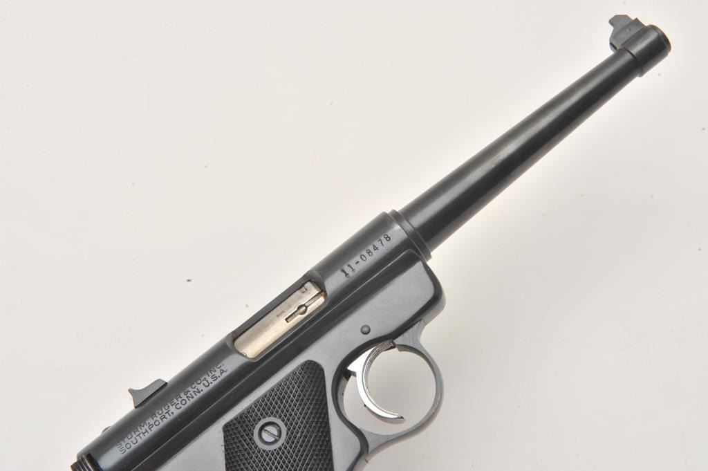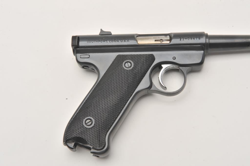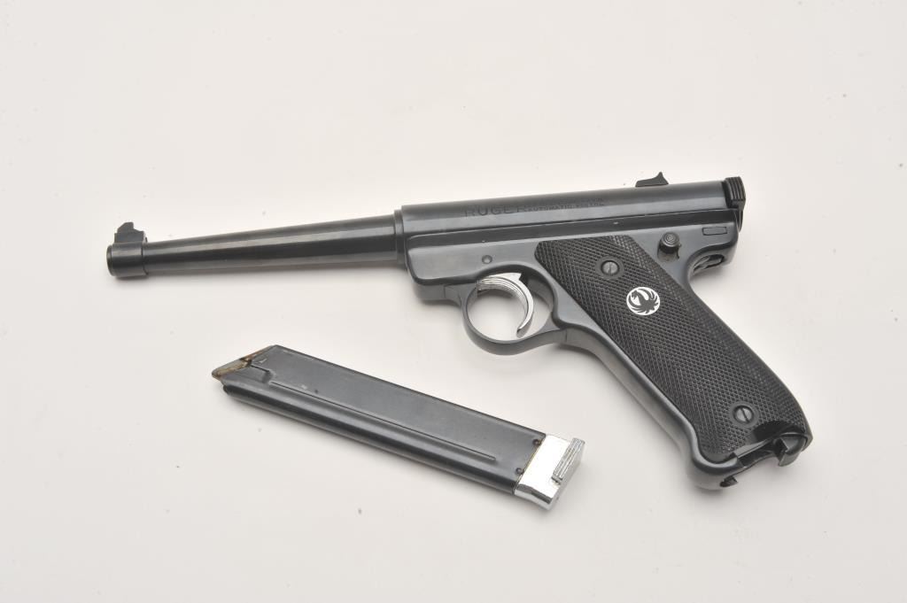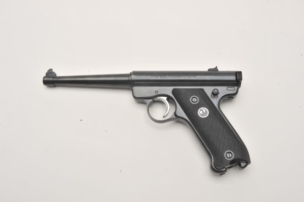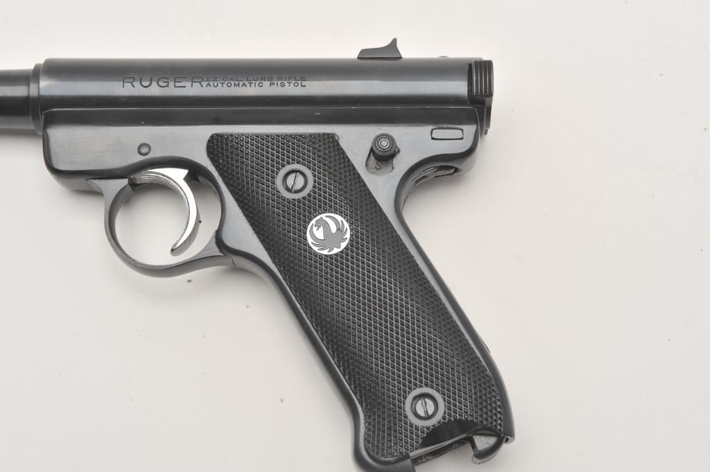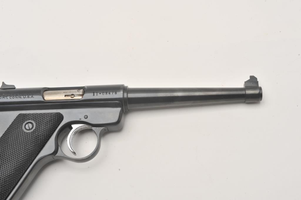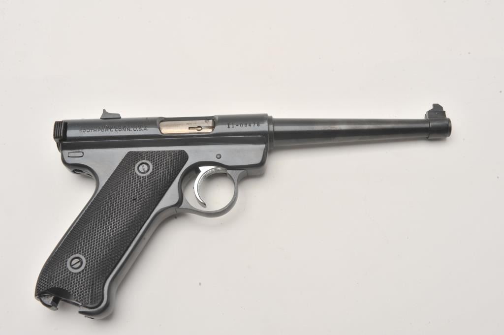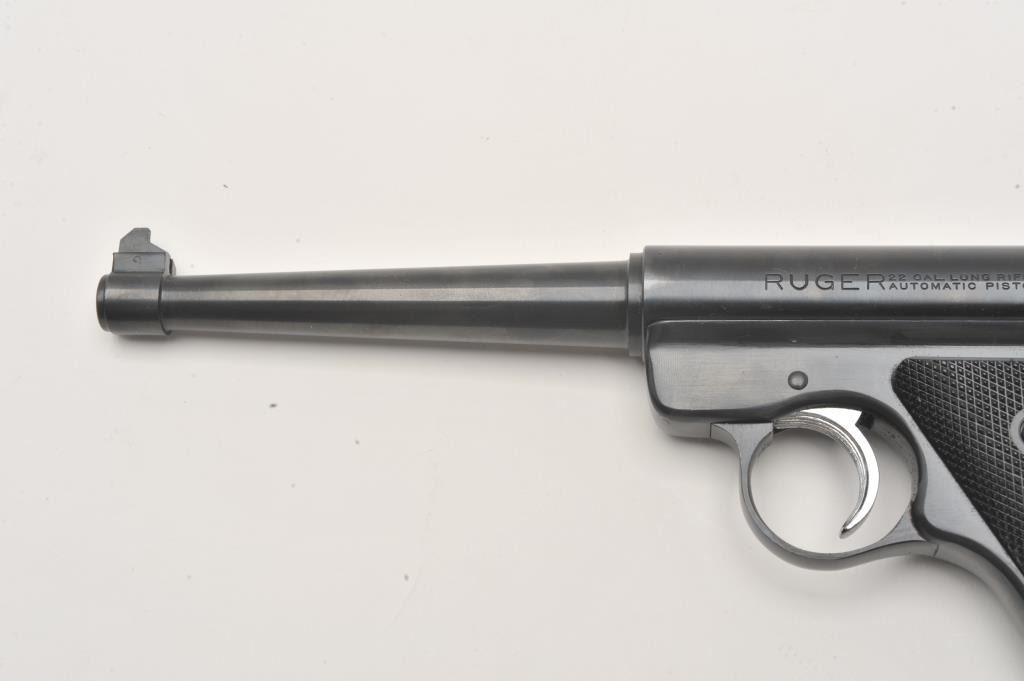 Ruger Standard Automatic .22 LR semi automatic target pistol, #11-08478, 6" barrel, blued finish, checkered logo grips. Pistol is in fine condition overall, minty bore, crisp action, in original box with Lot Title manual and one mag. (Modern / PPT) Est. $200-400
