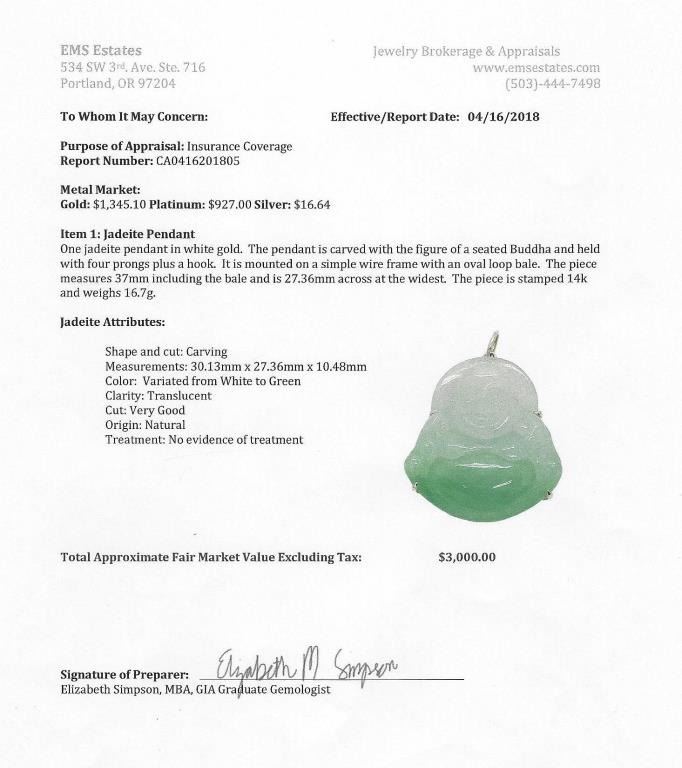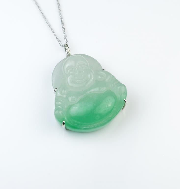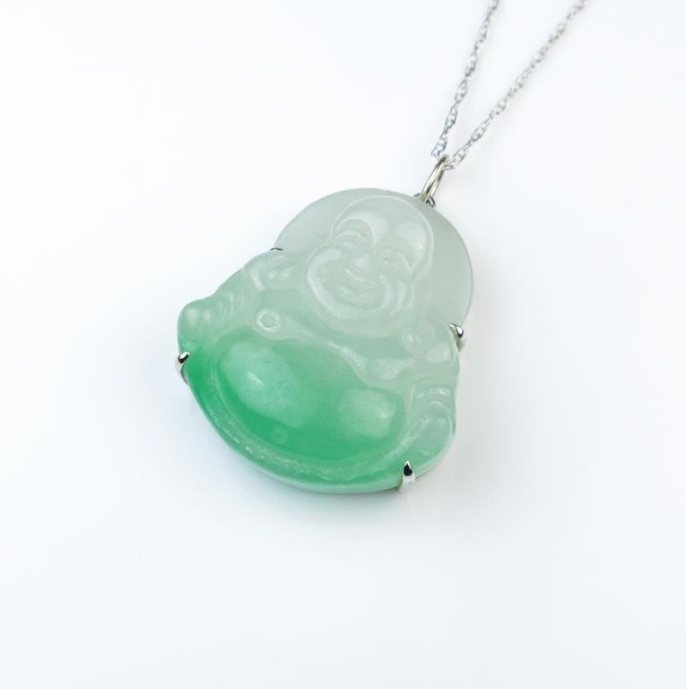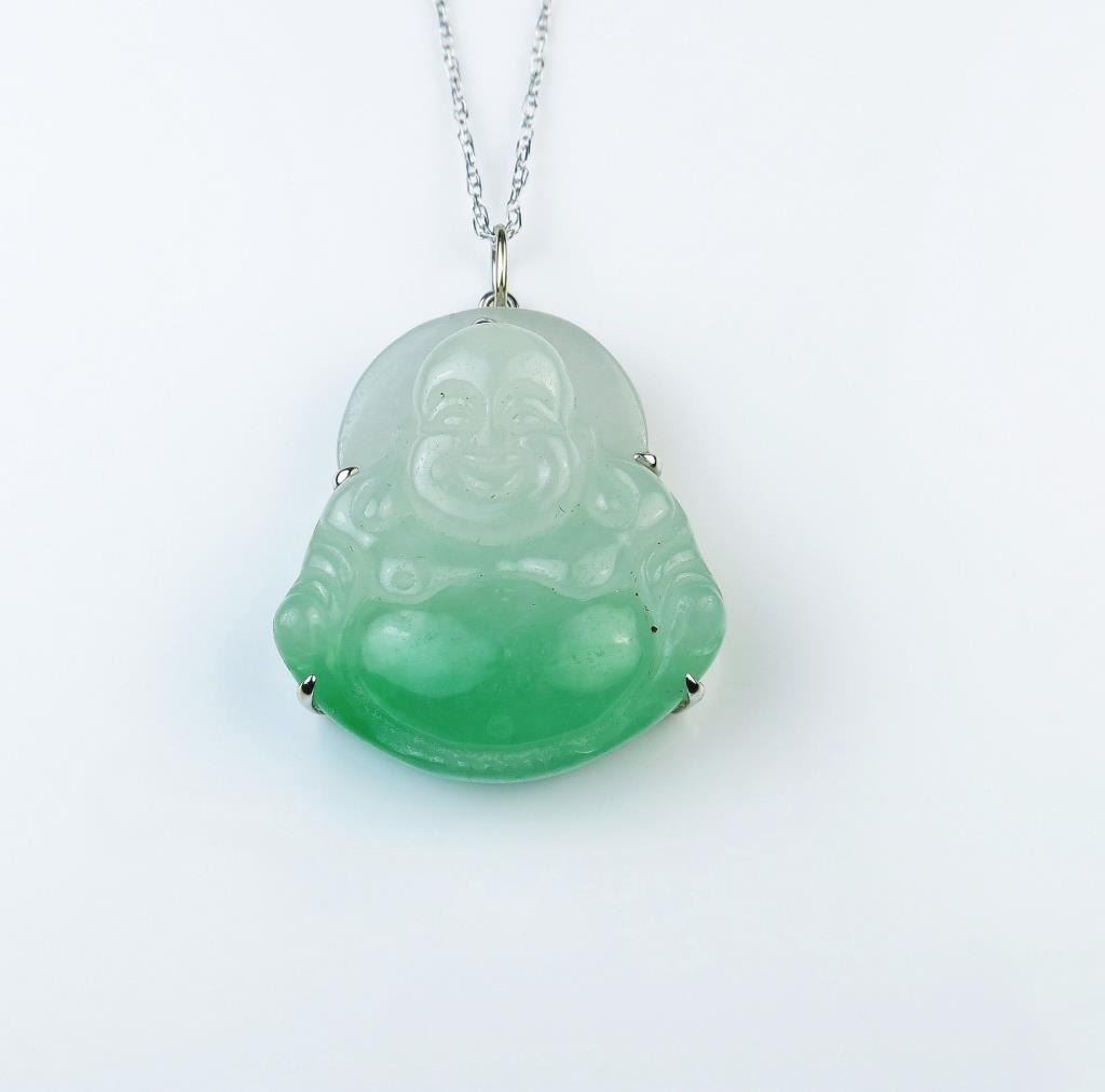 High quality natural Jade Buddha pendent carved in Apple Green to White Jade weighing over 80.00 carats (16 Grams) set in 18 karat white gold custom made setting. Full Appraised Value $3,000 Estimates Lot Title $1,500-$2,000