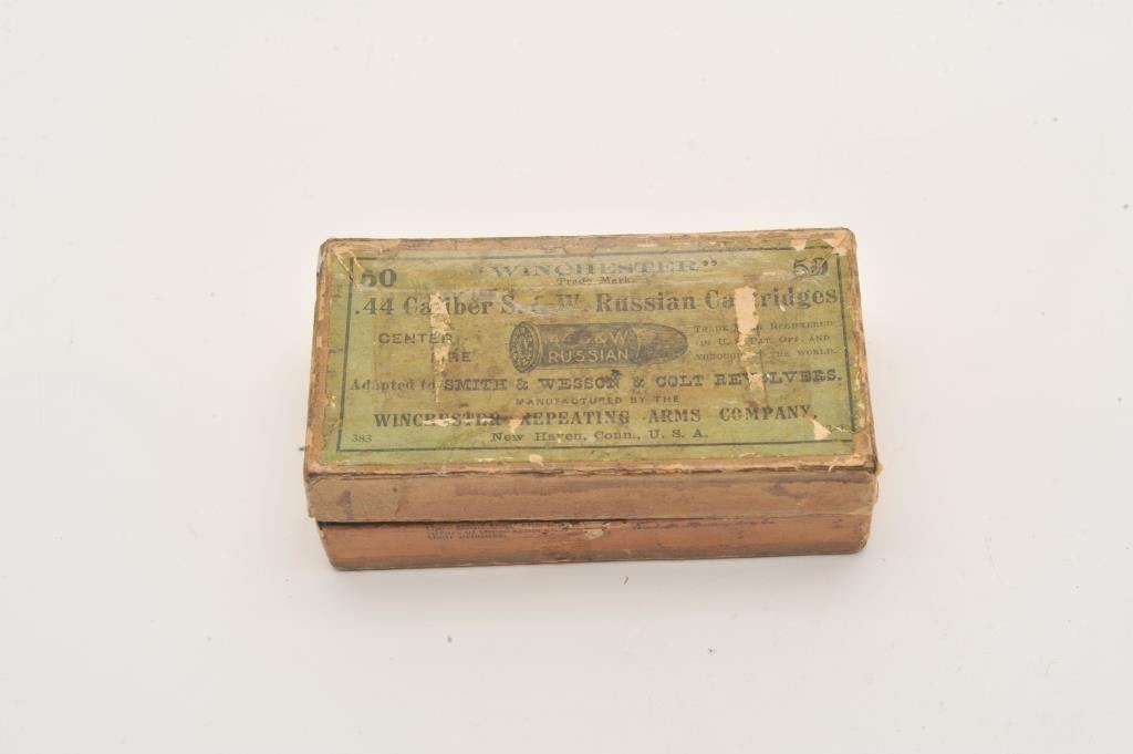 Winchester made cartridges for .44 Russian. Reloaded. 26 rounds of mixed head stamps and bullet weights. Box fair. Est.: $50-$100