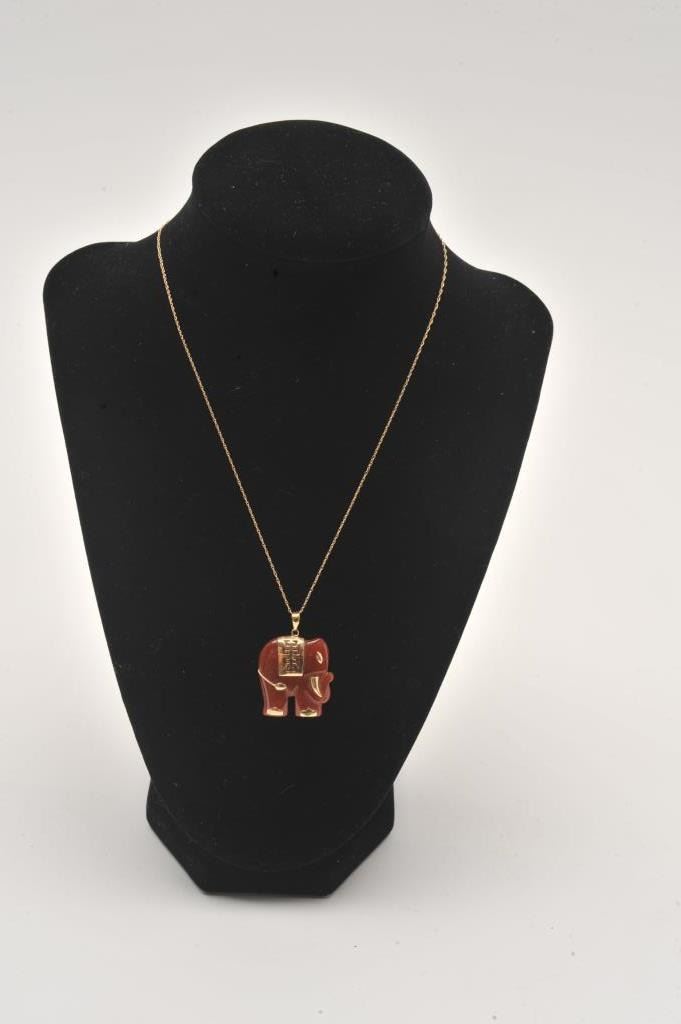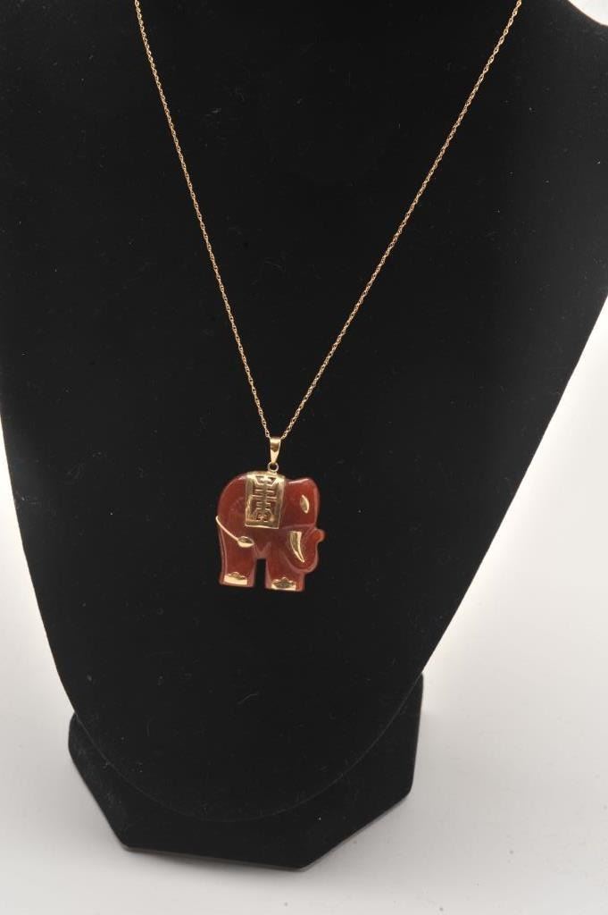Red Jade Elephant Pendant with detailed gold accents with 10 karat yellow gold chain. Estimate $200-$300