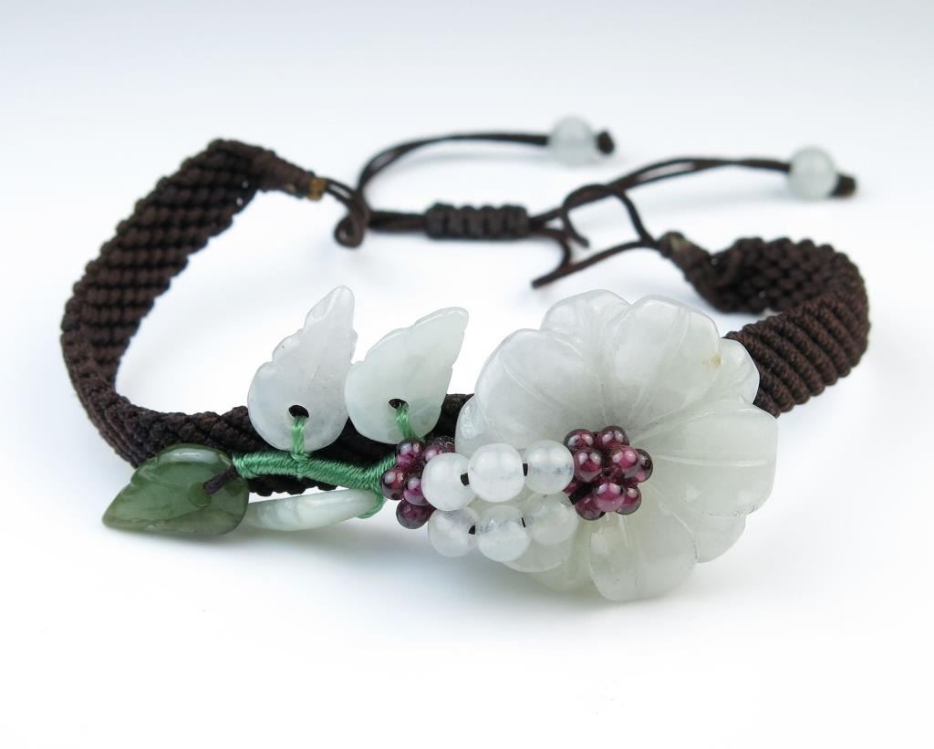 Artful flower design bracelet hand carved in white and green Jade with purple Garnet beads attached to woven drawstring bracelet. Retail $150.00 Estimate $75- $100