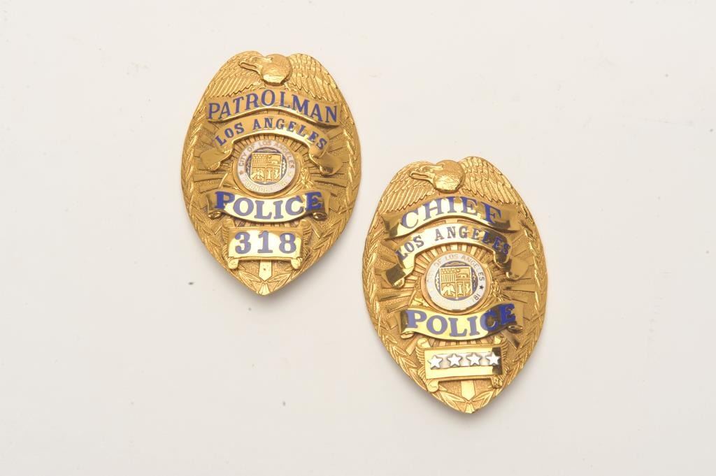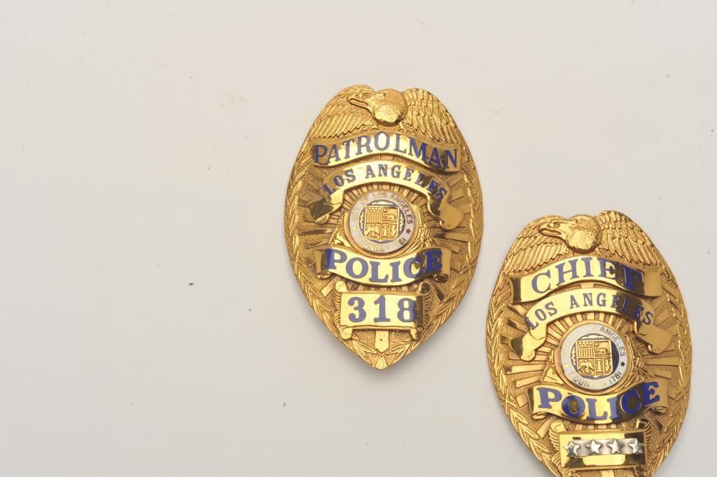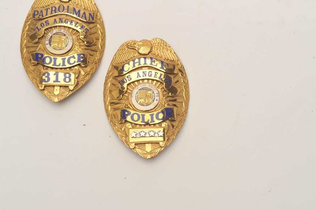 Lot of 2 badges including a Chief, Los Angeles Police (hallmark L.A. Stamp & Staty Co.) and a Los Angeles Police Patrolman (318/hallmark L.A. Stamp & Staty Co.). Est.: $150-$300.