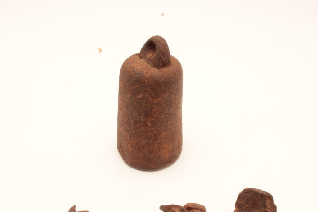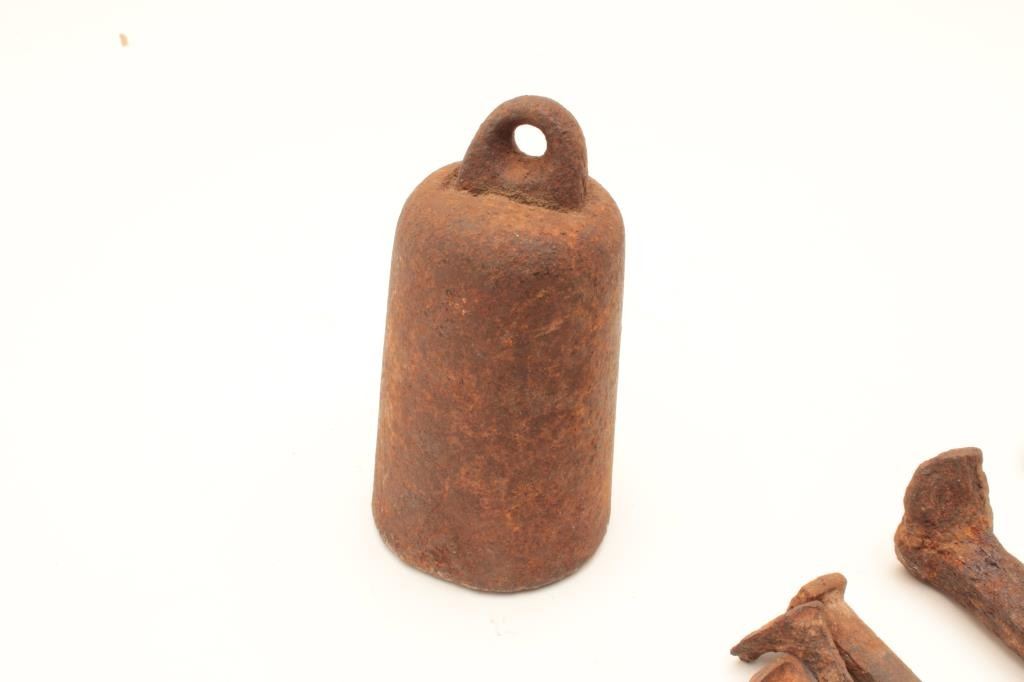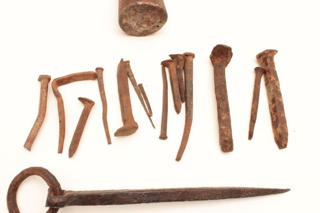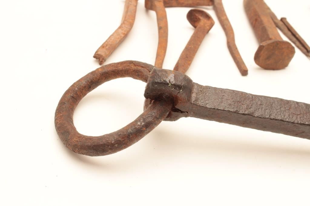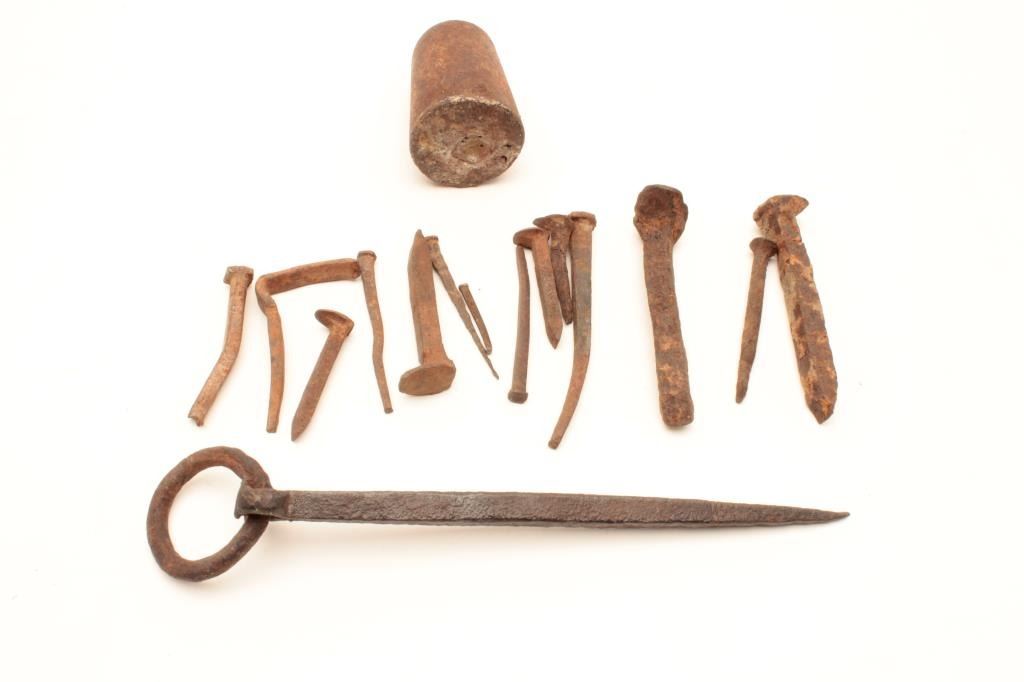 Rusty relic lot including various size iron spikes and nails, an iron picket pin and an iron “horse holder” weight. From the collection of John O. Beckwith. Est.: $125-$175.
