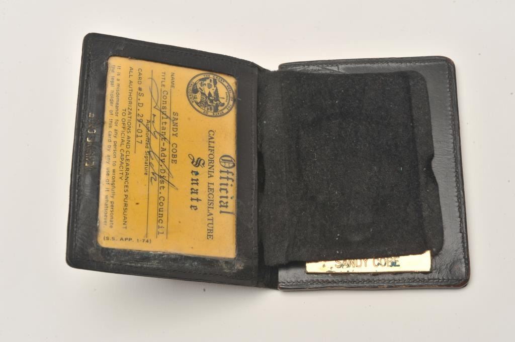 California Senate Advisory District Council (29th District) wallet badge and Senate ID plus basketweave leather wallet for the late Sandy Cobe. Est.: $150-$300.