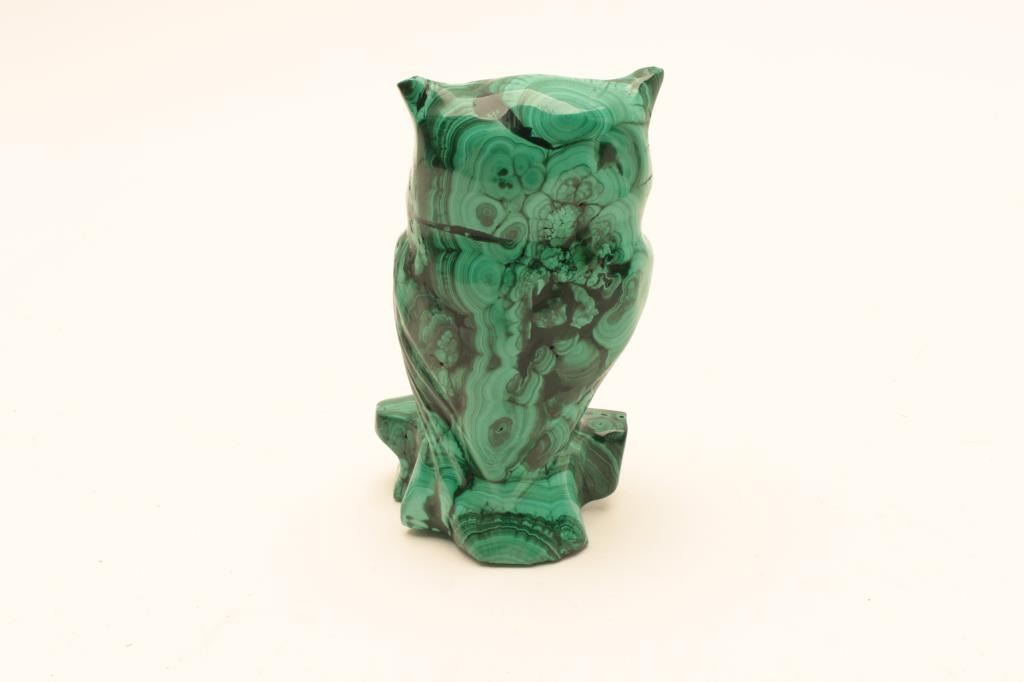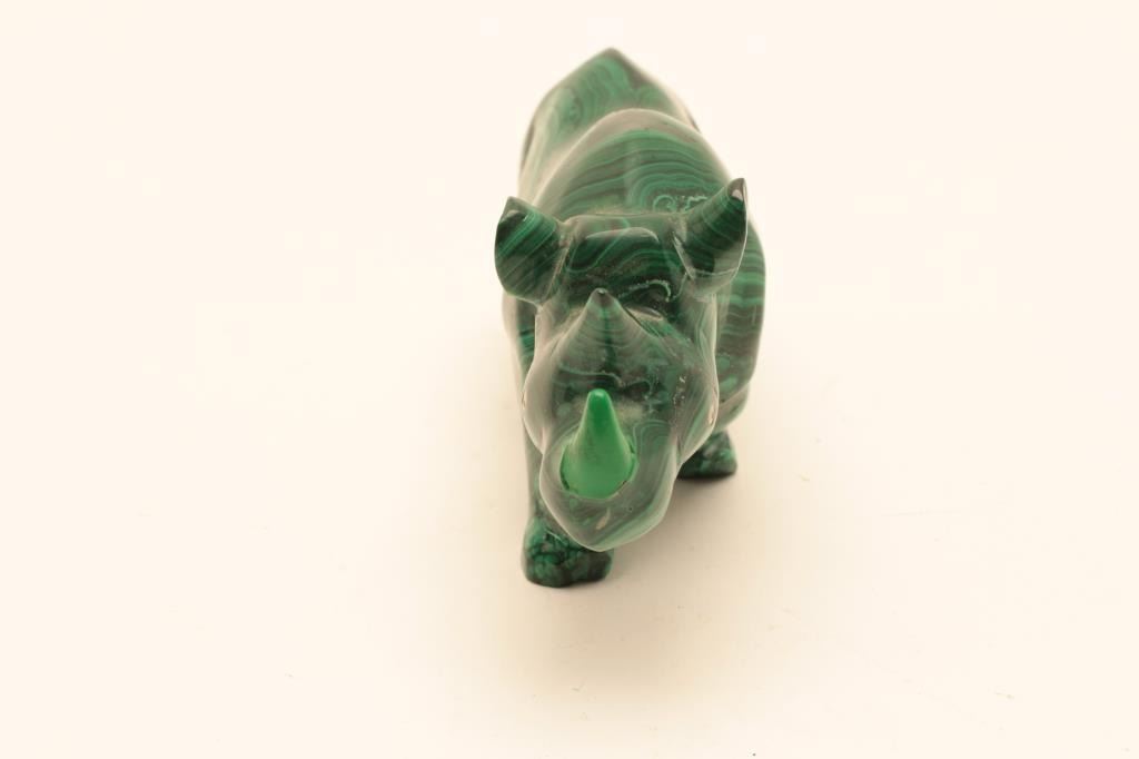 Lot of 3 Malachite figures as described; 1. Figure of rhino measuring approximately 3” x 6 ½” showing repairs to the horn and back left foot. 2. Figure of an owl measuring approximately 4 Lot Title ¼” x 2 ¾” showing chip to the ear. 3. Figure of elephant measuring approximately 2 ¼” x 4 ¼” in good condition. Est.: $100-$200