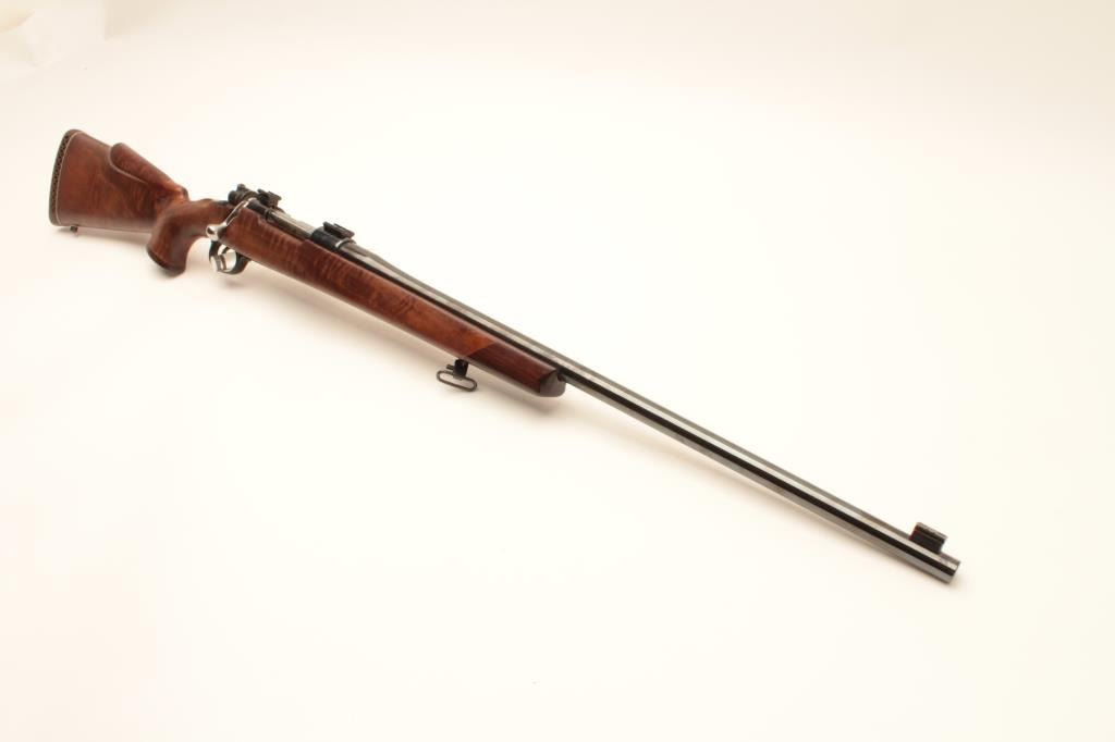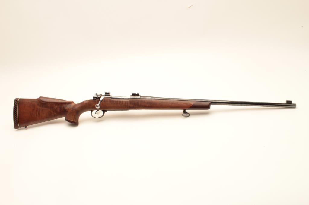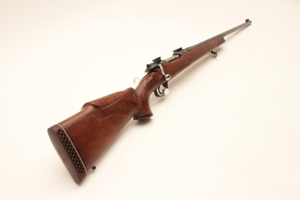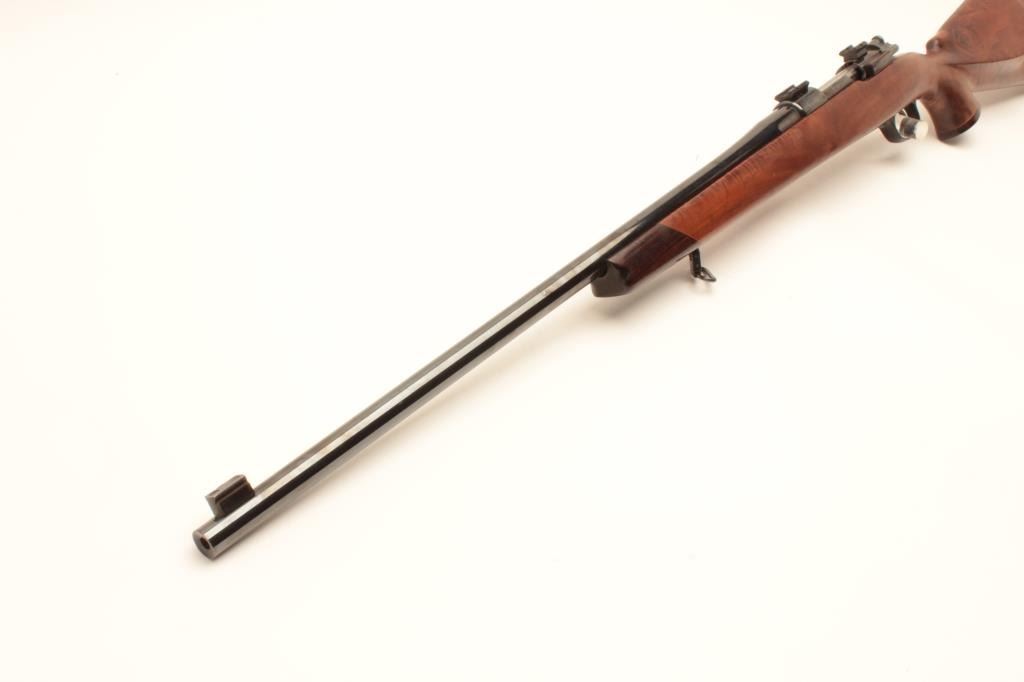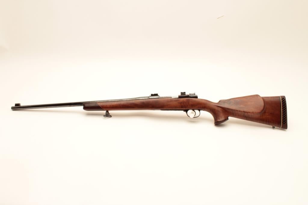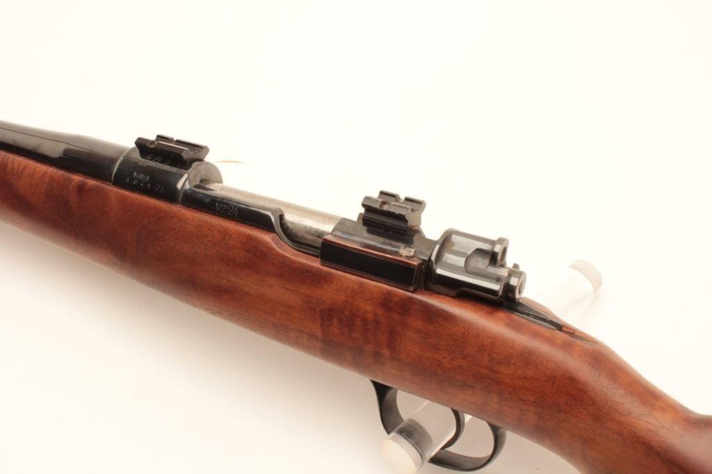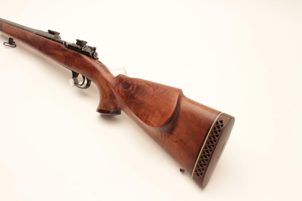 Custom VZ-24 Mauser bolt action rifle, approximately .30 caliber, Serial #8643Z2. The rifle is in very good overall condition with a 26” barrel with a front sight block. The barrel and receiver retain nearly all of Lot Title an old, quality re-blue. The bolt handle has been replaced, the bolt jeweled and Weaver scope bases added. The custom wood stock is in good condition with a rosewood cap and California roll-over cheek piece and pistol Lot Title grip. The butt stock shows beautiful fiddle back figure an ends with a ventilated rubber recoil pad. The bore is good, the action crisp and markings are sharp on this custom Czech Mauser. Est.: $250-$500. (Modern).
