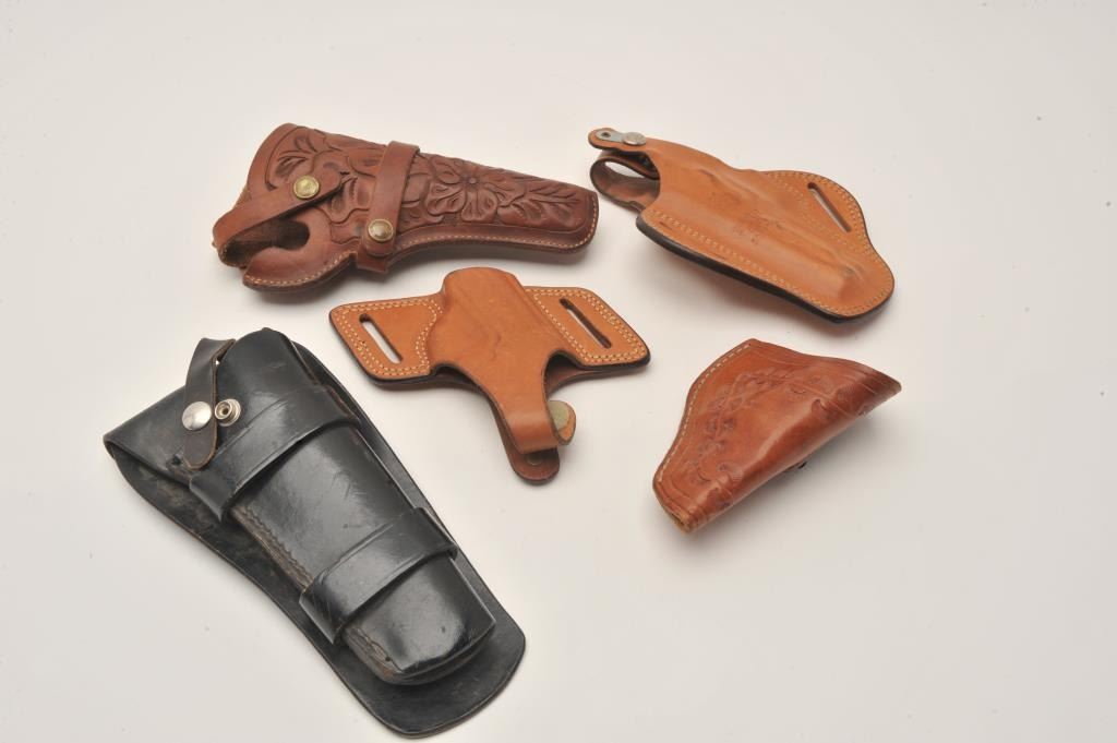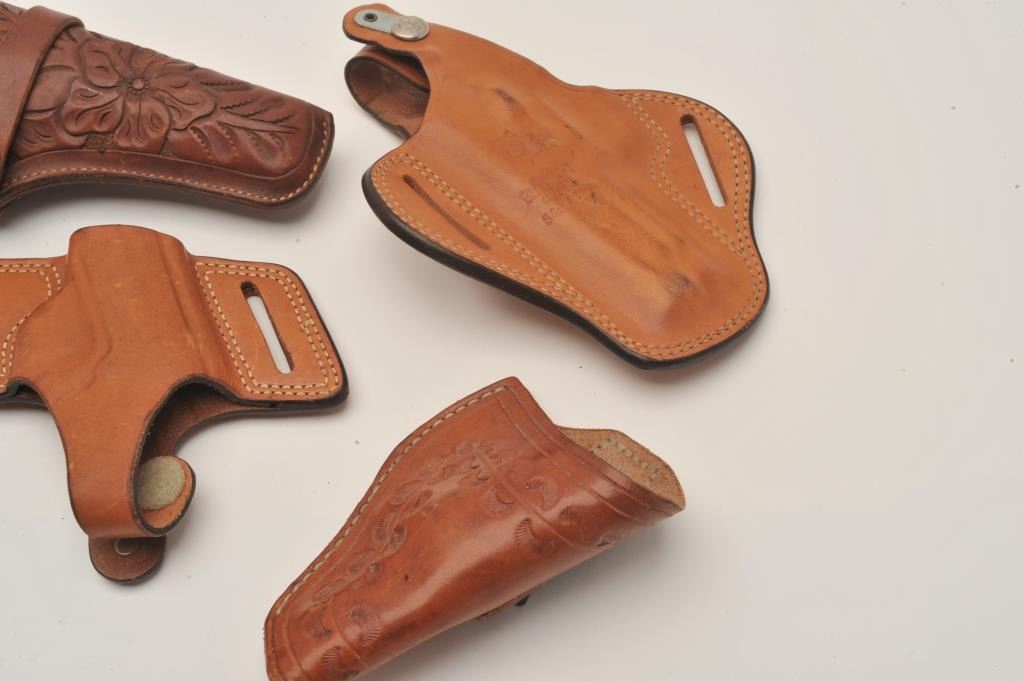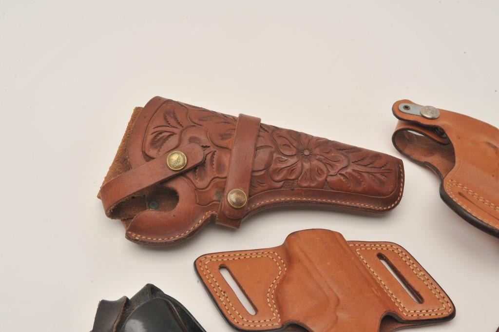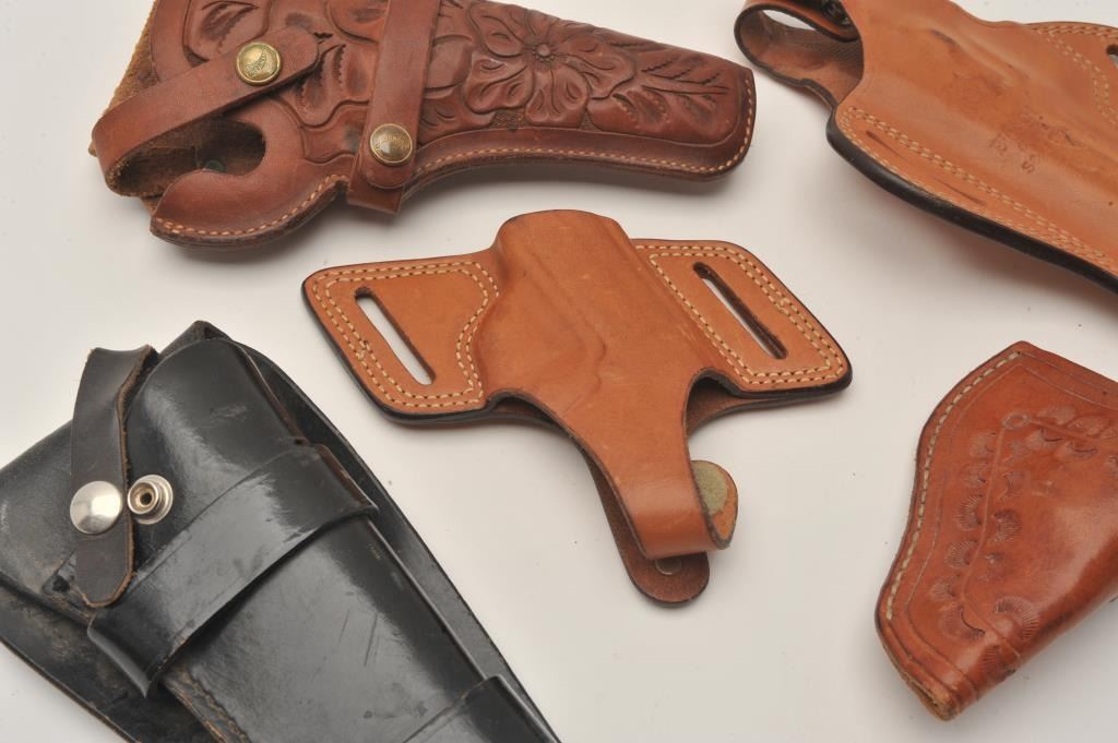 Bonanza lot of leather holsters including holsters by Hunter, Bianchi and Brauer Bros. of St. Louis. The lot includes five holsters, two of which are hand tooled leather. All are in good to very good Lot Title condition. Est.: $25-$50.
