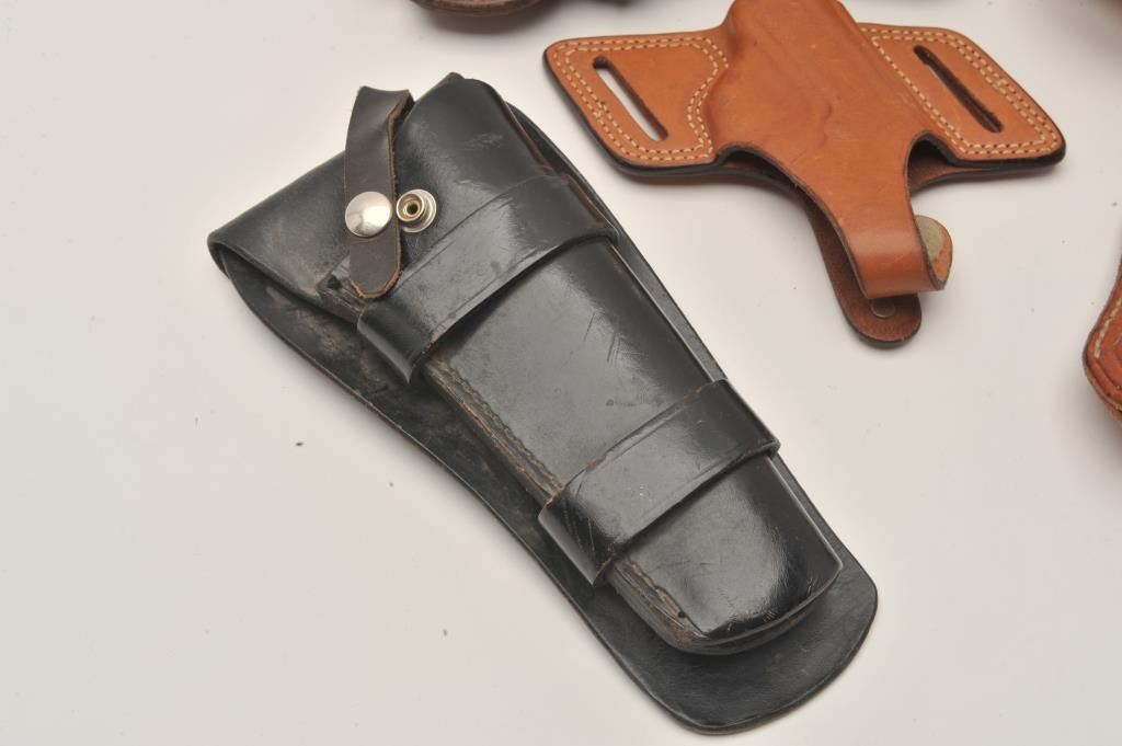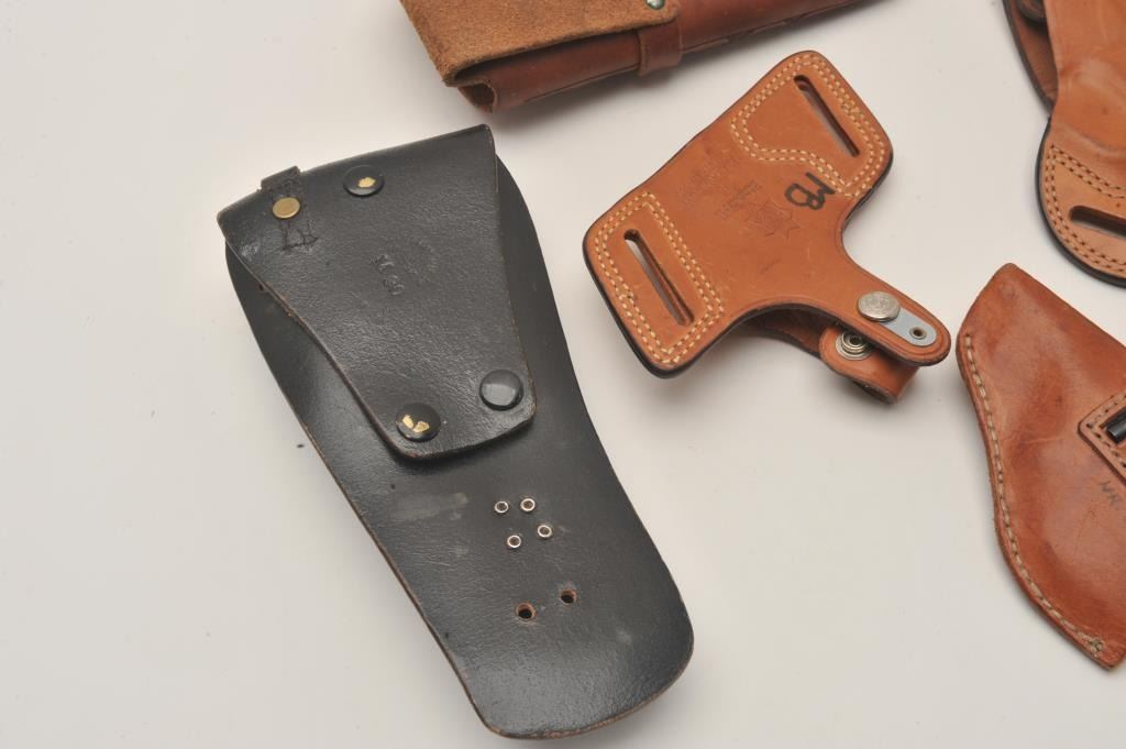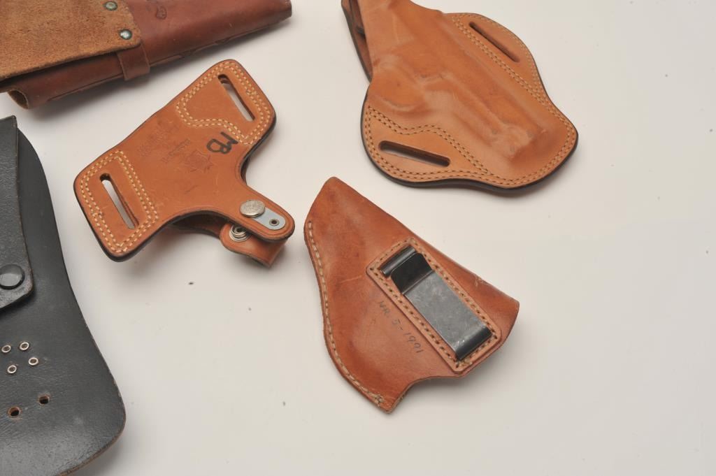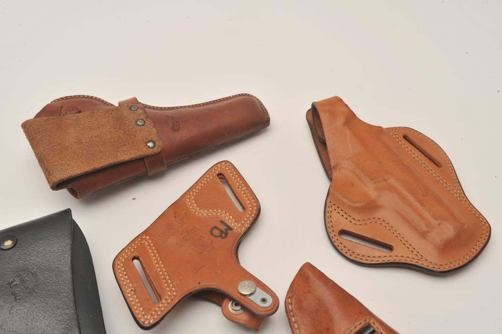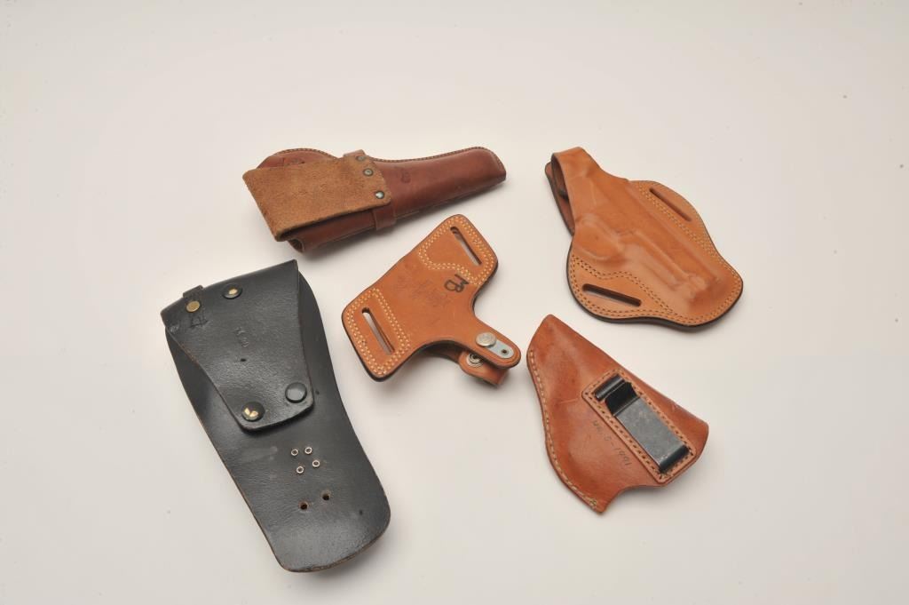 Bonanza lot of leather holsters including holsters by Hunter, Bianchi and Brauer Bros. of St. Louis. The lot includes five holsters, two of which are hand tooled leather. All are in good to very good Lot Title condition. Est.: $25-$50.