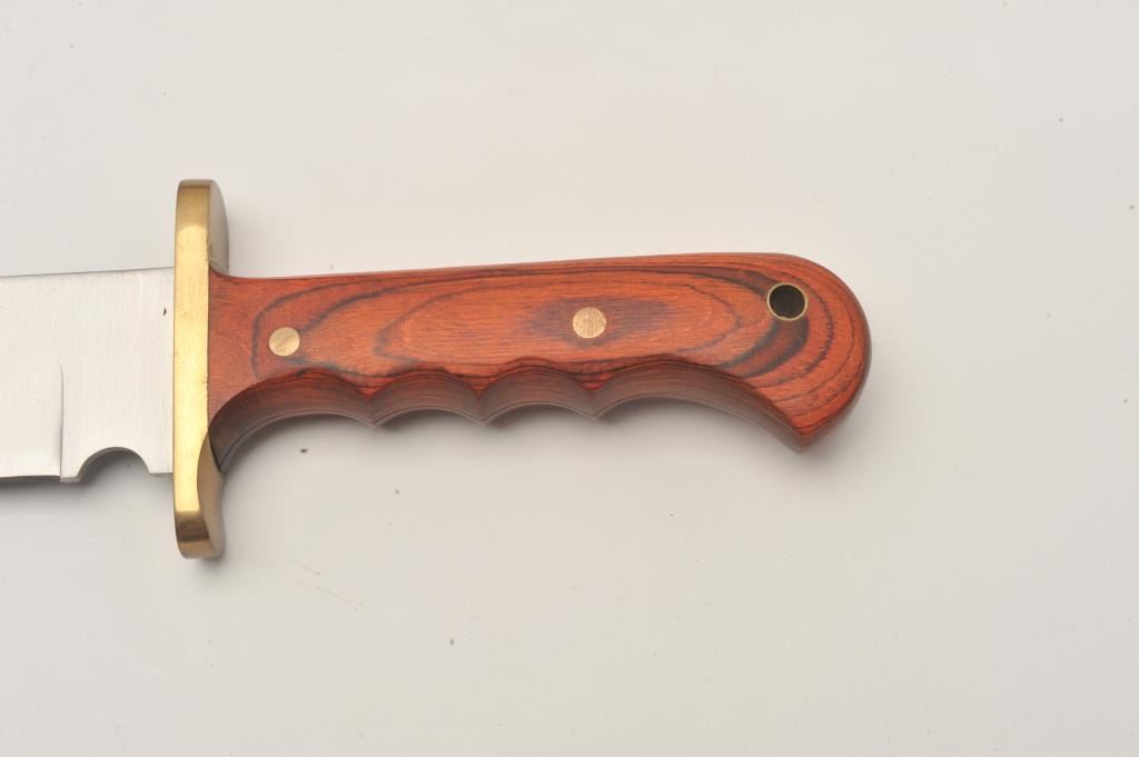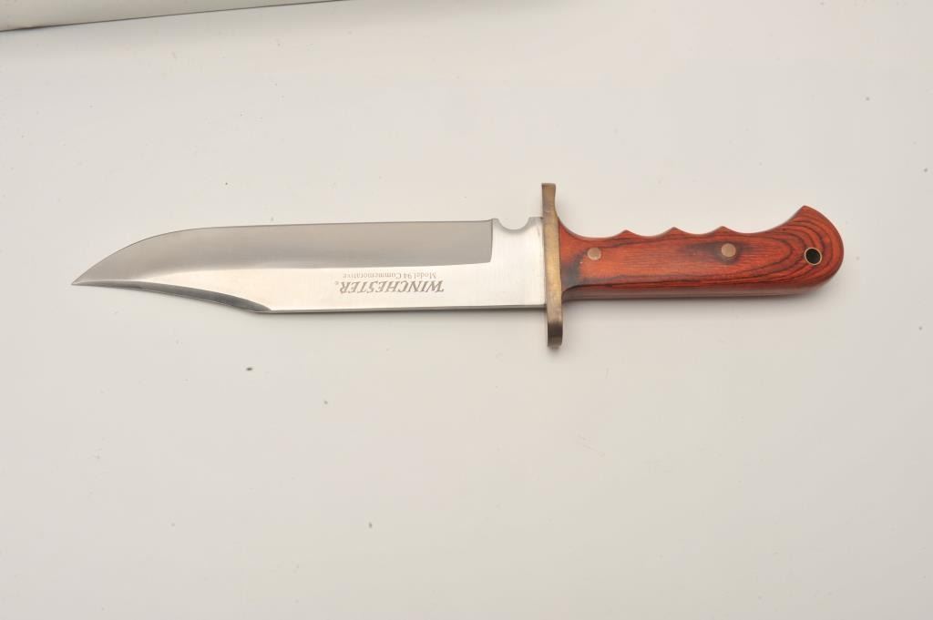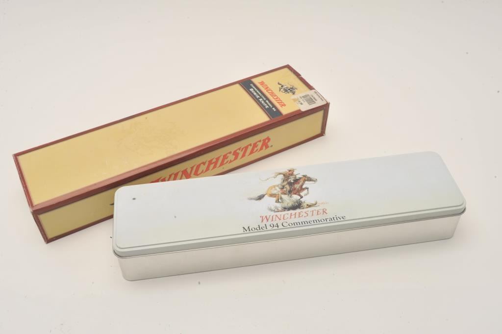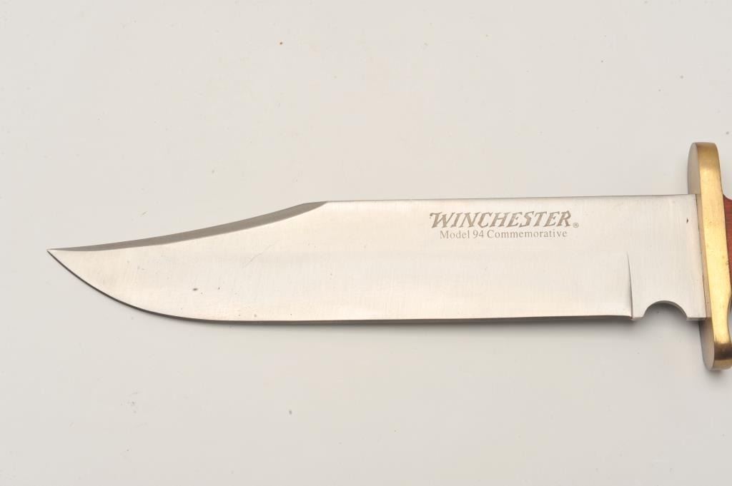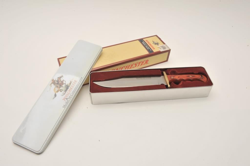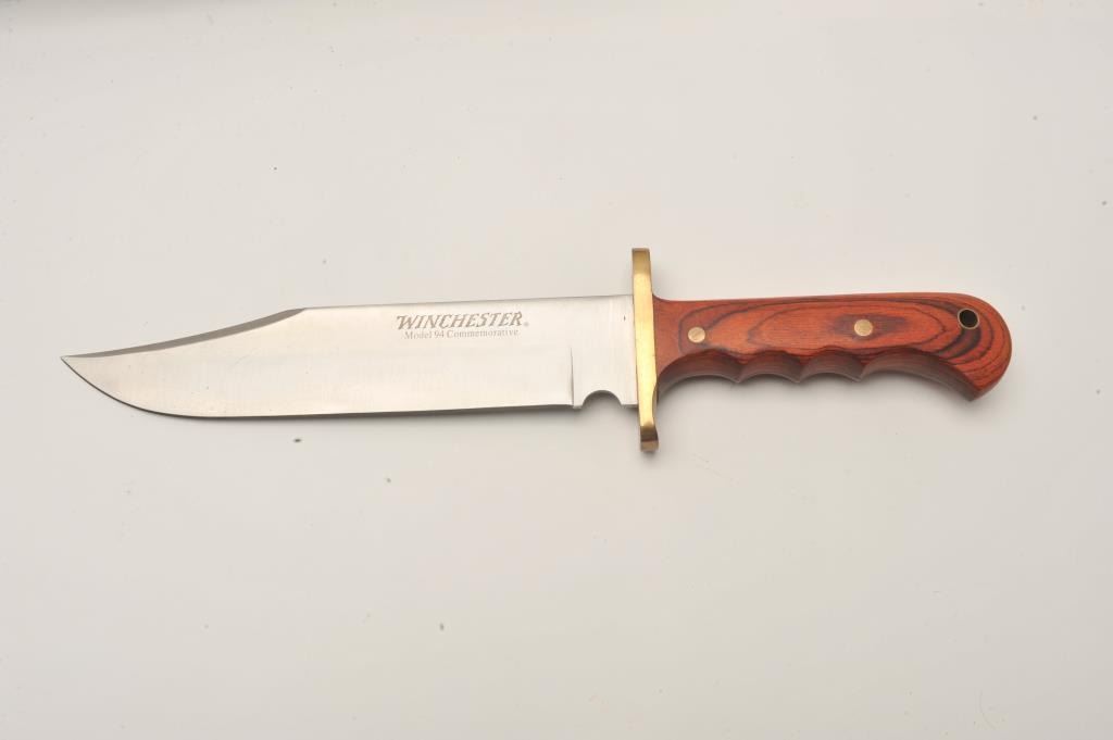 Winchester Model 94 Commemorative bowie knife in aluminum factory tin. The knife is as new in the box with an 8 ¾” blade and an overall length of 14”. The blade is marked Winchester and appears to be unsharpened. Lot Title The knife features a brass handguard and laminate wood scales with two brass pins. Est.: $50-$100.