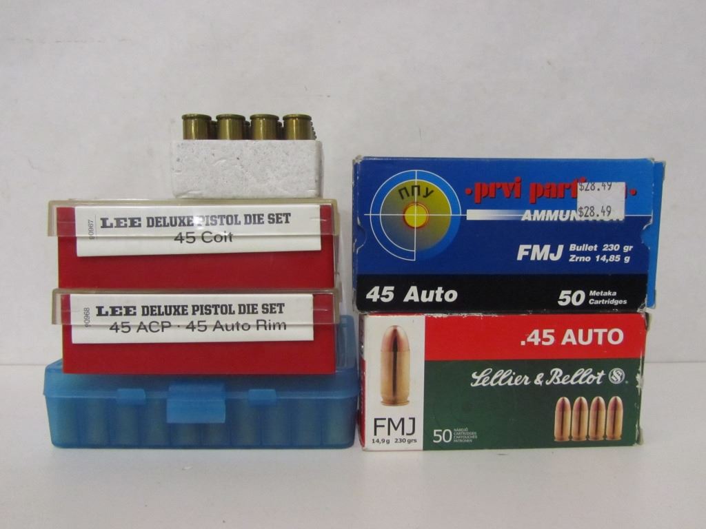 ONE BOX PARTIZAN 50ROUNDS 45AUTO BRASS, ONE BOX SELLIER & BELLOT 50 ROUNDS 45AUTO BRASS, 25 PIECES 45COLT BRASS, 34 PIECES 45AUTO BRASS, LEE DELUXE PISTOL DIE SET 45ACP/45AUTORIM, LEE DELUXE PISTOL DIE SET