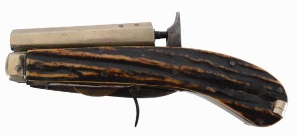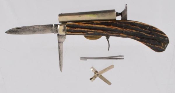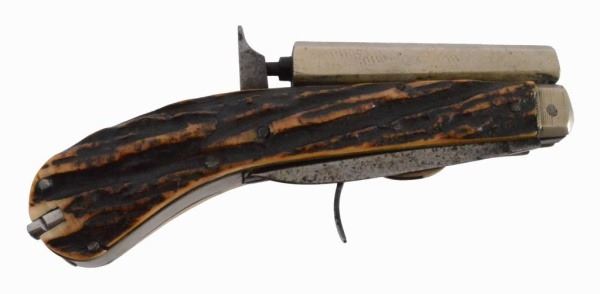 Gun has correct bullet mold and tweezers. Also has a trap in butt for bullets. Percussion model with two blades. Both marked.