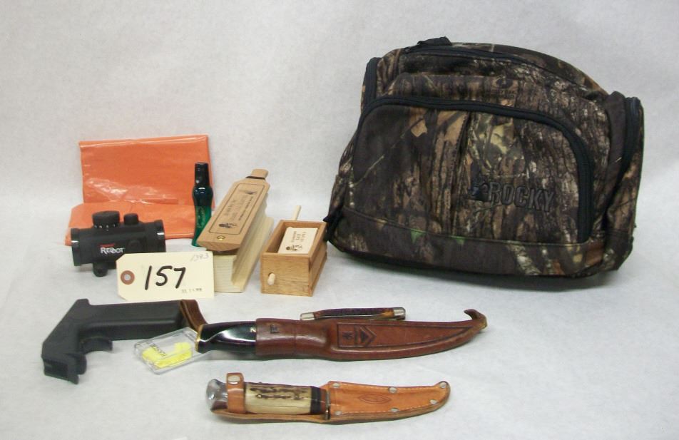 CAMO ROCKY TURKEY FANNY PACK, NORMARK HUNTING KNIFE, GERMAN HUNTING KNIFE, SHRADE POCKET KNIFE, 2 TURKEY BOX CALLS, TASCO RED DOT THAT WORKS, DIAPHRAM TURKEY CALL, CROW CALL, SPRAY PAINT TRIGGER HANDLE.