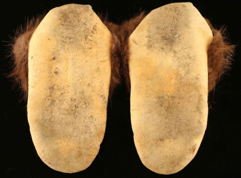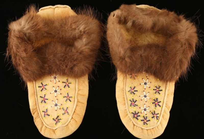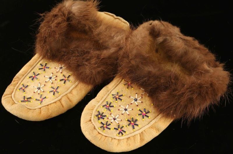 Circa 1962 floral beaded design on tanned leather with fur trim. Measures 12" long