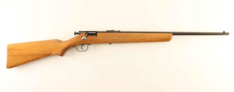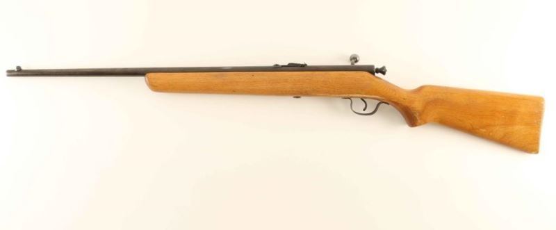 American made bolt action single shot rifle chambered for .22 Short, Long or Long Rifle, manufactured pre-1968. Features a blued finish, 24" barrel, dovetailed blade front sight with bead top, adjustable rear sporting sight, smooth trigger, large manual cocking knob and smooth pistol grip shoulder stock without buttplate. Rifle exhibits a brown patina with a small amount of scattered surface rust. Action is sound, bore is excellent and the wood stock is good. Condition is near NRA Good. ***C&R Firearm***