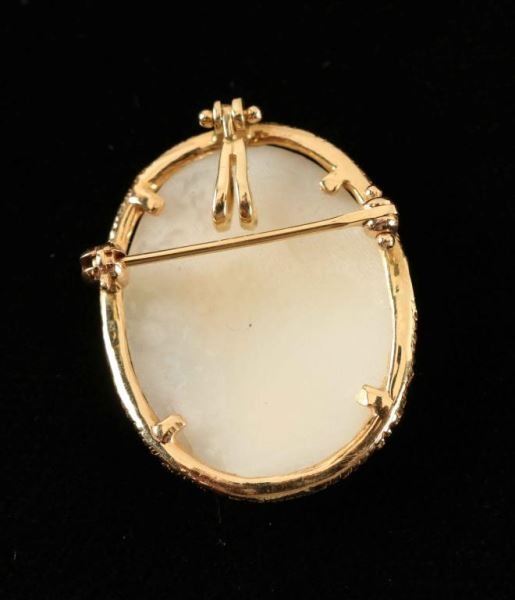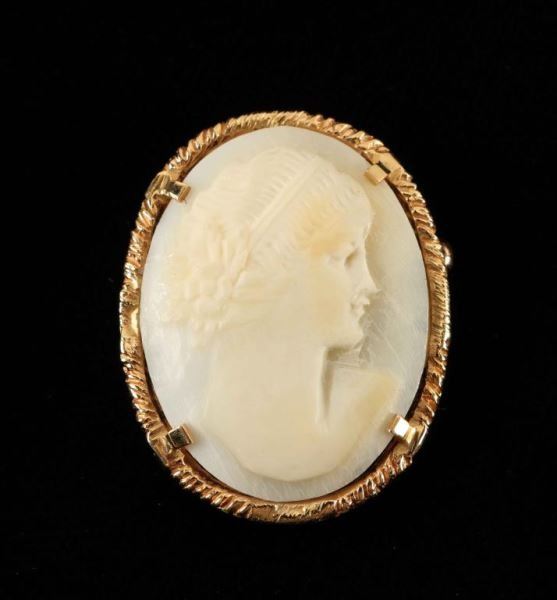 Pretty 1" cameo set in gold that can be used as a pin or pendant for a necklace. Round wire border frame secured by four prongs. Includes appraisal.