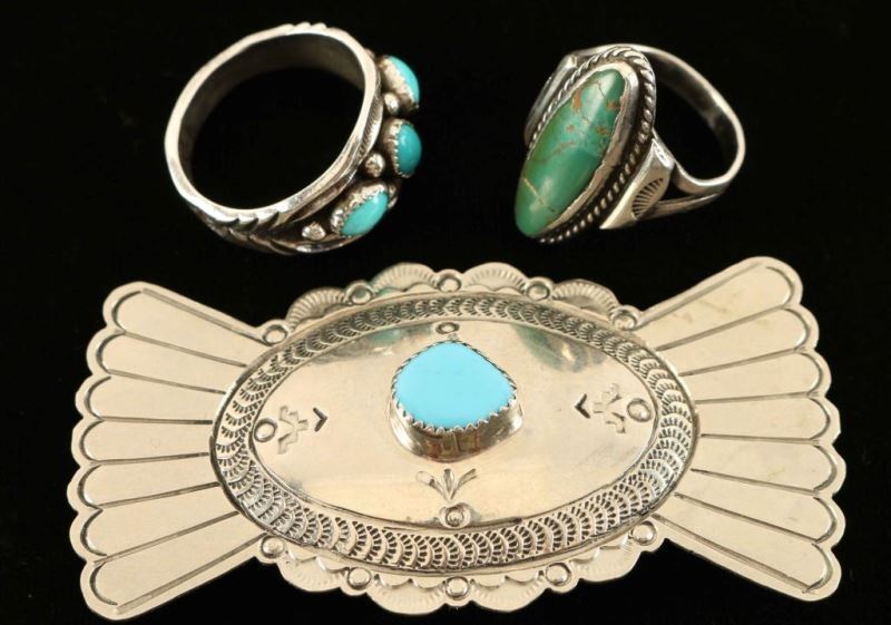 Including; silver butterfly pin with single turquoise stone and stamped traditional designs, sterling ring with three turquoise stones and scallop design marked 'Sterling' size 12, and ring with oval of green turquoise with crack at top surrounded by silver rope design size 8.